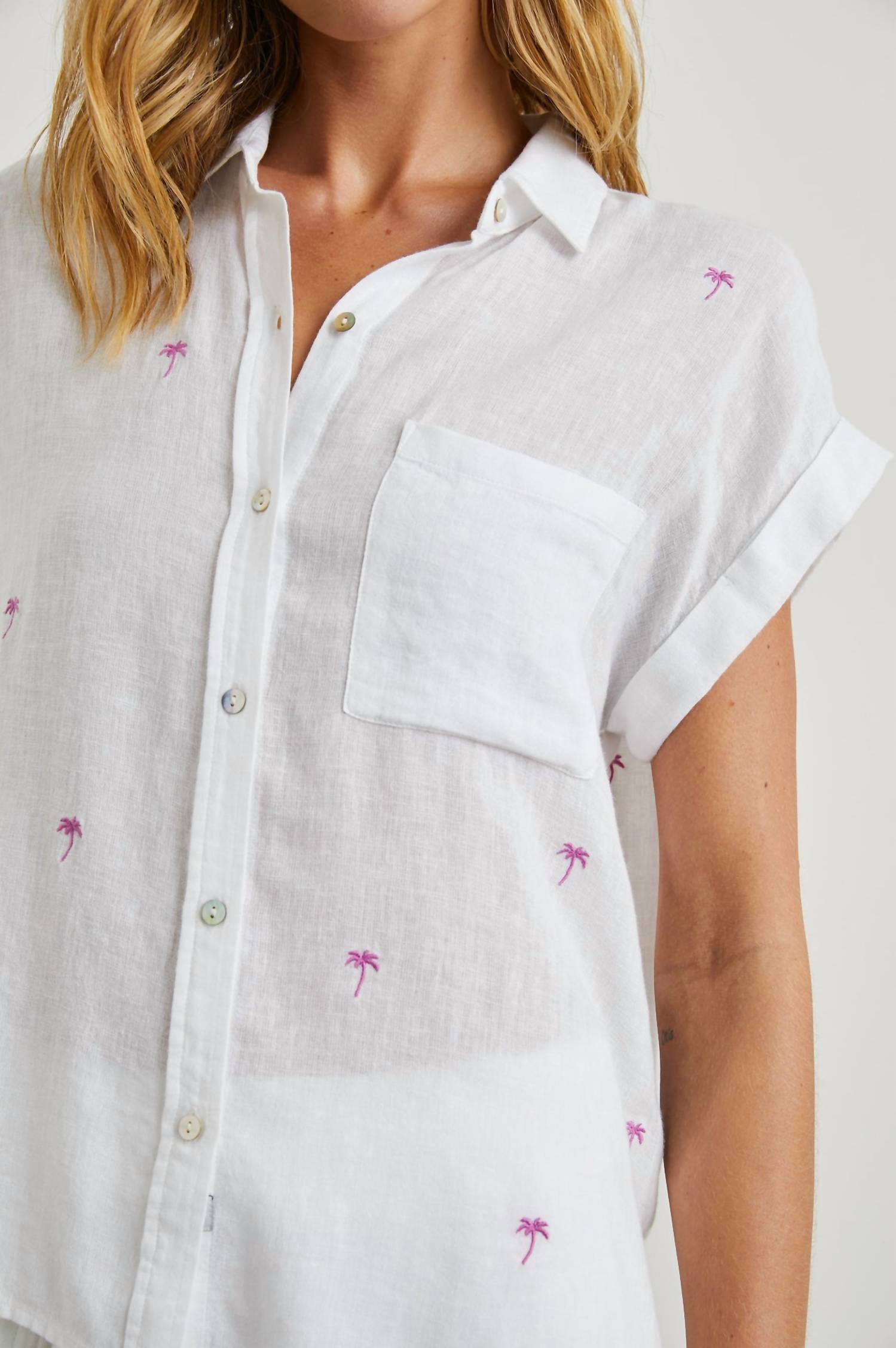 This button down shirt is comfortable yet polished. This season, make a statement in the Rails Whitney Shirt, expertly designed in a Fuchsia Embroidered Palms motif. Featuring short sleeves and crafted from a breathable 55% Linen | 45% Rayon blend, this button-down shirt is perfect for boho chic holiday parties. With a classic collar and convenient pockets, it offers both style and functionality. Closure: Button closure.