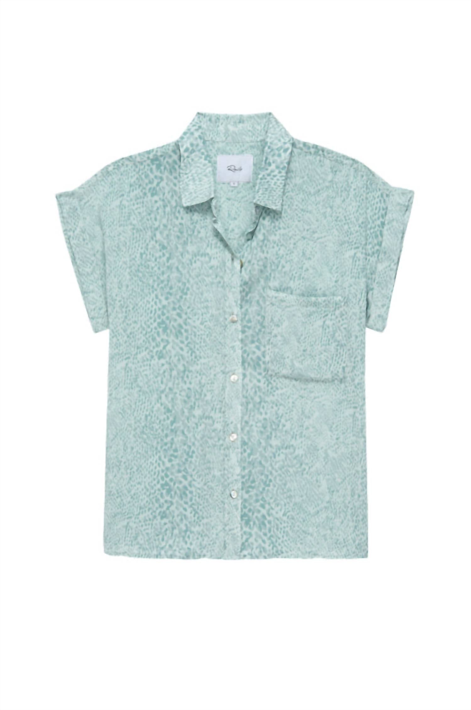 This button down shirt is comfortable yet polished. Elevate your wardrobe with the Whitney Shirt by Rails, tailored for an effortless summer style. This short sleeve, mint boa button-down shirt blends a chic animal pattern with a comfortable 100% Rayon fabric. Designed with a practical button closure and a garment length of 25 inches, it also features a handy pocket for added utility. Care instructions recommend hand washing and line drying to maintain its pristine condition.