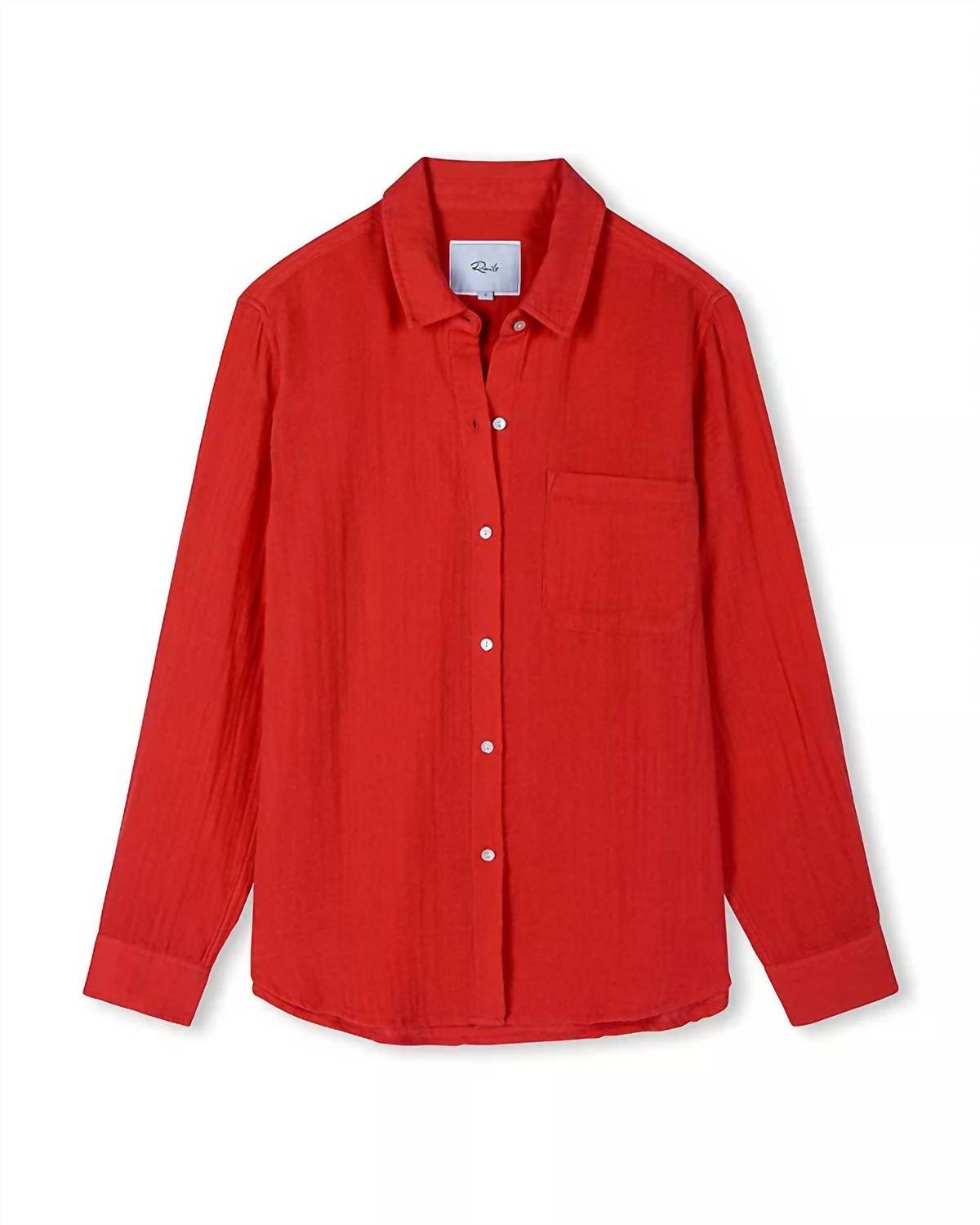 Perfectly tailored and soft to the touch. Elevate your vacation wardrobe with the Women's Ellis Shirt by Rails, a standout piece in a vibrant cherry hue. This long sleeve button-down shirt, with its textured pattern and collared neckline, offers a perfect blend of style and comfort. Crafted from cotton, it measures 27.5 inches in length and features a practical button closure, complete with pockets for added functionality. For care, simply hand wash to maintain its maximalist charm.