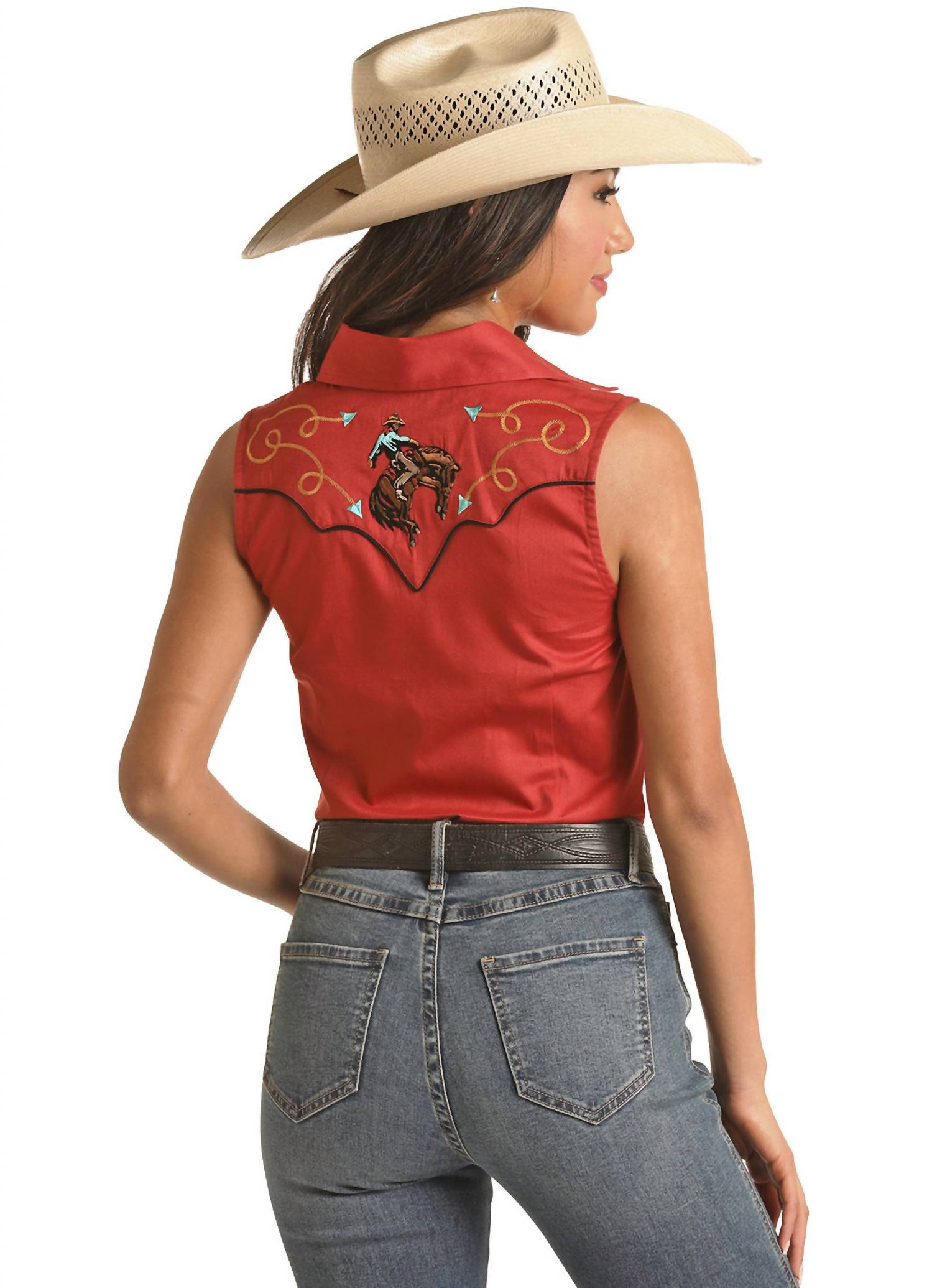 A classic button down shirt that will never go out of style. Elevate your western wardrobe with the Sleeveless Snap Front Western Shirt by Rock & Roll Denim, perfect for a Thanksgiving holiday party. Crafted from 100% cotton, this red shirt showcases a striking embroidered design on the front and back yoke area. Its classic collar complements the black pearl snap closure, adding a touch of elegance to its western-inspired look. Embrace the season with this patterned piece that blends traditional style with modern flair.