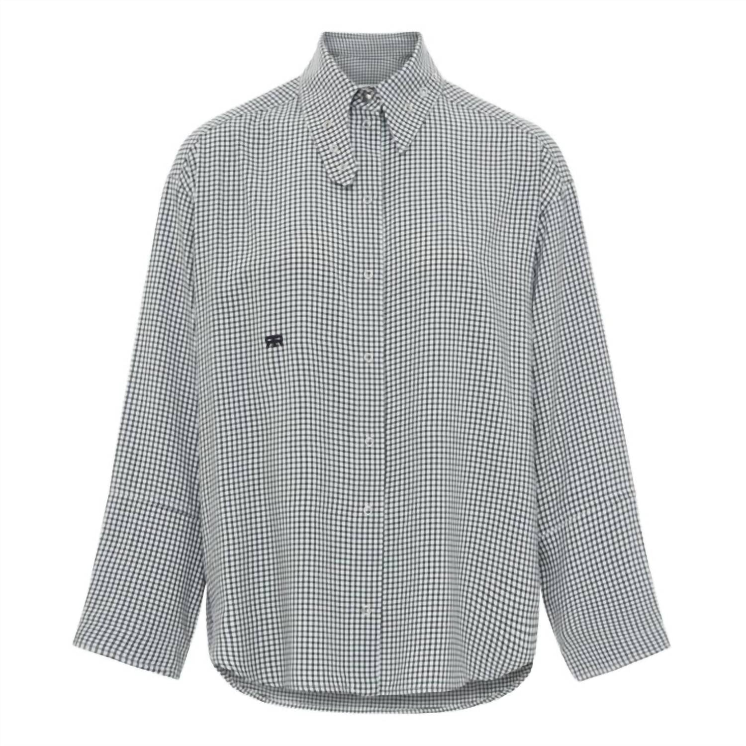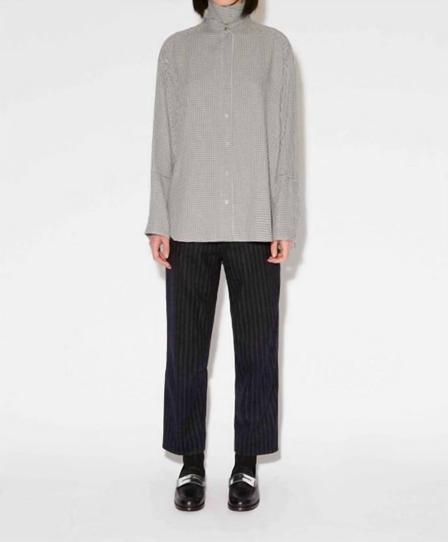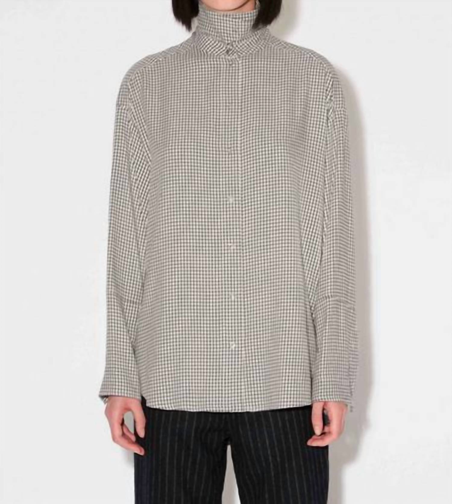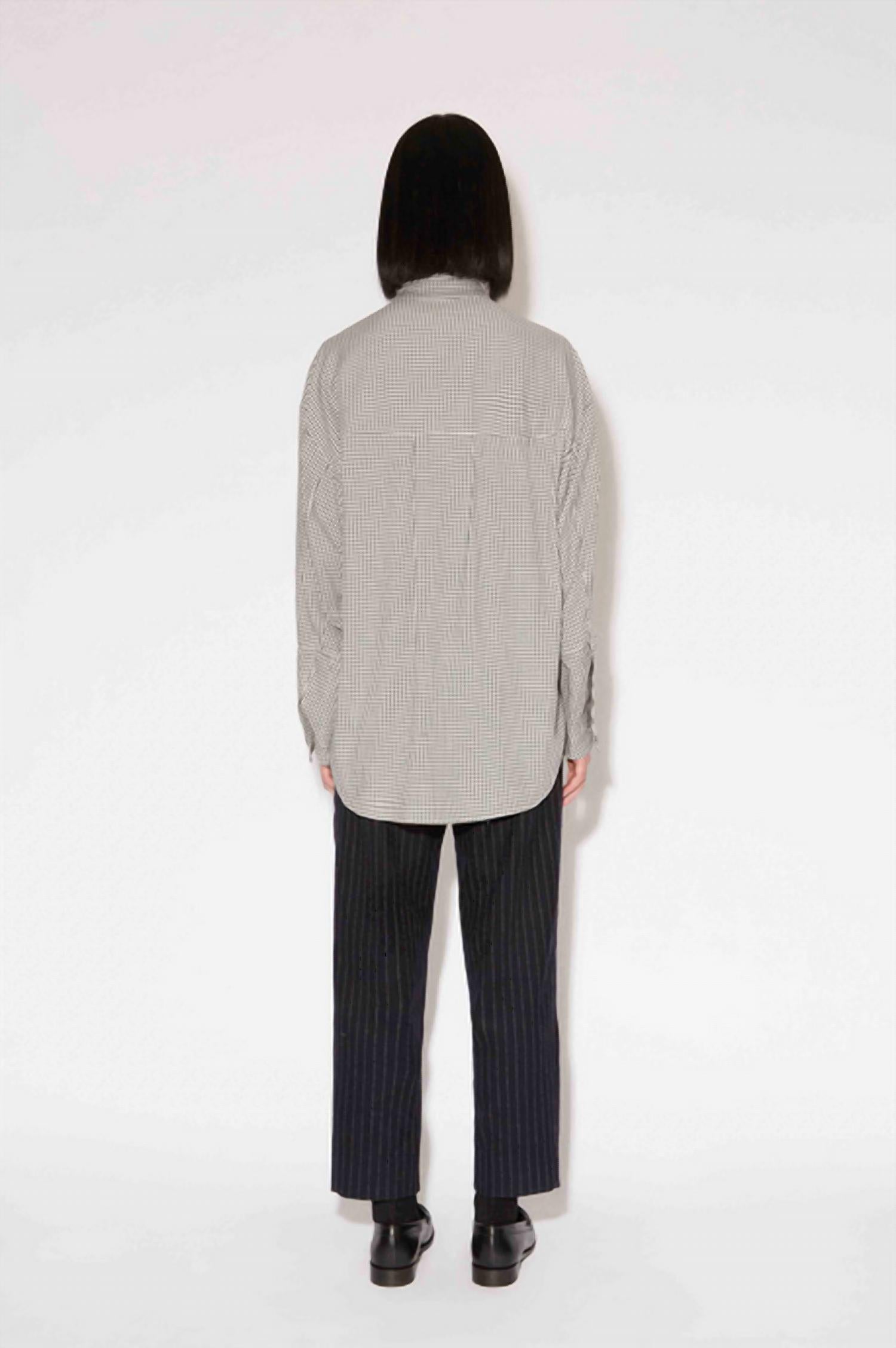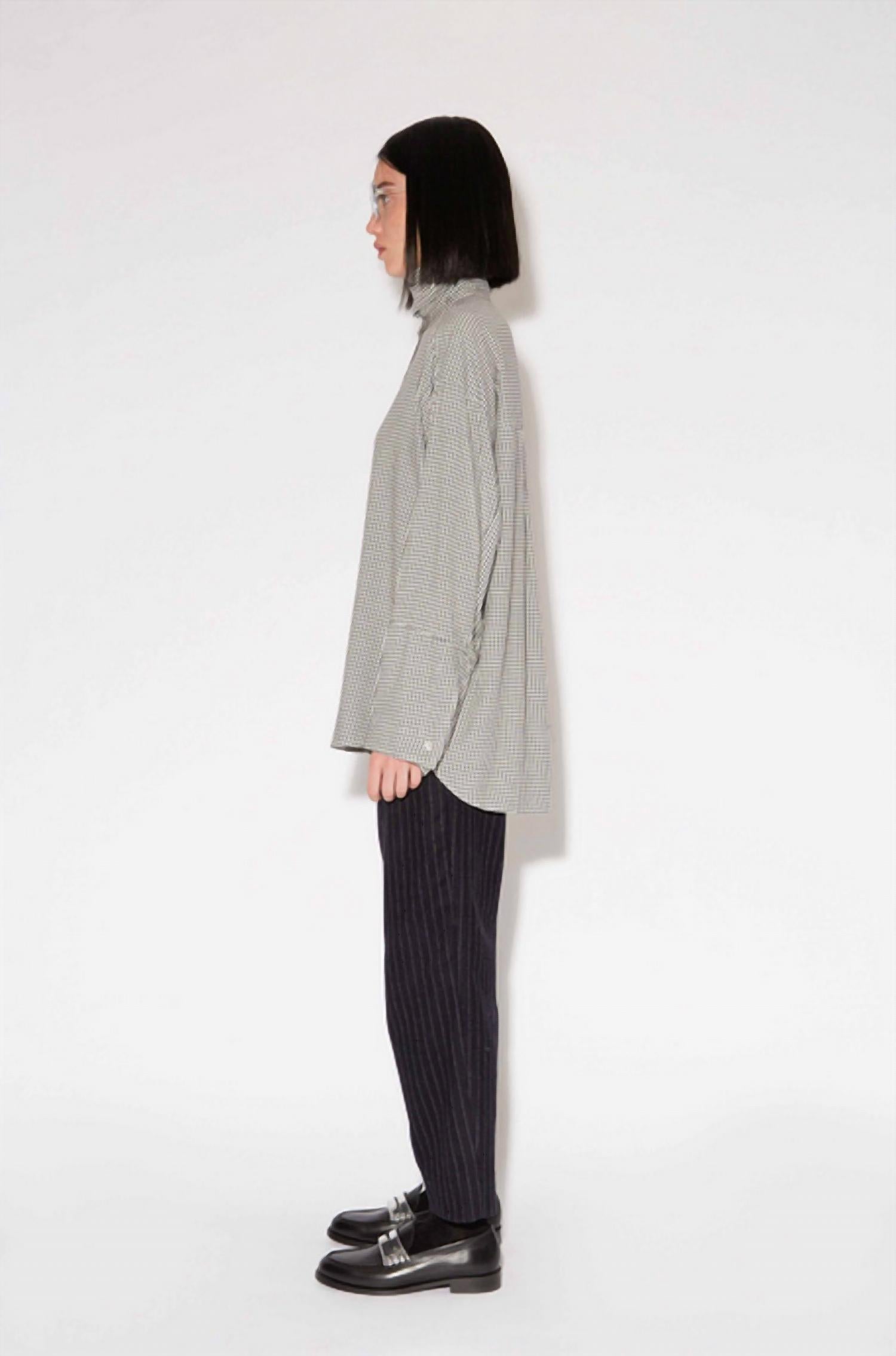 Presenting the Ally Sassy Shirt by ROSEANNA, a stylish choice for your wardrobe in a timeless Vichy pattern. This long sleeve button-down shirt features a high collar accentuated with an integrated chin strap secured by metal press studs. Made from 100% Viscose, it offers a straight, loose fit while ensuring comfort and elegance. Crafted in France, it’s easy to care for with machine wash and line dry instructions. Perfect for travel during the fall, it aligns seamlessly with the monochrome trend.