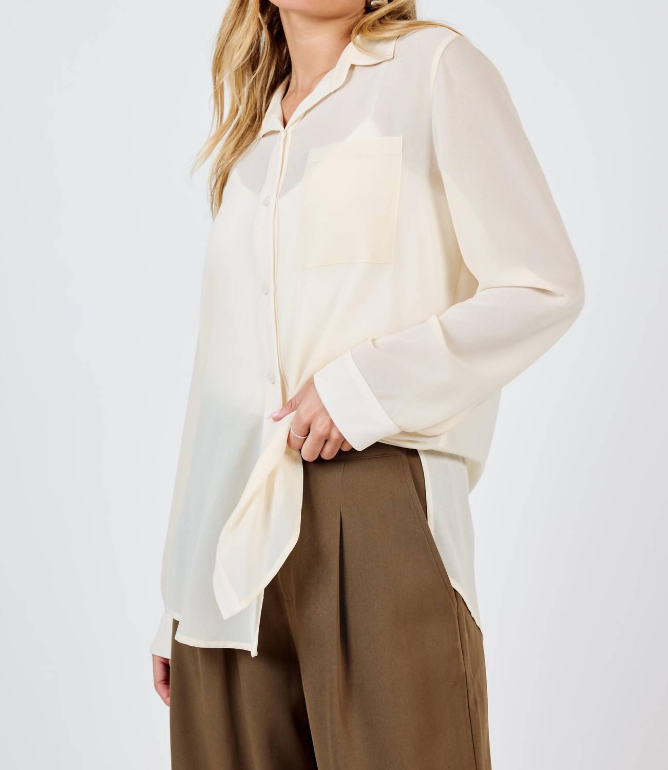 This button down shirt is comfortable yet polished. Elevate your wardrobe with the Sadie & Sage All Invited Button Up Shirt, crafted for stylish simplicity in elegant ivory. This long sleeve shirt is made from lightweight polyester and features a solid pattern with a practical button closure. Designed for versatility, it includes pockets for added functionality. Perfect for spring holiday parties, this minimalist piece can be layered over a cami for a chic look.