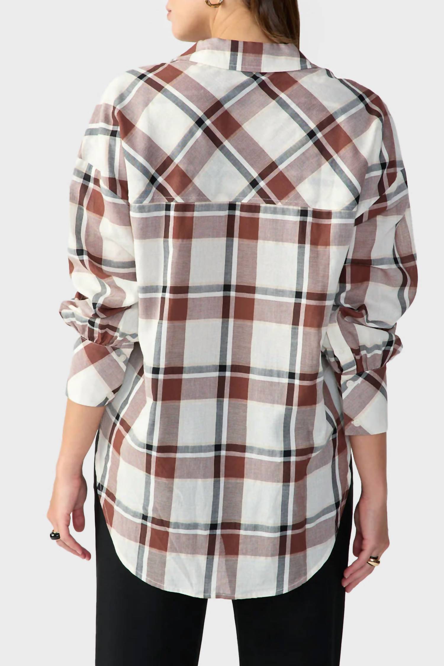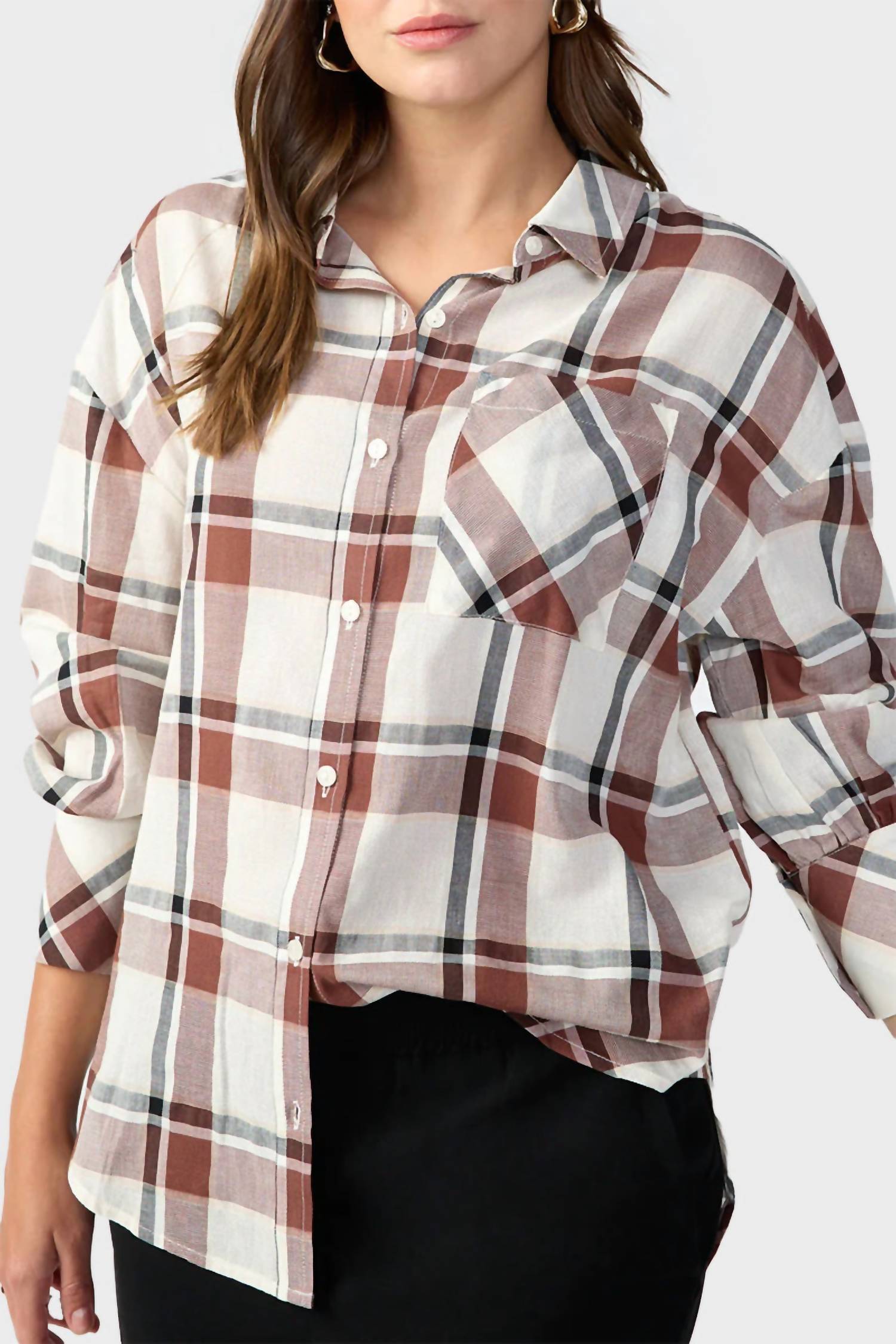This button down shirt is comfortable yet polished. Introducing the Sanctuary Dropped Shoulder Tunic in Caramel Cafe Plaid, perfect for a stylish yet comfortable holiday party look. Crafted from 100% sustainably sourced cotton, this tunic features long drop-shoulder sleeves and a relaxed fit, complemented by a handy chest pocket. With a center front button closure, it measures 30" in length for a size small. Care instructions include a delicate wash cycle and laying flat to dry. Model is 5'9" wearing a size S.