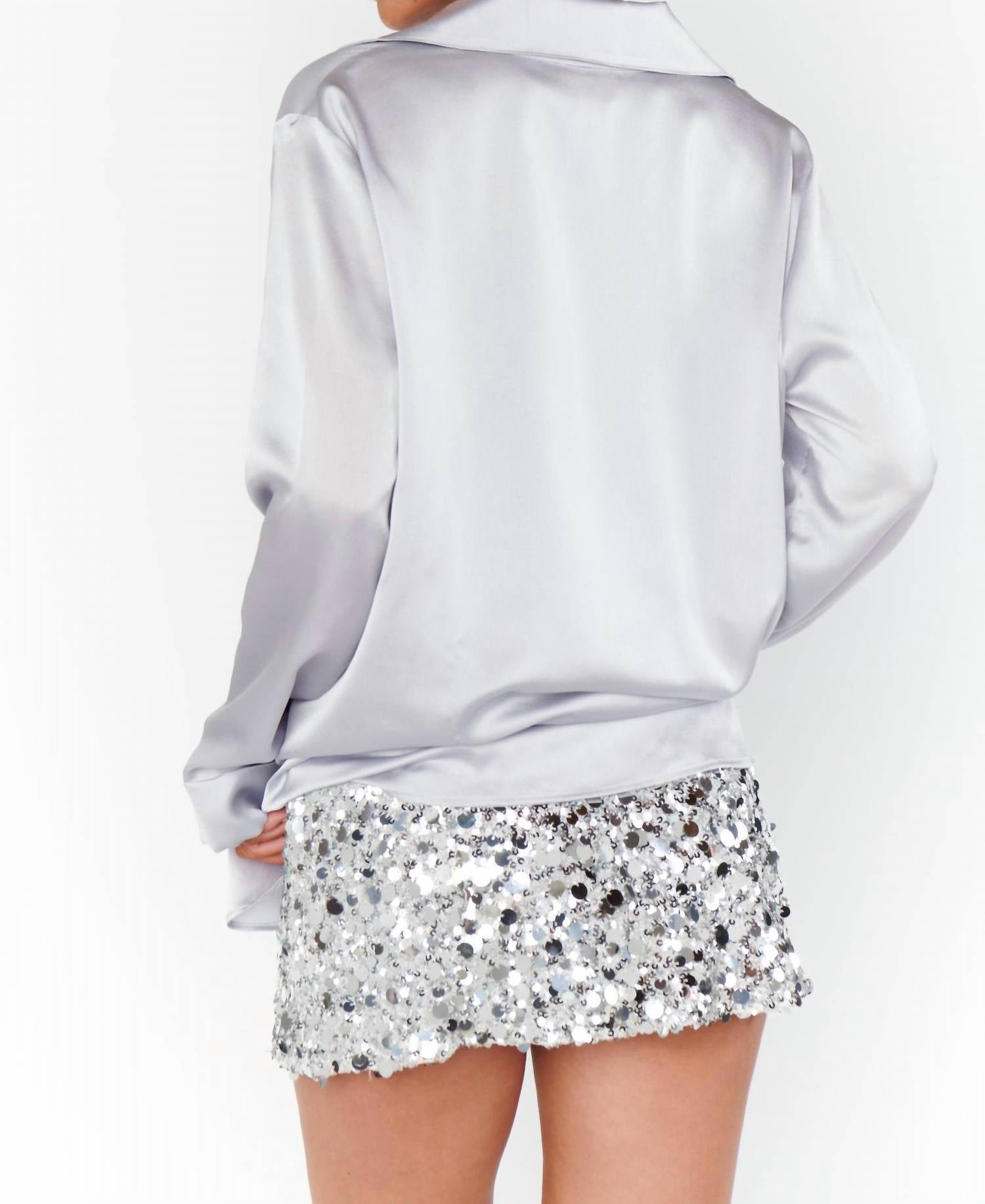 This button down shirt is comfortable yet polished. Elevate your party wardrobe with the Smith Button Down Shirt by Show Me Your Mumu, a modern take on a classic silhouette in sleek silver. Featuring long sleeves and a collar, this shirt is crafted from 100% polyester, offering a luxe satin finish for a sophisticated look. Closure: Button closure. Care: Hand wash and lay flat to dry, ensuring the vibrant fabric remains pristine for your next holiday gathering.