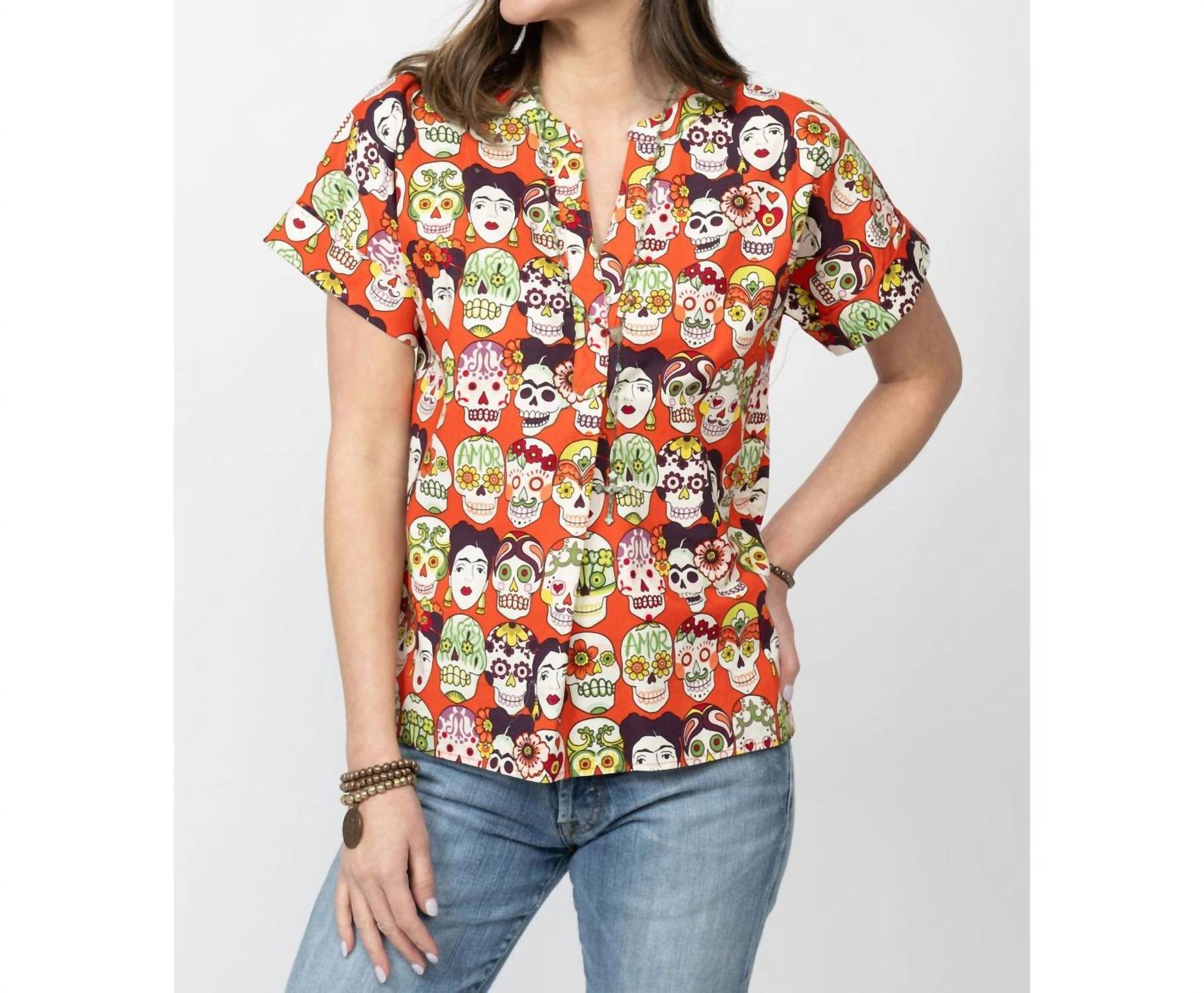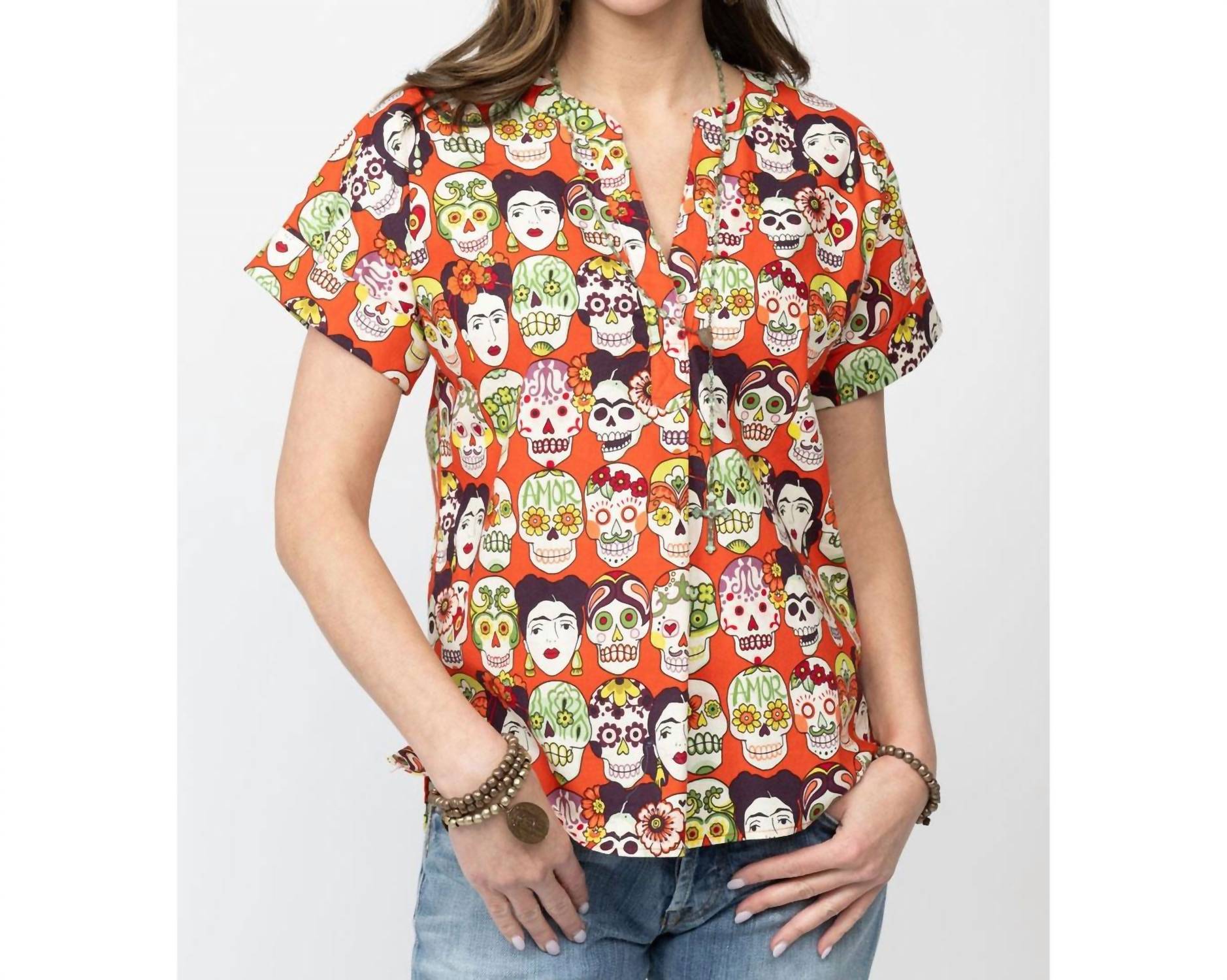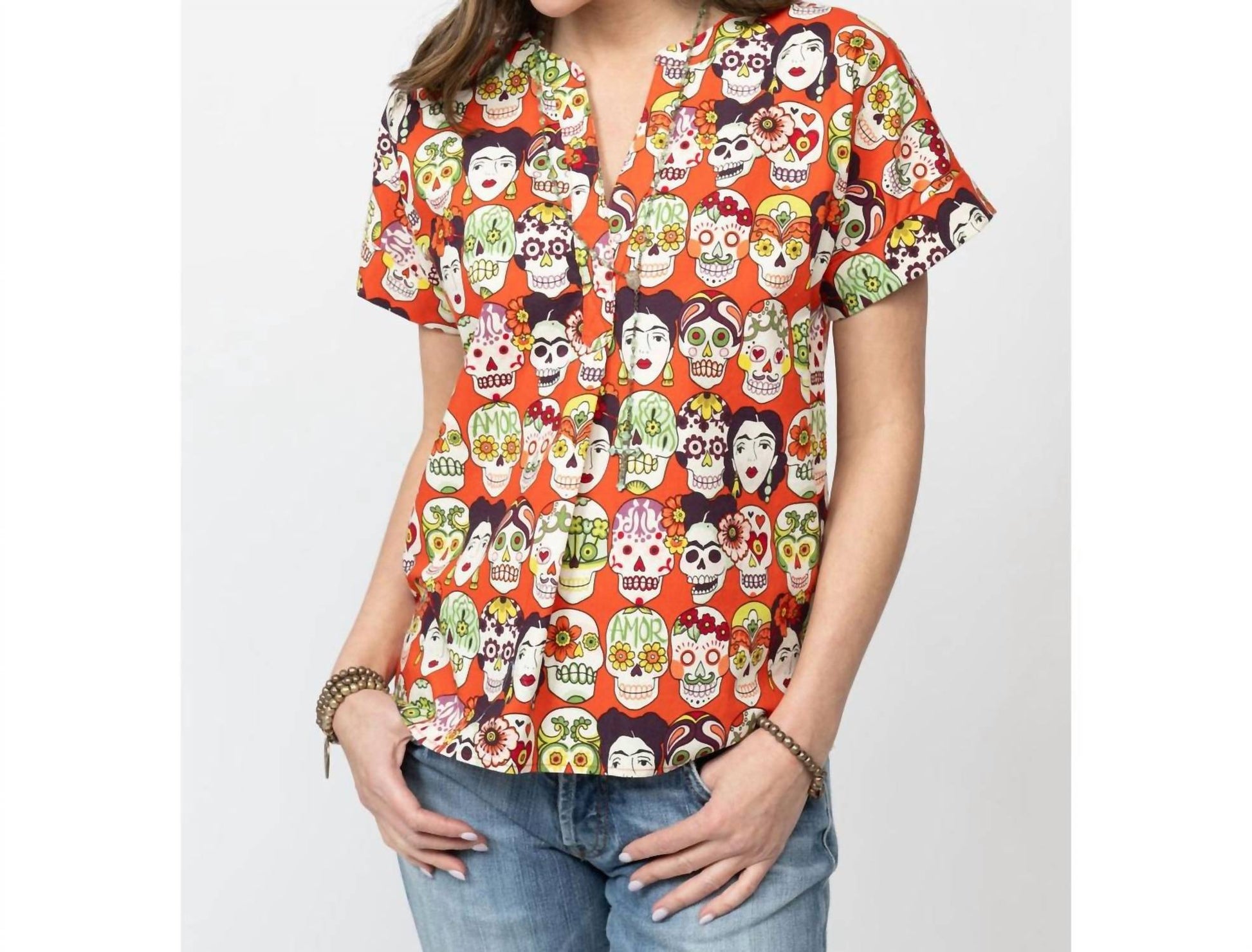 Perfectly tailored and soft to the touch. Another super cute patterned top by Sister Mary, this one pays homage to the Mexican 'day of the dead' with skulls and Freida Kahlo on an orange background!