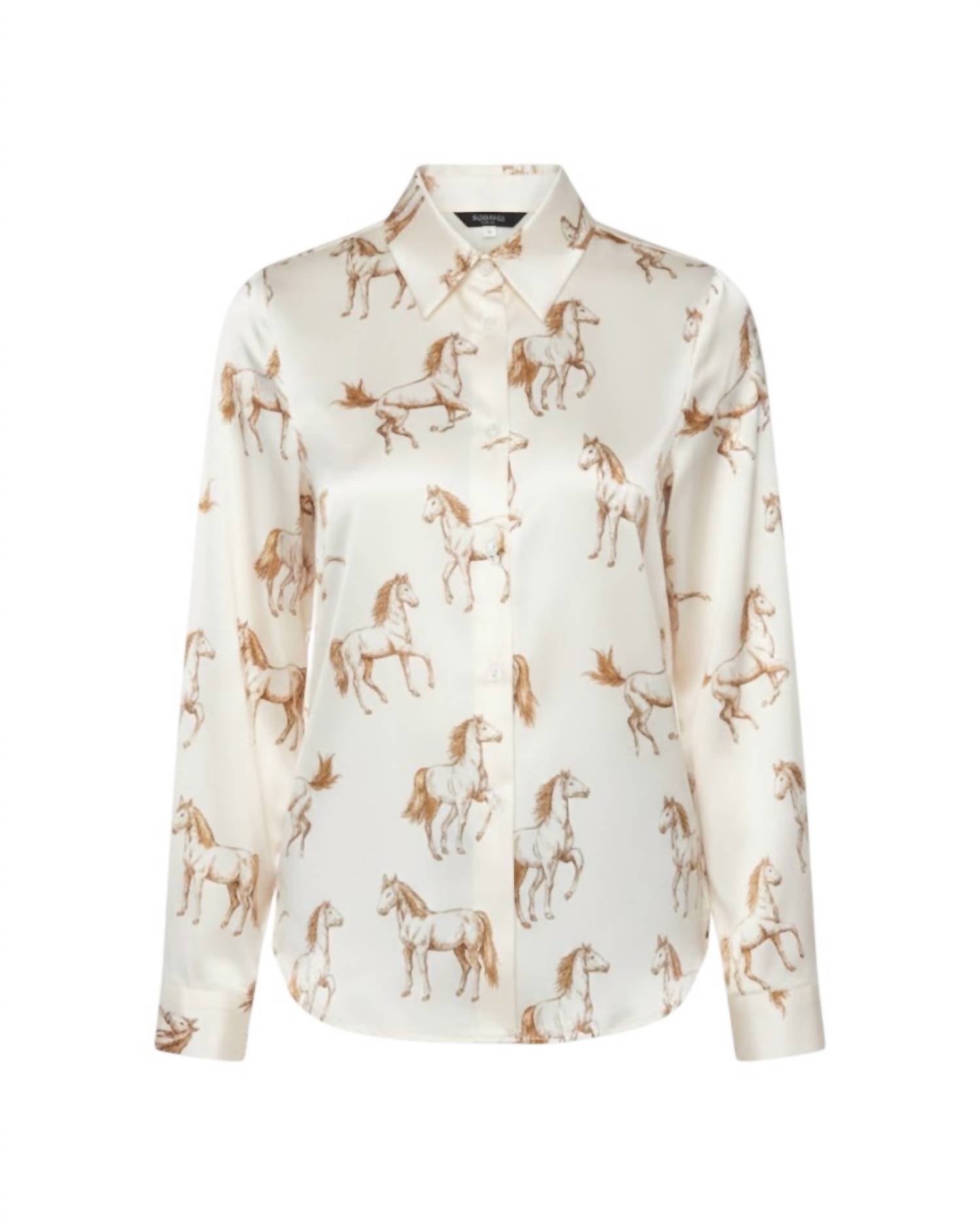 This button down shirt is comfortable yet polished. Embrace effortless style with the Women's Giddy Up Button Down Blouse by SKIES ARE BLUE, a must-have for your spring wardrobe. This elegant white piece features long sleeves and a collar neckline, perfect for a scandi-style touch. Its animal pattern adds a unique flair to the traditional button-down design. For best care, hand wash and line dry.