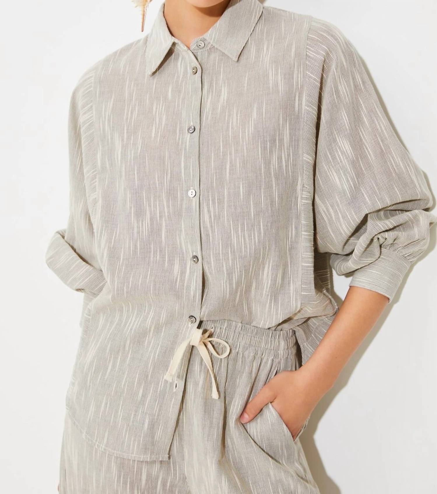 A classic button down shirt that will never go out of style. Meet the Lady Striped Cotton Button-down Shirt by Suncoo, a chic addition to your spring wardrobe. This women's shirt features long, slightly voluminous sleeves, a classic collar, and a button closure, offering minimalist elegance with its fine vertical striped pattern. Crafted from 100% cotton in a relaxed, oversized fit, it ensures comfort and style for dinner parties and beyond. Care is simple with machine wash instructions.