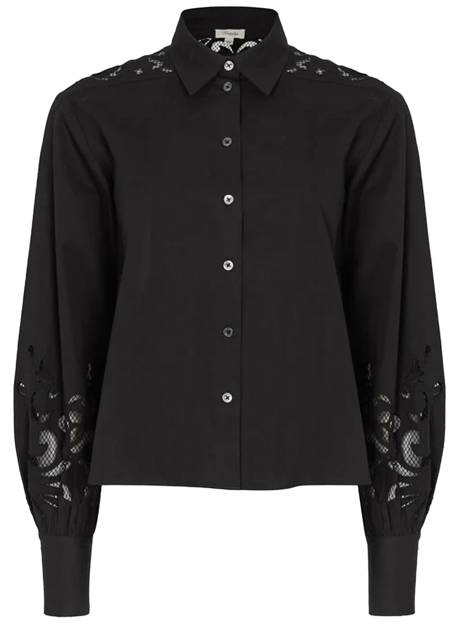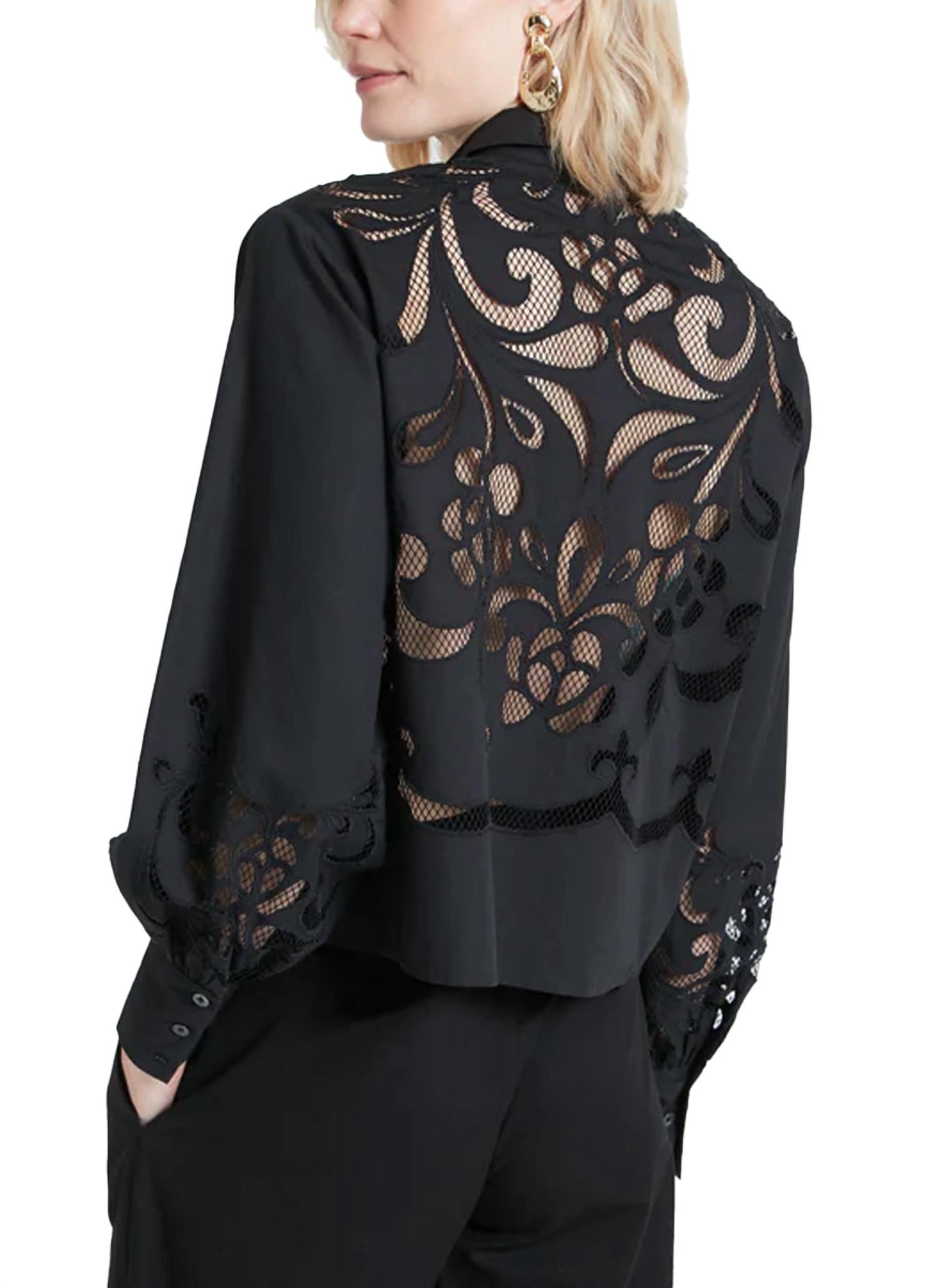 This button down shirt is comfortable yet polished. Elevate your evening ensemble with the Nelle Shirt by Temperley London, a sophisticated choice in timeless black. This button-down shirt is crafted from textured cotton and features long cuffed sleeves and intricate cut-out detailing. Closure: Centre front button closure. The collared design and convenient pockets make it as practical as it is stylish, perfect for a boho chic summer evening event.
