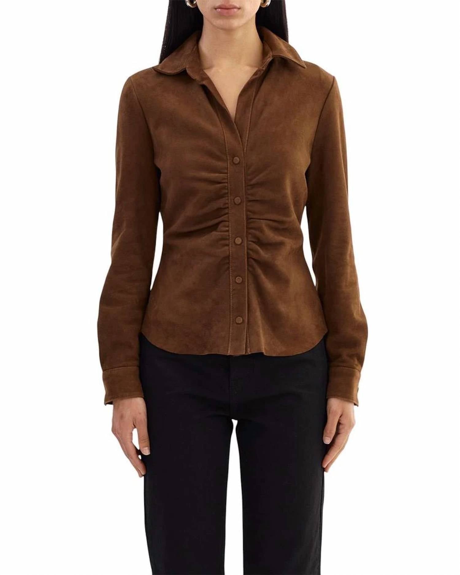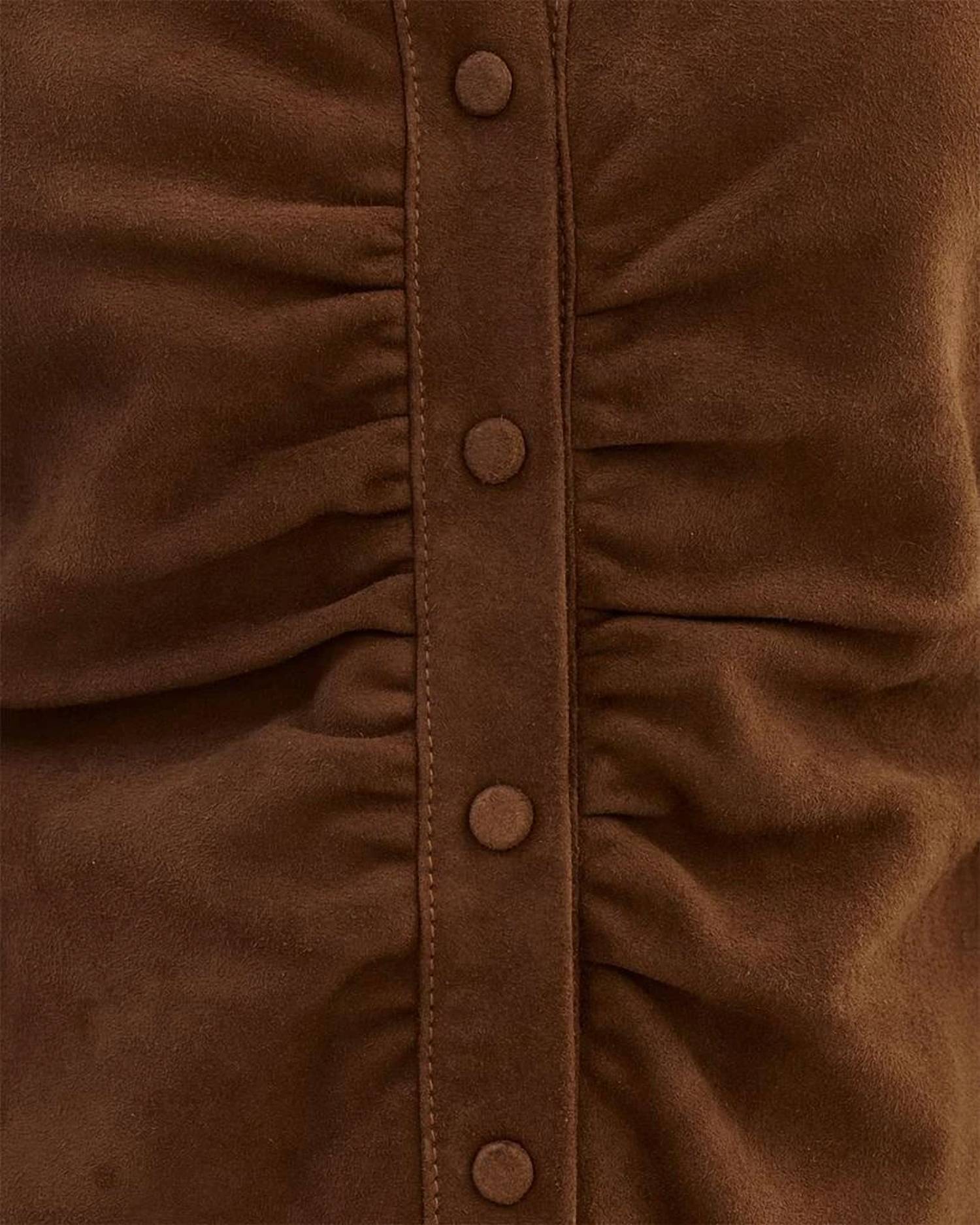 A classic button down shirt that will never go out of style. The Suede Button Up Top by THML in a rich brown is the epitome of Boho Chic, perfect for fall and Thanksgiving occasions. Designed with long sleeves and a collared V-neckline, it features a ruched bodice that sits below the waist for a fitted silhouette. Crafted from a blend of 92% polyester and 8% spandex with a luxurious suede finish, it requires care from a leather clean specialist only. Closure: Button closure.