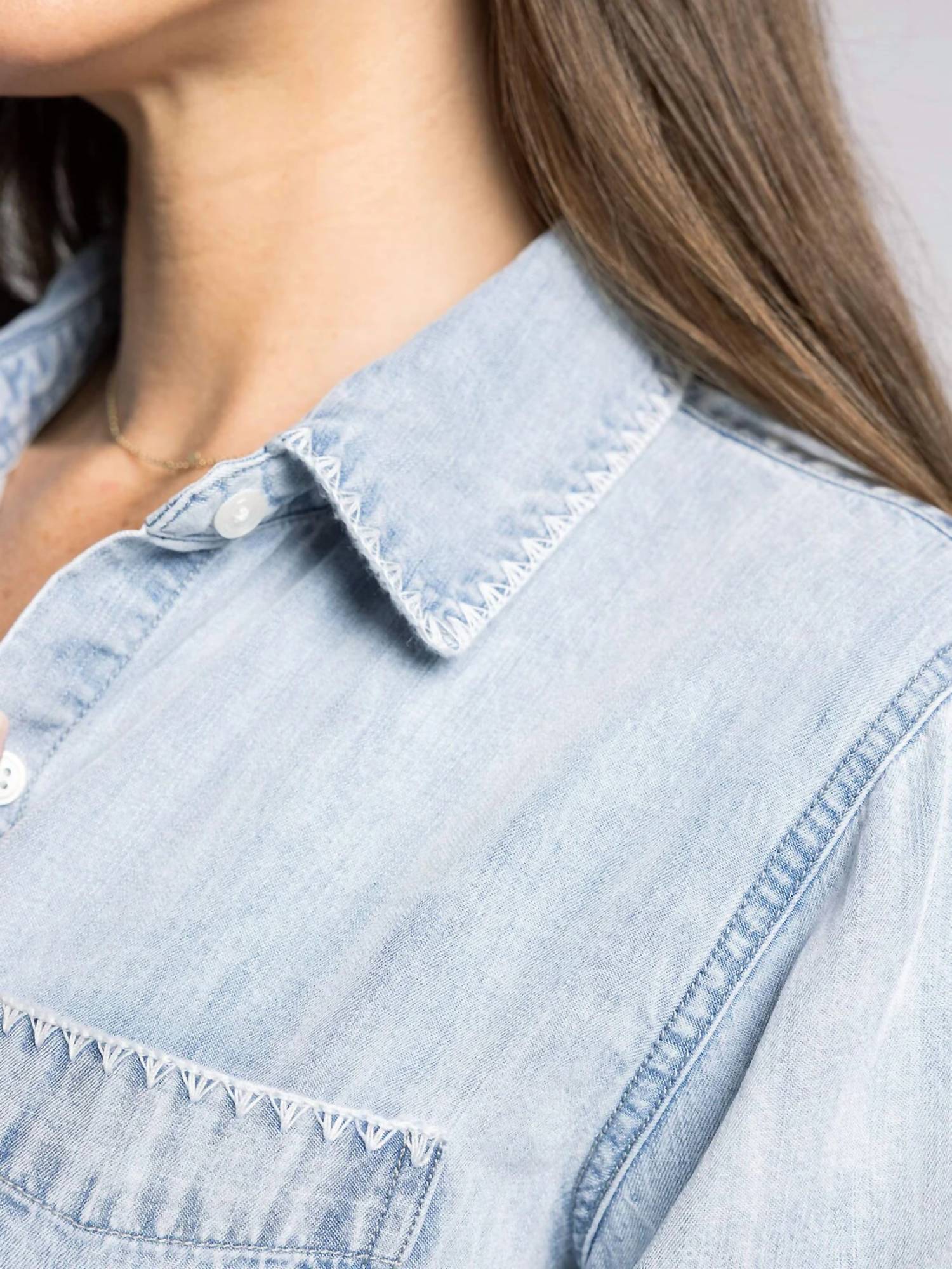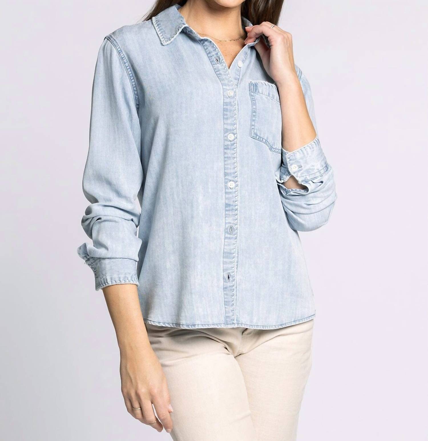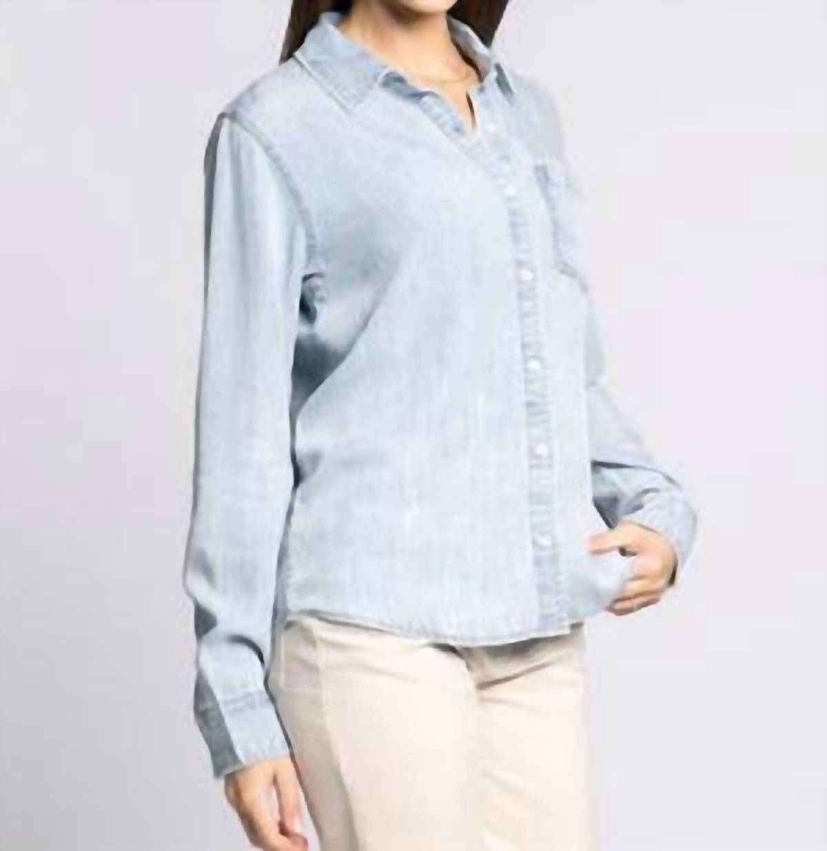 This button down shirt is comfortable yet polished. Elevate your wardrobe with the Annalise Button-Front Shirt by Thread & Supply in a chic light denim hue. This women’s long-sleeve shirt is expertly crafted from 100% Tencel Lyocell, ensuring a soft feel and breathable comfort ideal for your workwear collection. It features a button closure and a collared neckline, complete with a practical single chest pocket for added functionality. Care instructions recommend hand washing to maintain its polished appearance.