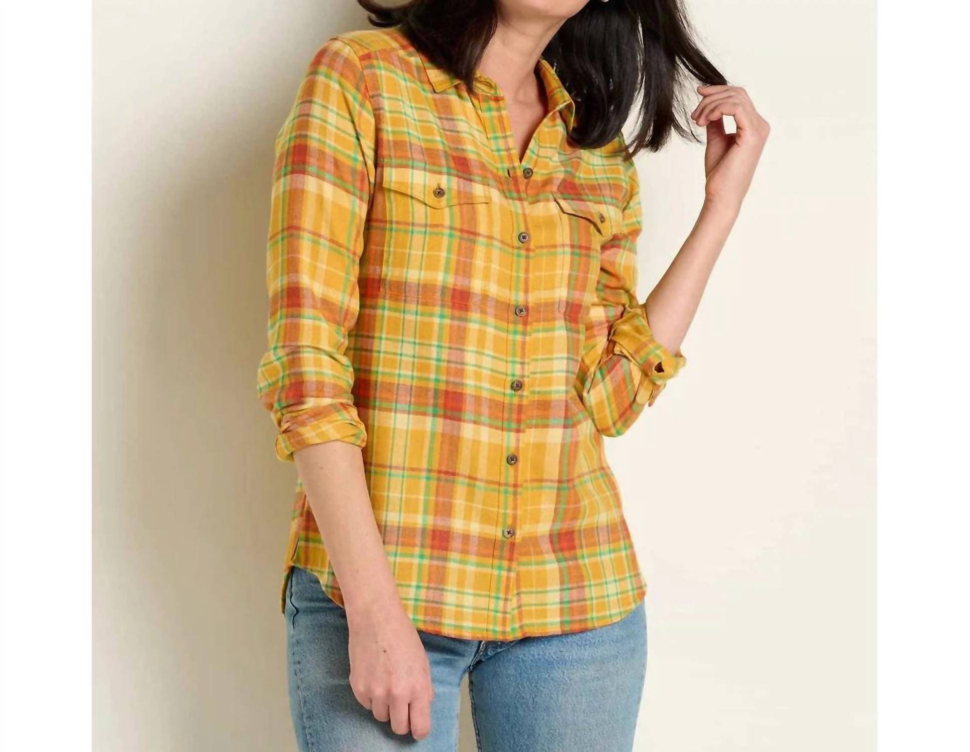Perfectly tailored and soft to the touch. The Re-Form Flannel Long Sleeve Shirt by TOAD&CO is perfect for the stylish and eco-conscious woman. Crafted from 60% recycled cotton and 40% recycled polyester, this lightweight plaid and check flannel offers modern outdoor colors. It features long sleeves, a button front placket, and button-through chest pockets with a length of 27 inches. Closure: Button closure. Care: Machine wash on cold, tumble dry low, cool iron as needed, and do not bleach.