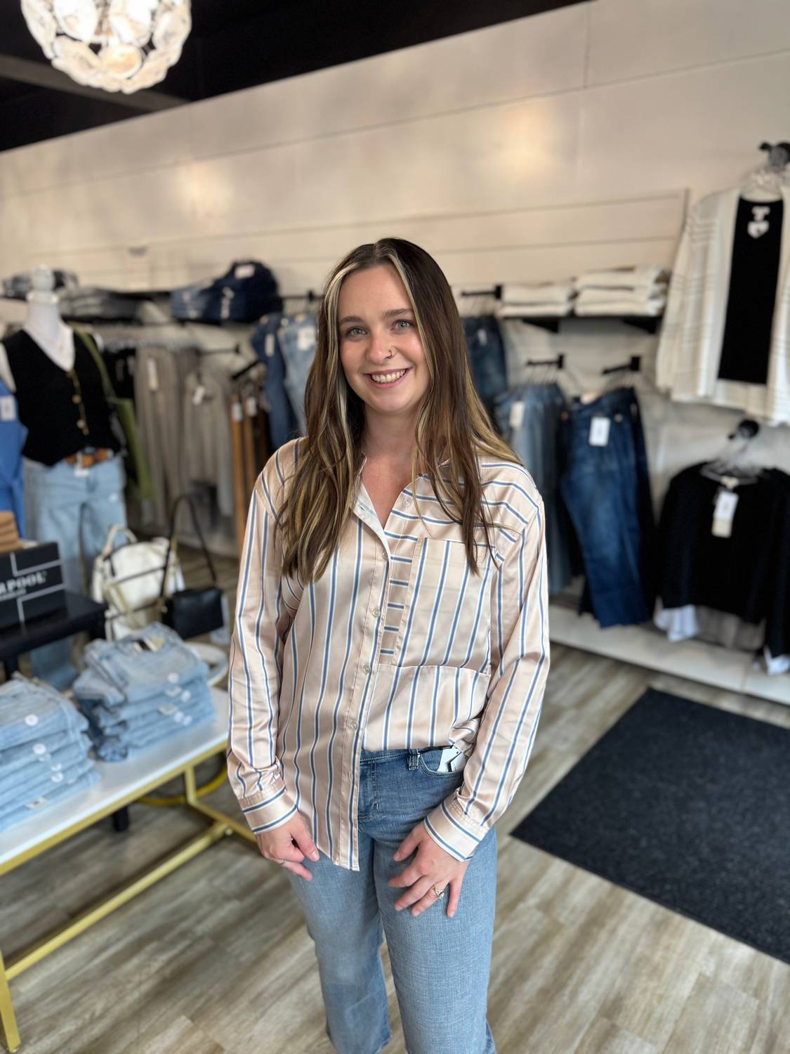 A classic button down shirt that will never go out of style. Enhance your wardrobe with the Tribal Long Sleeve Shirt With Cuts, a chic choice in beige and light blue featuring a striking stripe pattern. Tailored with a collar and button closure, this shirt offers a flattering fit that complements both jeans and trousers. Made for a sophisticated look, it's perfect for workwear or a dinner party.