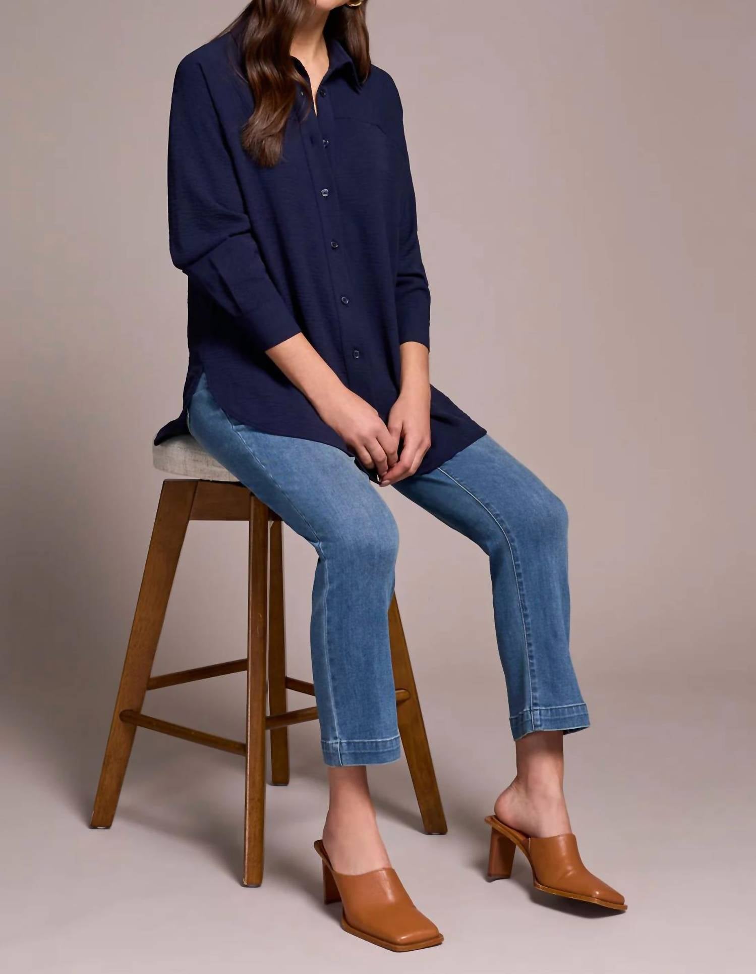 A classic button down shirt that will never go out of style. Elevate your wardrobe with the Stretch Woven Flowy Raglan Sleeve Shirt by TRIBAL, designed for effortless elegance in a stunning Nightfall shade. Featuring long raglan sleeves with fitted cuffs and a classic collar, this shirt offers a relaxed button-up style perfect for any occasion. Crafted from breathable polyester with a curved hem, it allows for easy movement with built-in stretch. Closure: Button closure. Care instructions include machine washing on a delicate cycle in cold water and tumble drying on low.