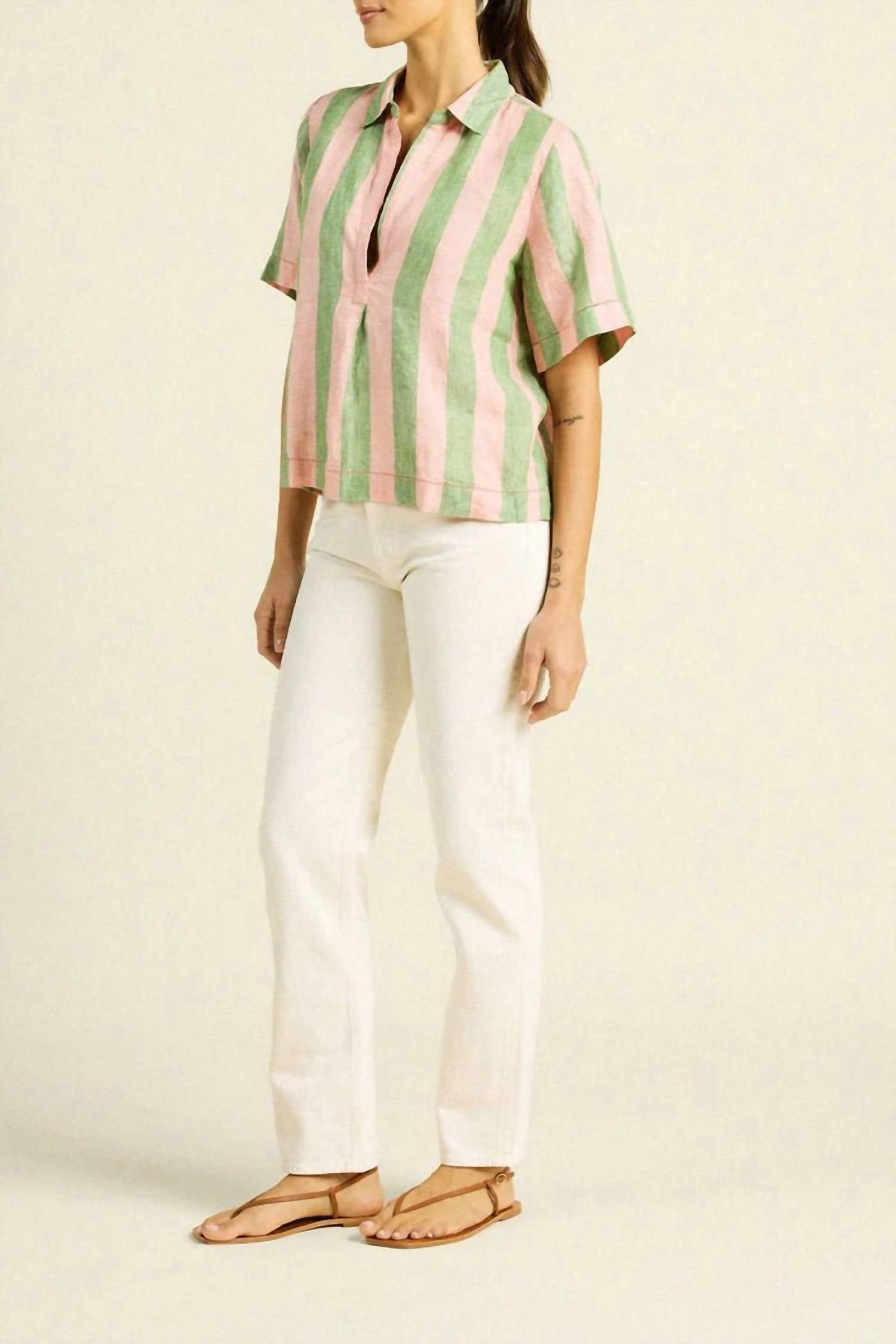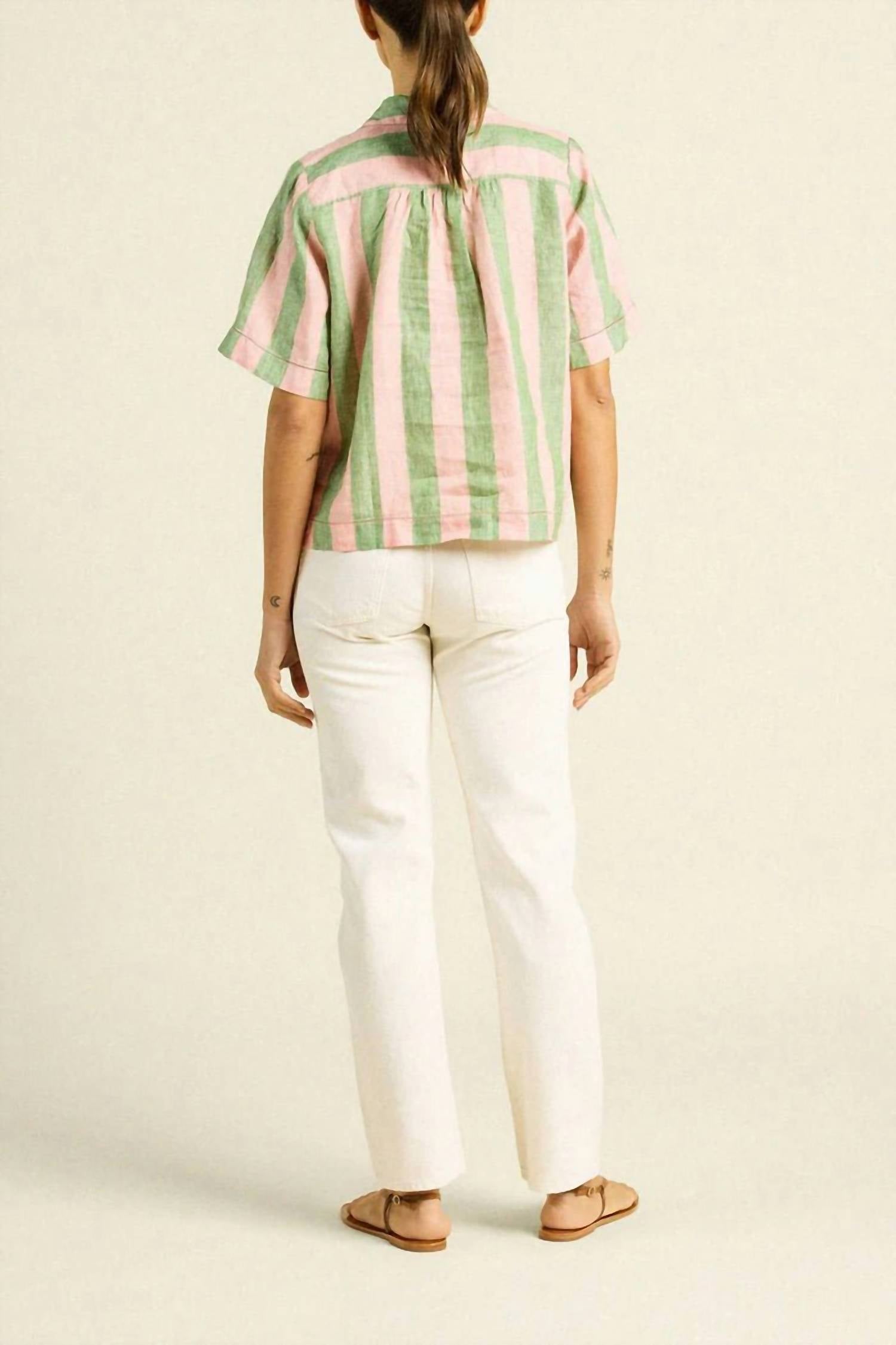 The Women's Cora Shirt by TROVATA offers a slightly boxy fit, ideal for summer with its breathable 100% linen composition. This striped button-down features structured short sleeves, a folded collar, and an elongated henley front placket with a concealed hook and thread cord for added neckline closure. It's perfect for vacation and streetwear, adding versatility to your wardrobe. Care instructions are simple with machine wash cold separately, tumble dry low, and medium iron as needed.