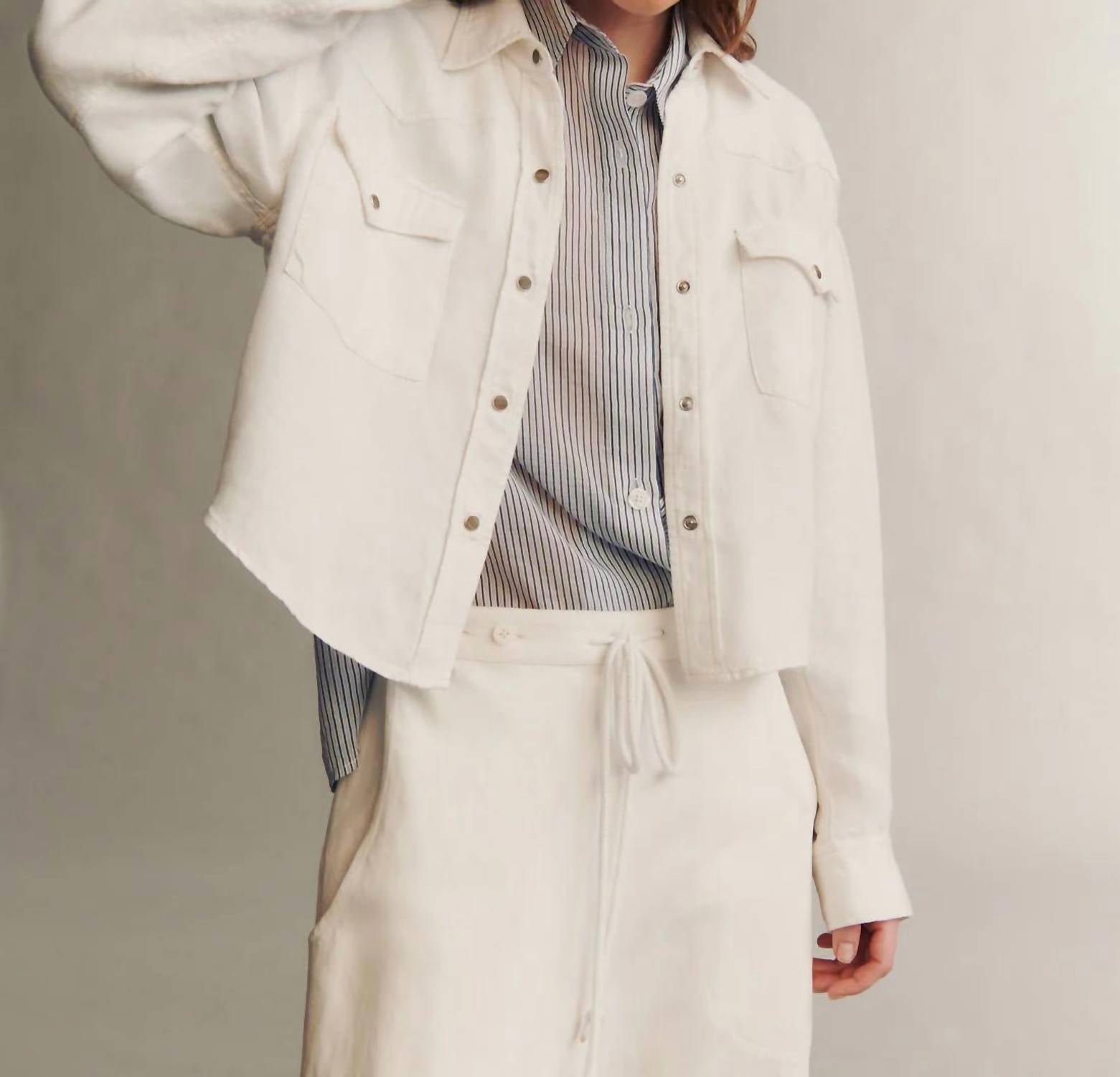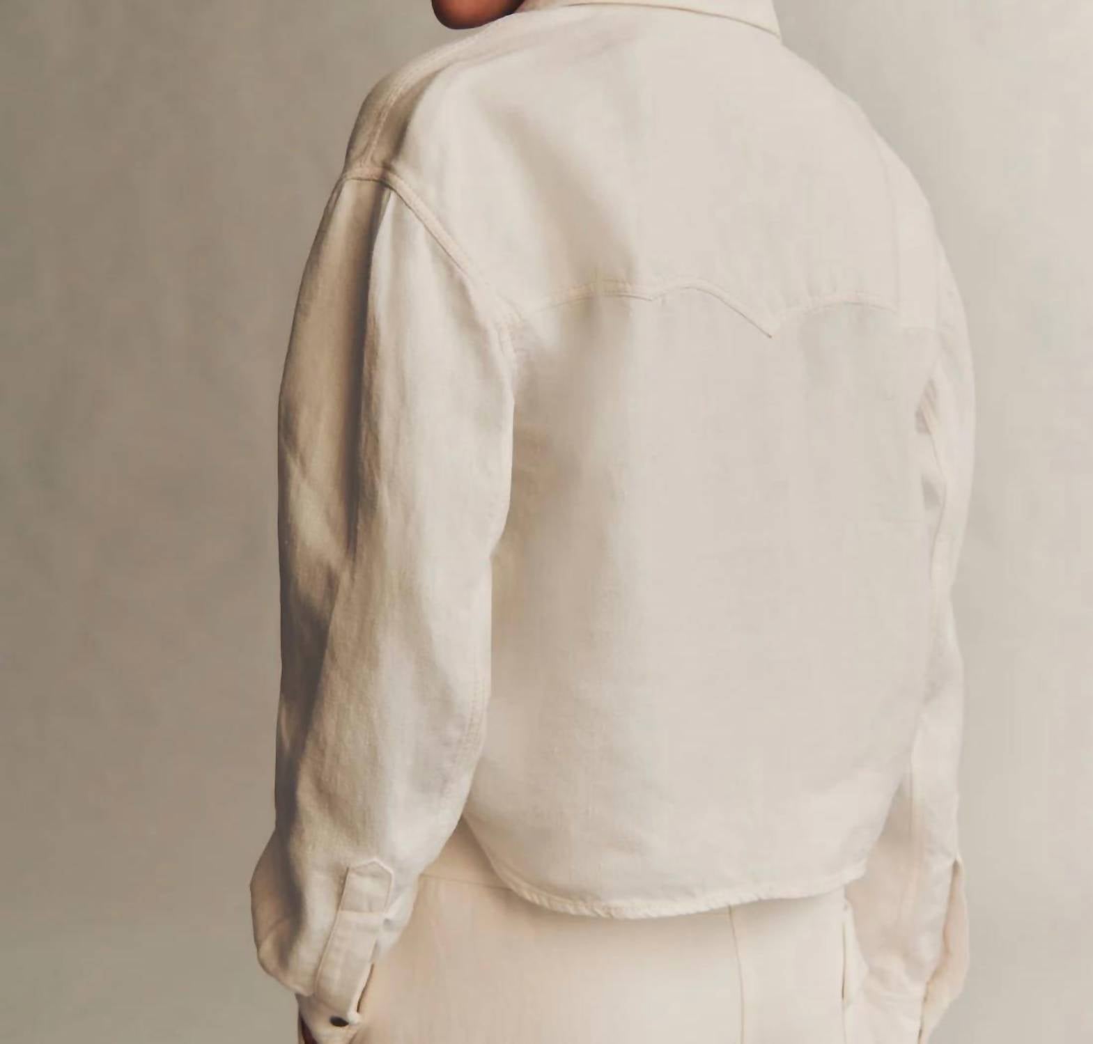 A classic button down shirt that will never go out of style. Discover the Cropped OG Shirt by TWP, a chic piece crafted from Japanese denim that combines Western inspiration with modern appeal. Designed in a solid white, this shirt features long sleeves, a spread collar, and a convenient button closure. The fabric composition is 98% cotton and 2% elastane, ensuring a perfect blend of comfort and slight stretch. For easy care, simply machine wash and tumble dry as needed. The boxy silhouette with luxe utility details, chest flap pockets, and single button cuffs makes it a stylish choice for any occasion.