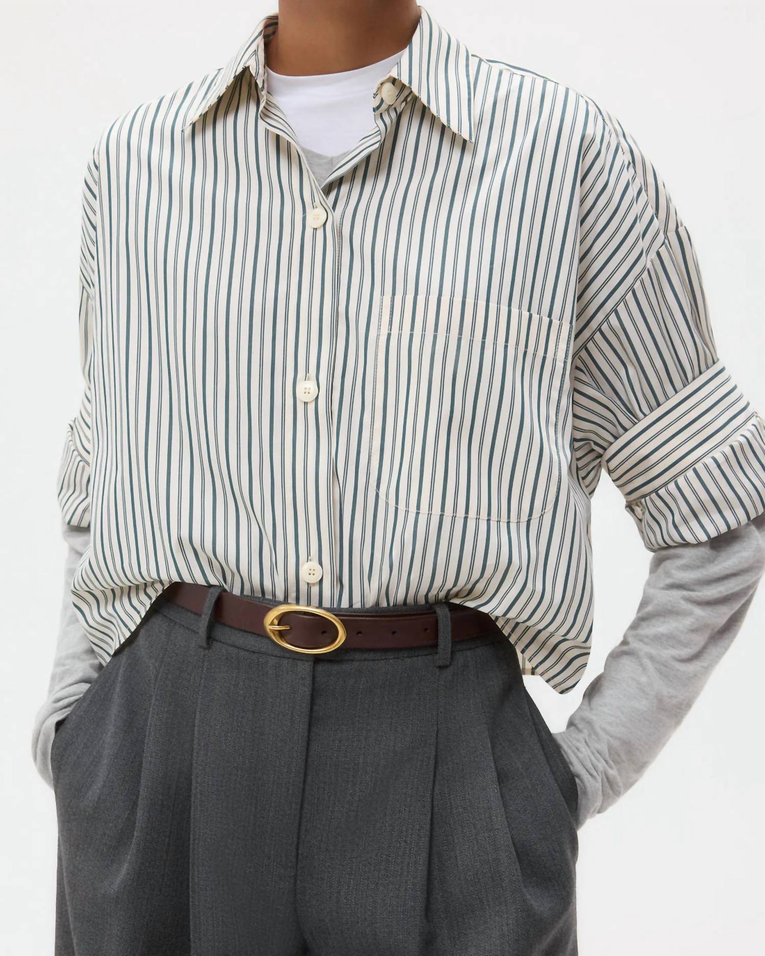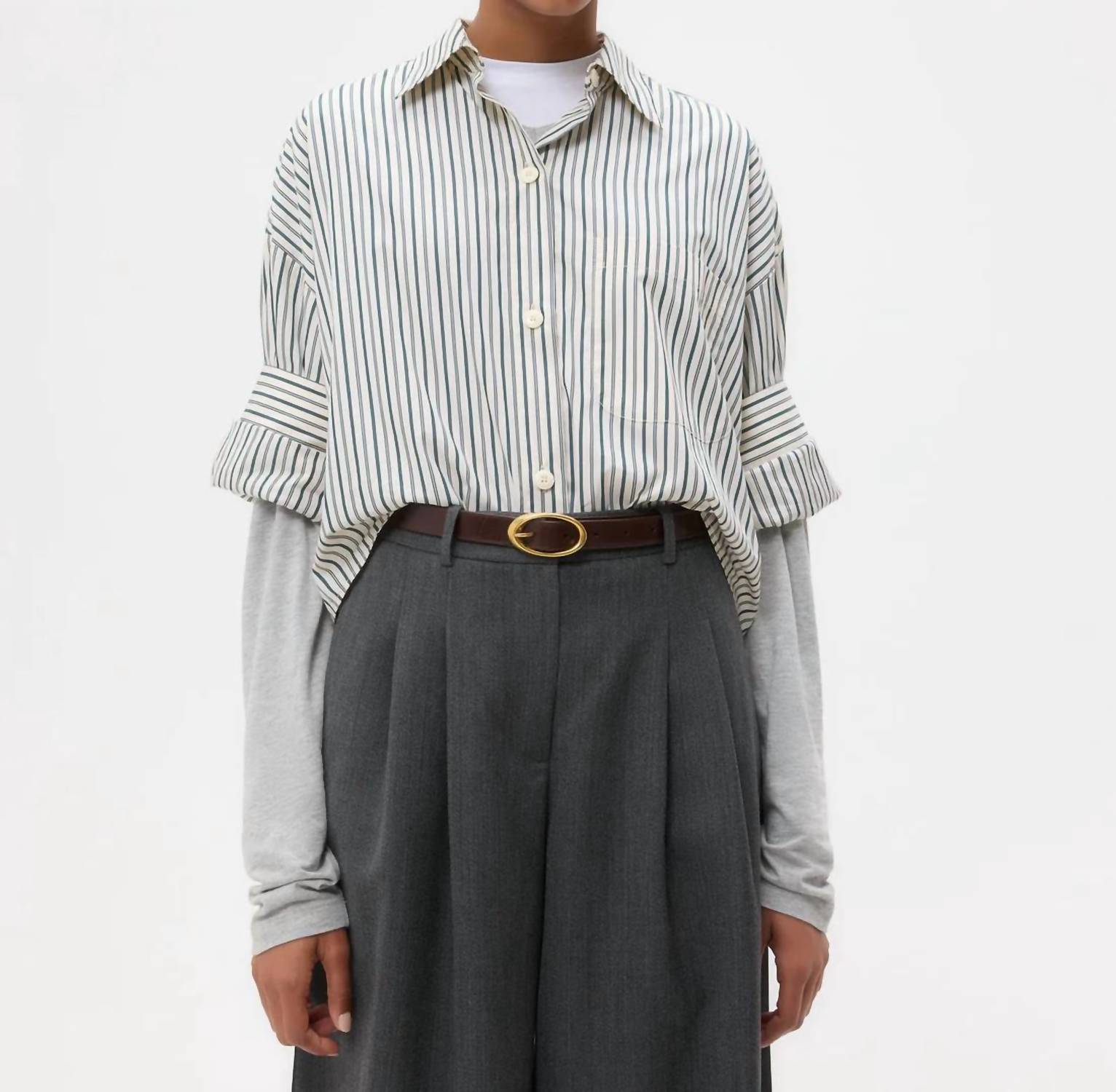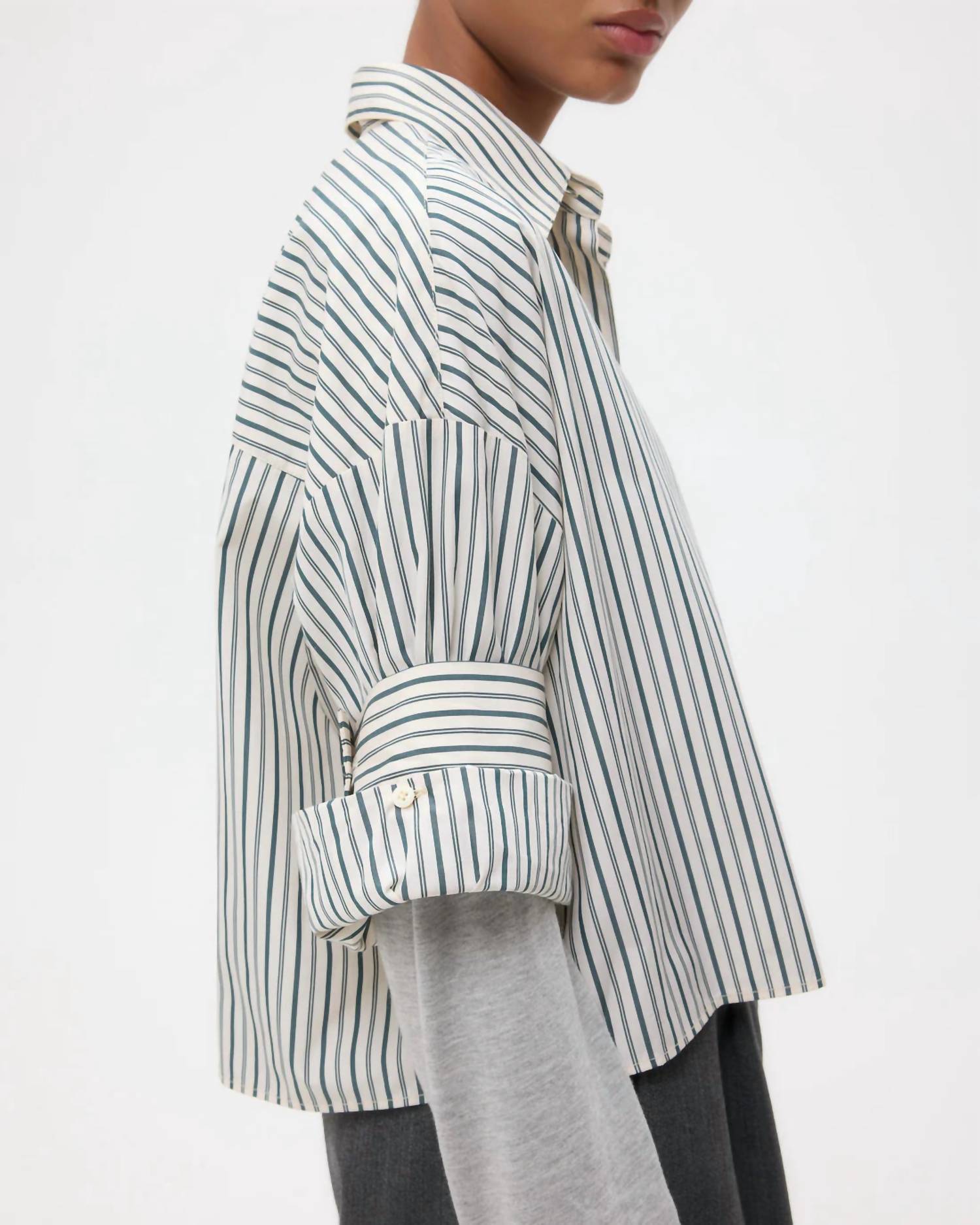 This button down shirt is comfortable yet polished. Step into effortless elegance with the TWP Next Ex Shirt, a chic choice for your spring wardrobe. This ivory and cilantro striped button-down features short sleeves and a boxy silhouette, crafted from 100% lightweight cotton poplin. It's designed with a practical chest patch pocket, button-up placket, spread collar, and our signature double roll button cuffs. Closure: Button closure. Care: Follow standard cotton care instructions.