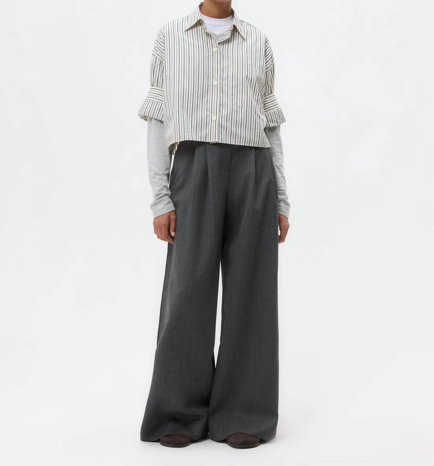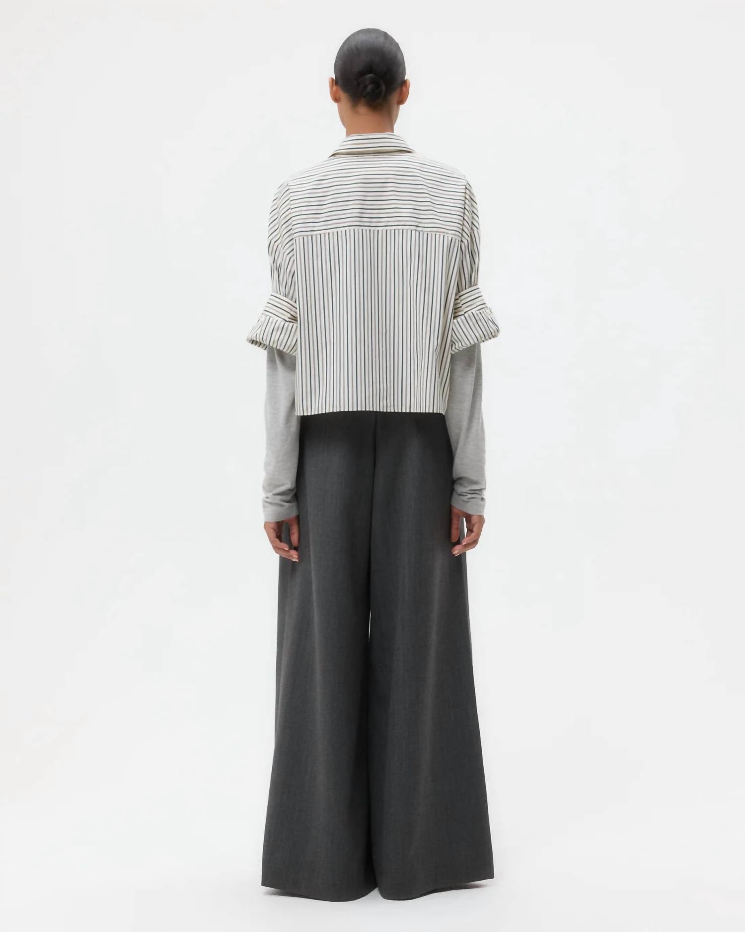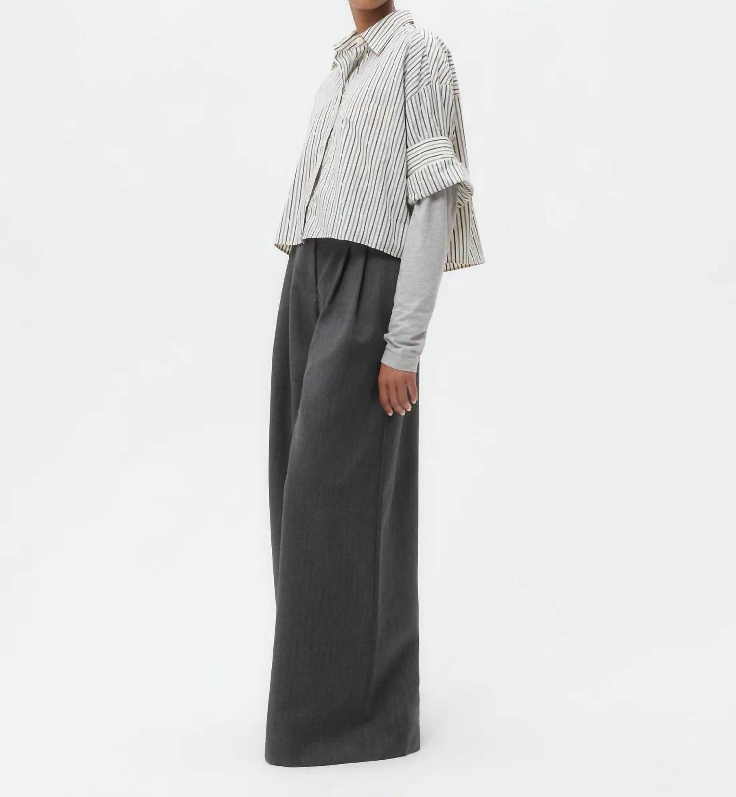 This button down shirt is comfortable yet polished. Step into effortless elegance with the TWP Next Ex Shirt, a chic choice for your spring wardrobe. This ivory and cilantro striped button-down features short sleeves and a boxy silhouette, crafted from 100% lightweight cotton poplin. It's designed with a practical chest patch pocket, button-up placket, spread collar, and our signature double roll button cuffs. Closure: Button closure. Care: Follow standard cotton care instructions.