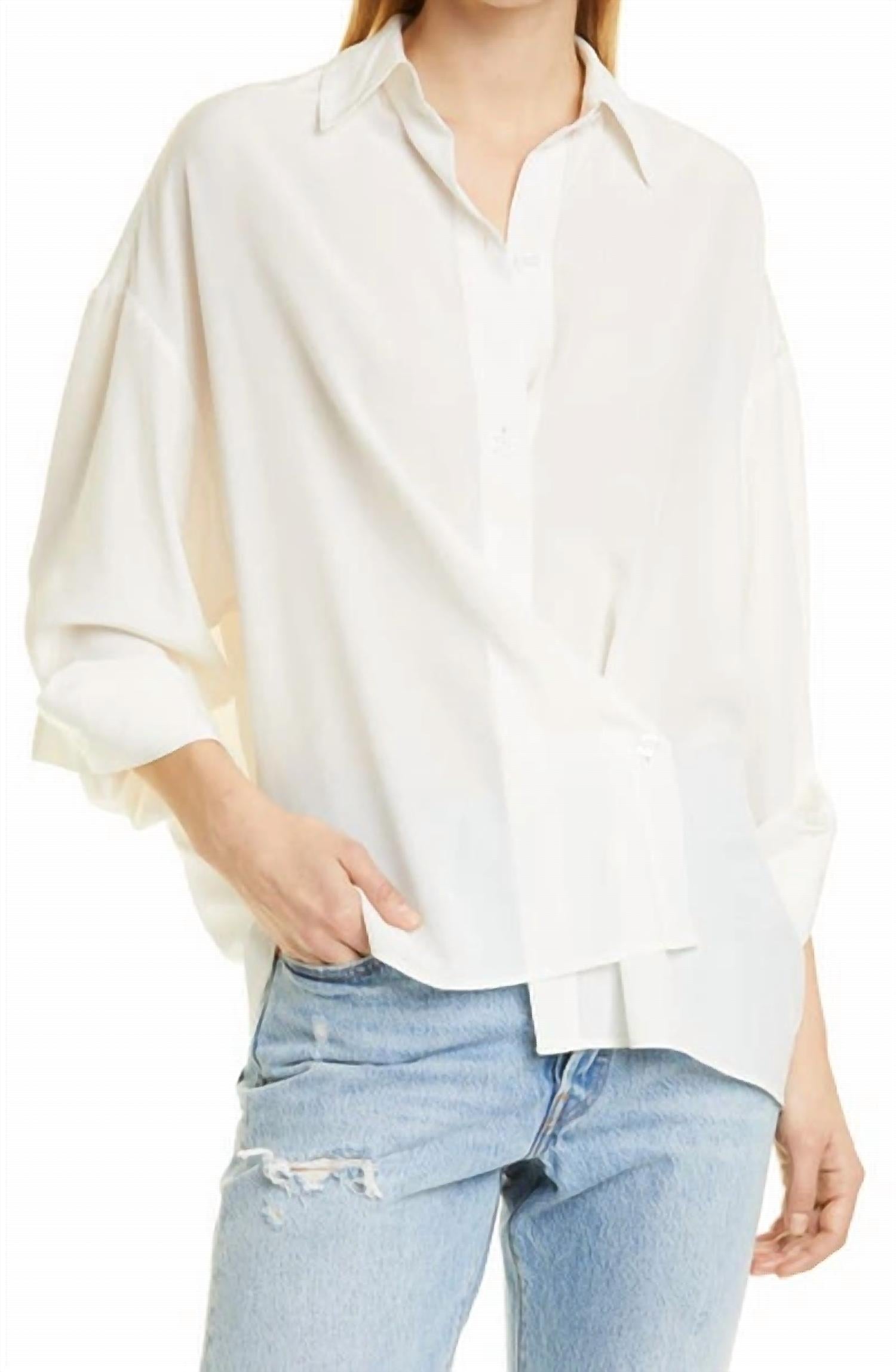 This button down shirt is comfortable yet polished. The TWP Satin Sheets Shirt is made from 100% silk and features a spread collar, long sleeves with roll-tab cuffs, and an asymmetric front with buttons. It is designed for dry cleaning and is made in the USA using imported fabric.