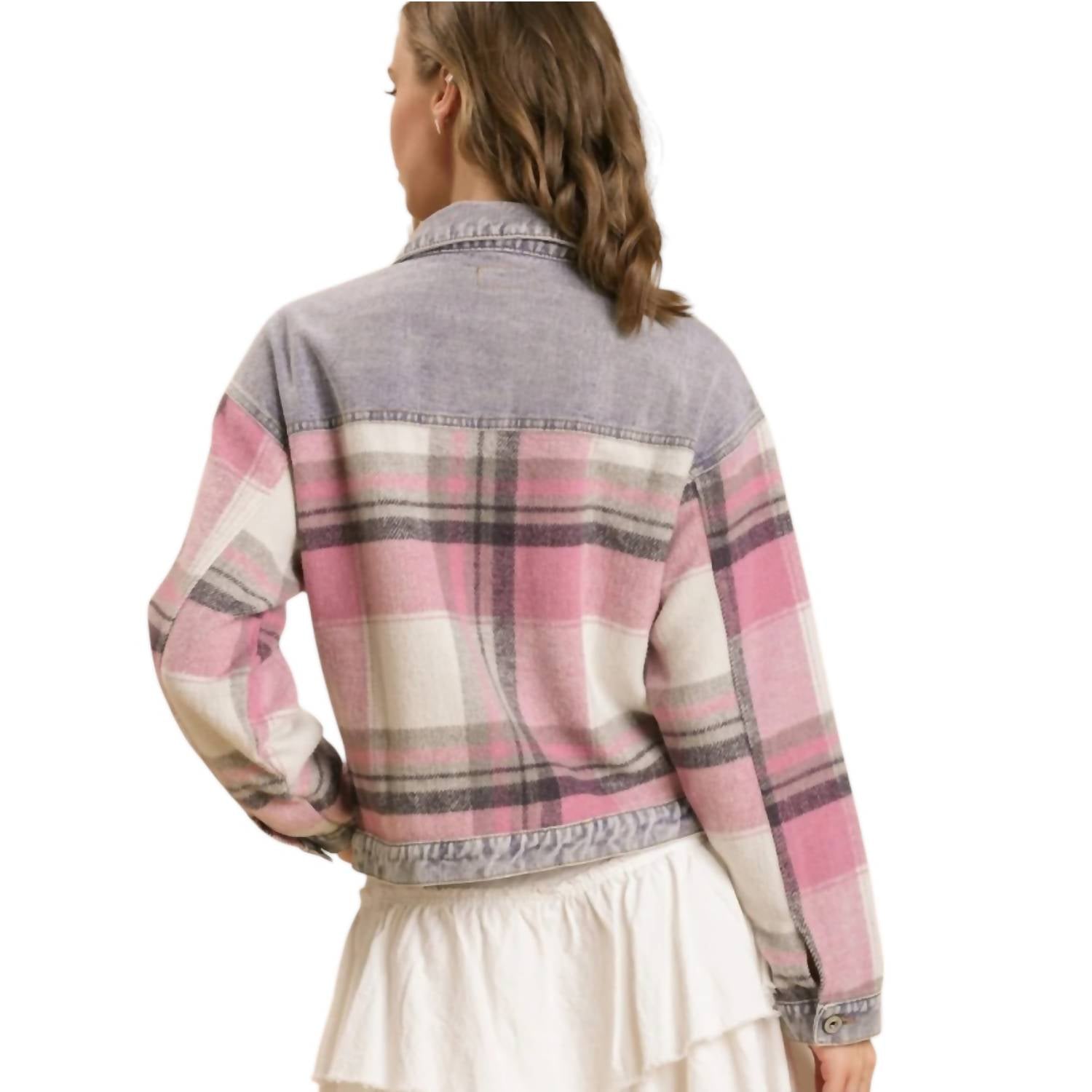 This button down shirt is comfortable yet polished. Introducing the Plaid Button Down Denim Jacket by Umgee, a stylish addition for your casual wardrobe in a trendy light pink hue. This women's jacket features long sleeves and a classic collar, with an eye-catching plaid detail that stands out. Designed with both chest and side pockets for added functionality, the jacket offers a convenient button closure. Perfect for layering, it's ideal for adding a playful touch to your outfit.