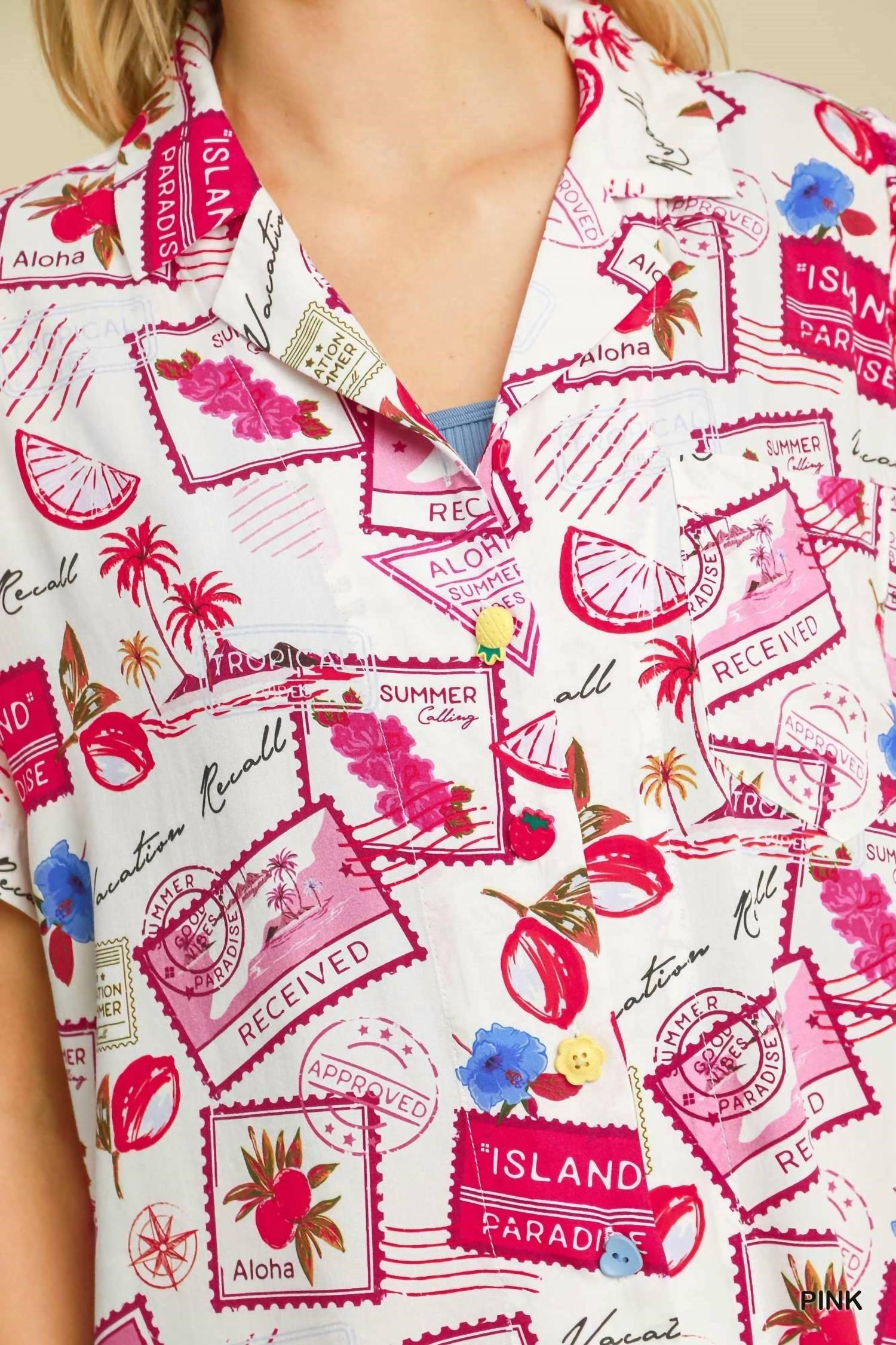 This button down shirt is comfortable yet polished. Elevate your summer wardrobe with the Tropical Resort Print Short Sleeve Top by Umgee, featuring a vibrant pink graphic perfect for vacation getaways. This women's button-down shirt boasts short sleeves and is crafted from 100% rayon for a breezy feel. Its chic collar neckline and button closure make it ideal for a casual yet stylish look. Care instructions: machine wash only. Model is 5'10" and wears a size small.
