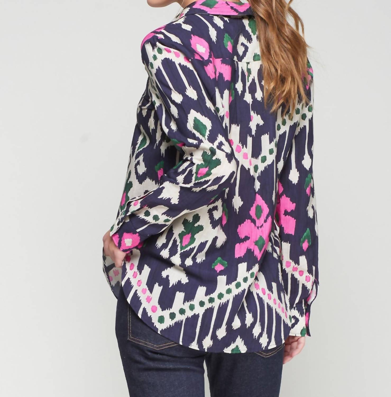 A classic button down shirt that will never go out of style. Introducing the Ikat Long Sleeve Shirt by Vilagallo, a chic piece that infuses a touch of timeless artistry into your wardrobe. This button-down shirt is composed of a soft 55% Viscose and 45% Cotton blend, offering a cozy fit with classic long sleeves. It comes in a stunning navy with pink, green, and white Ikat patterning, accented by a classic collar and button closure with buttoned cuffs. The slightly rounded hem enhances the shirt's tailored yet relaxed silhouette, making it ideal for both professional and casual settings.