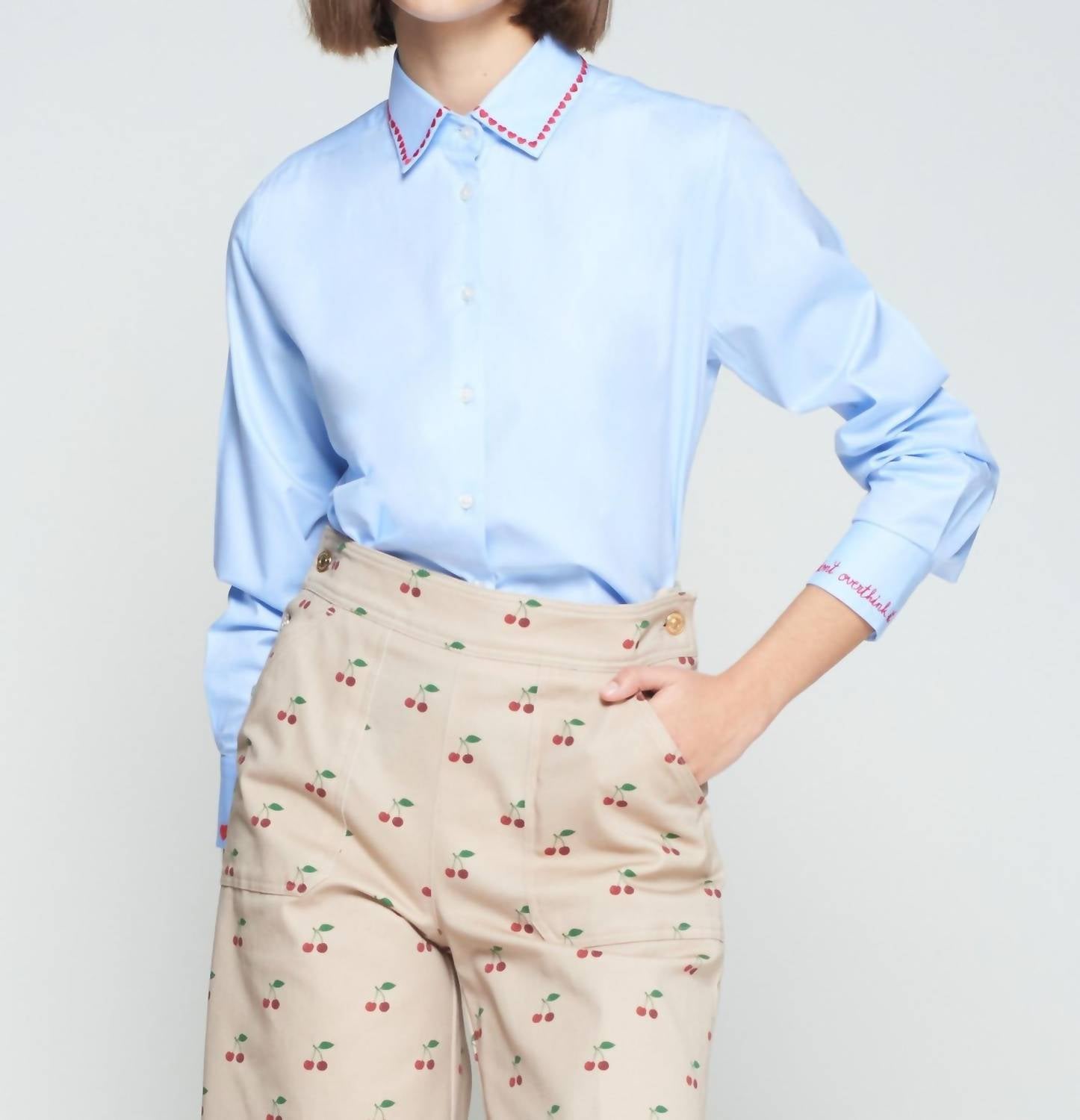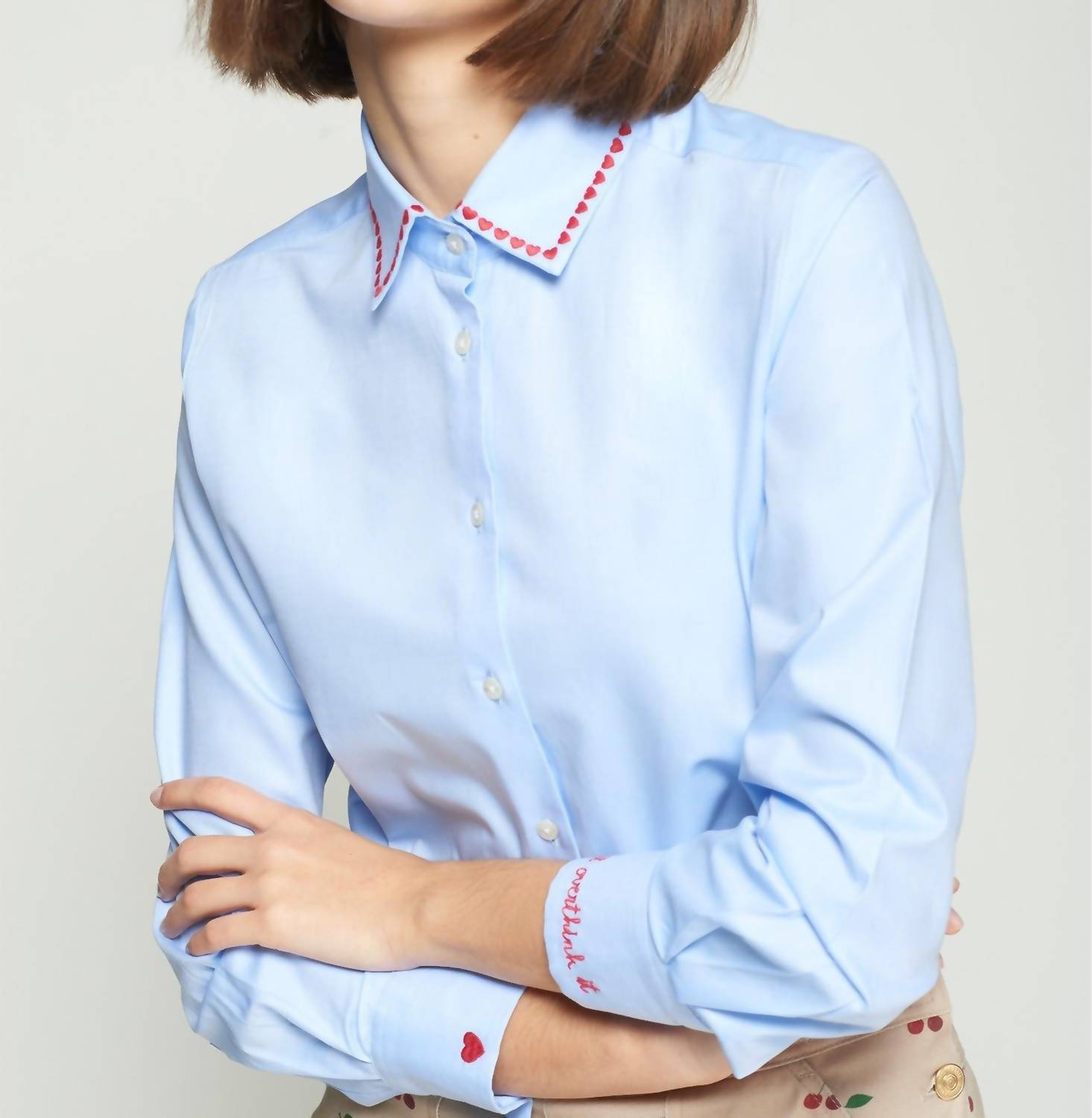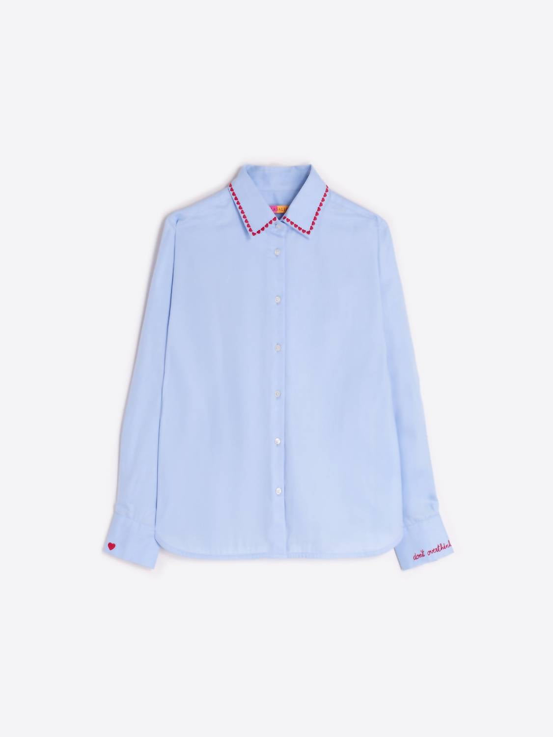 Perfectly tailored and soft to the touch. The Isa Embroidered Shirt by Vilagallo is a chic addition to your wardrobe, perfect for vacation vibes. This classic-fit shirt features long sleeves and a pointed collar adorned with red embroidered hearts, adding a playful touch to its minimalist design. Crafted from light, structured poplin cotton, it has a button closure and a curved hem for a flattering fit. The thoughtful details like the "Don't overthink it" message on the cuff and "Made with love" on the collar bring unique character to this spring essential. Model stands at 174 cm.