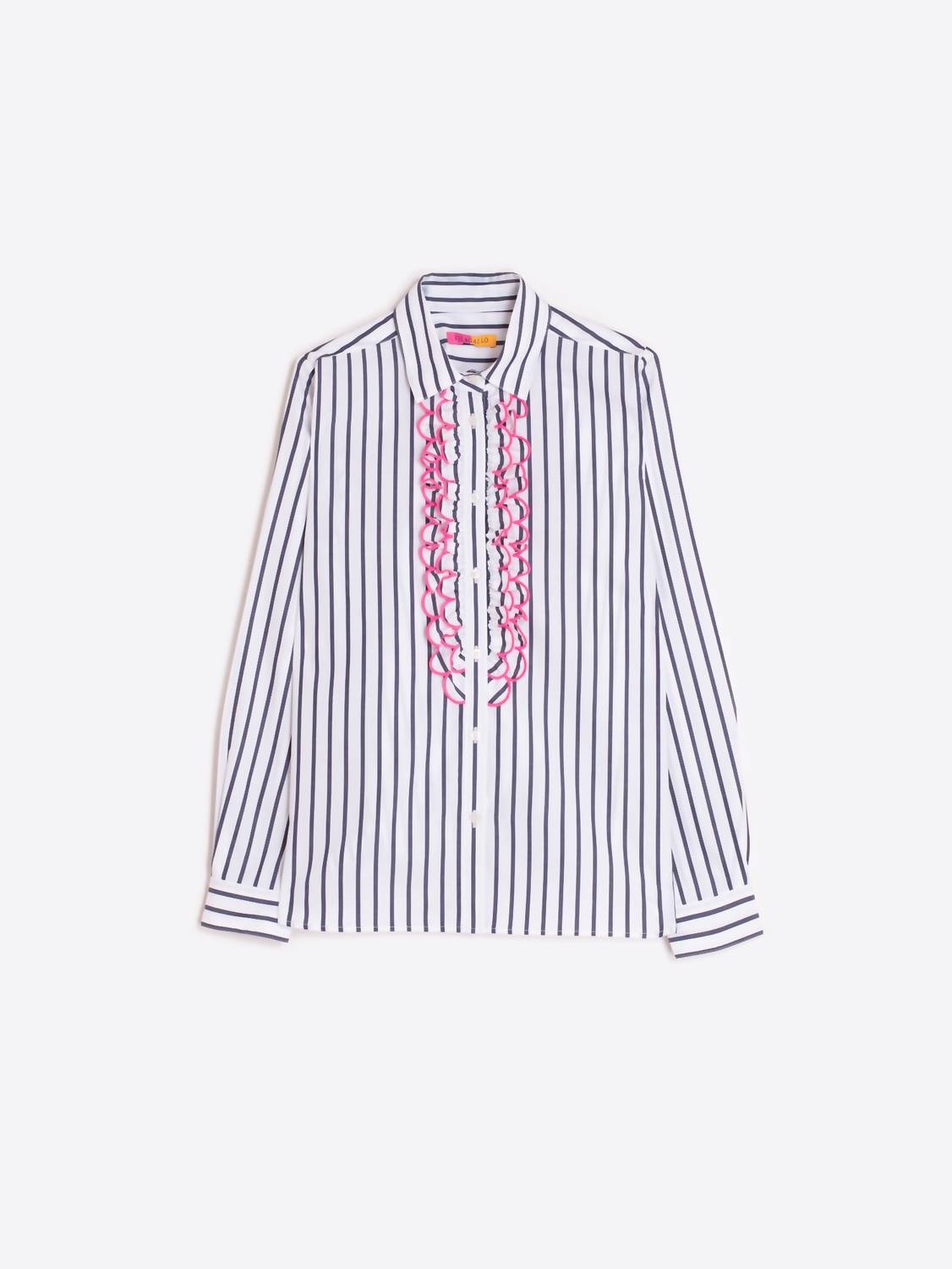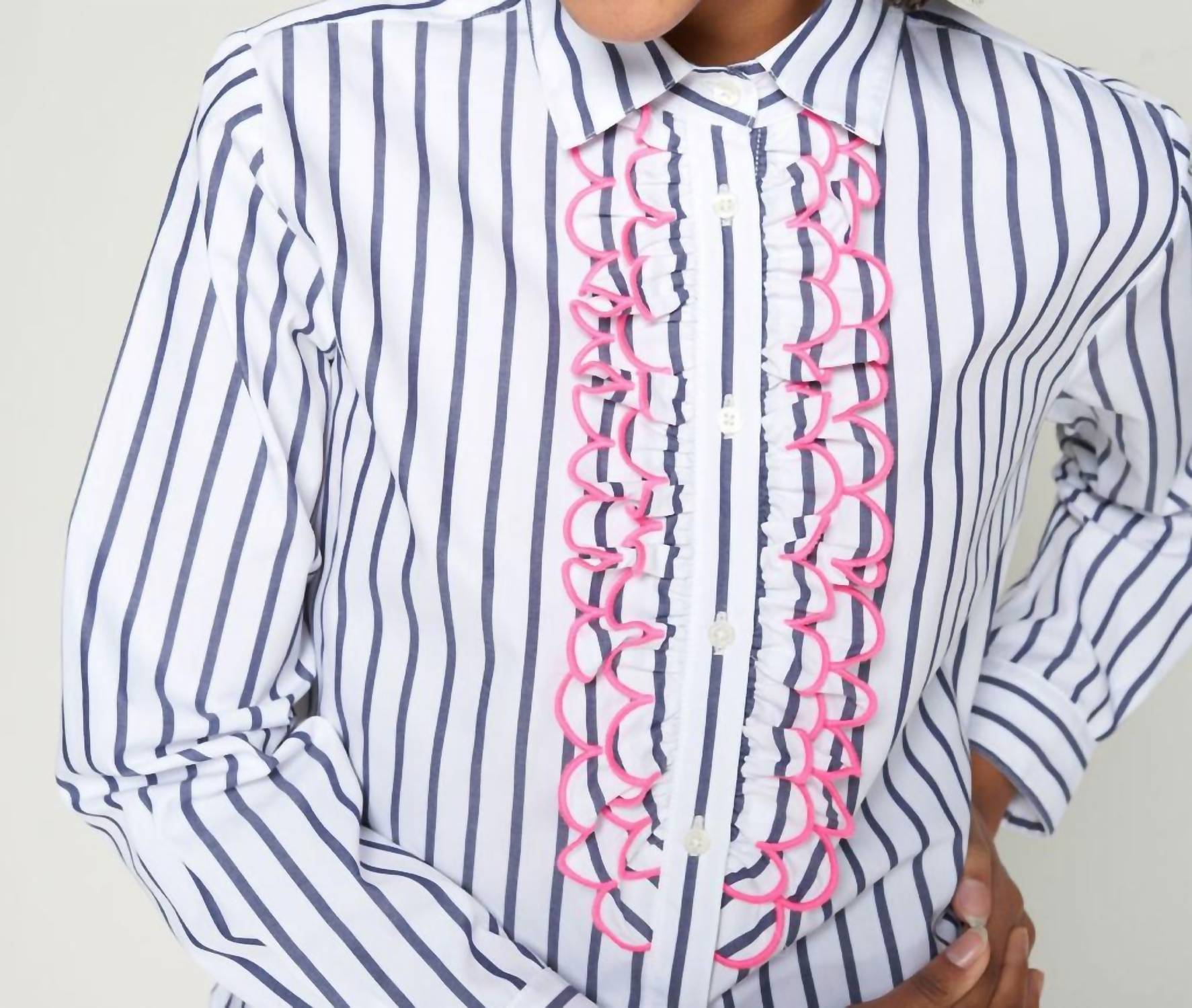 Introducing the Lionetta Embroidered Top by Vilagallo, a sophisticated piece perfect for your spring wardrobe. This long sleeve button-down shirt boasts embroidered stripes on a navy and white backdrop, crafted from premium cotton to offer a tailored fit. Closure: Button closure. Care: Machine wash. Ideal for holiday parties and transitioning from day to night with timeless and vintage-inspired flair.