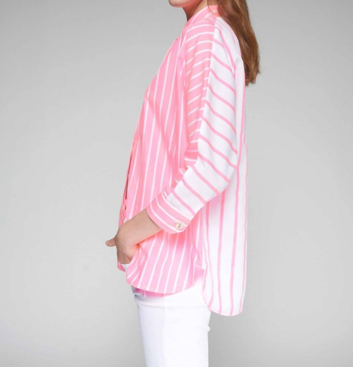 This button down shirt is comfortable yet polished. Elevate your summer wardrobe with the Vilagallo Louisa Neon Shirt, featuring a striking pattern of pink and white stripes. This button-down shirt showcases three-quarter sleeves with cuffs and a classic collar. Crafted from a 90% cotton and 10% polyester blend for comfort and style. Closure: Button closure. Ideal for minimalist trends and perfect for dinner parties.