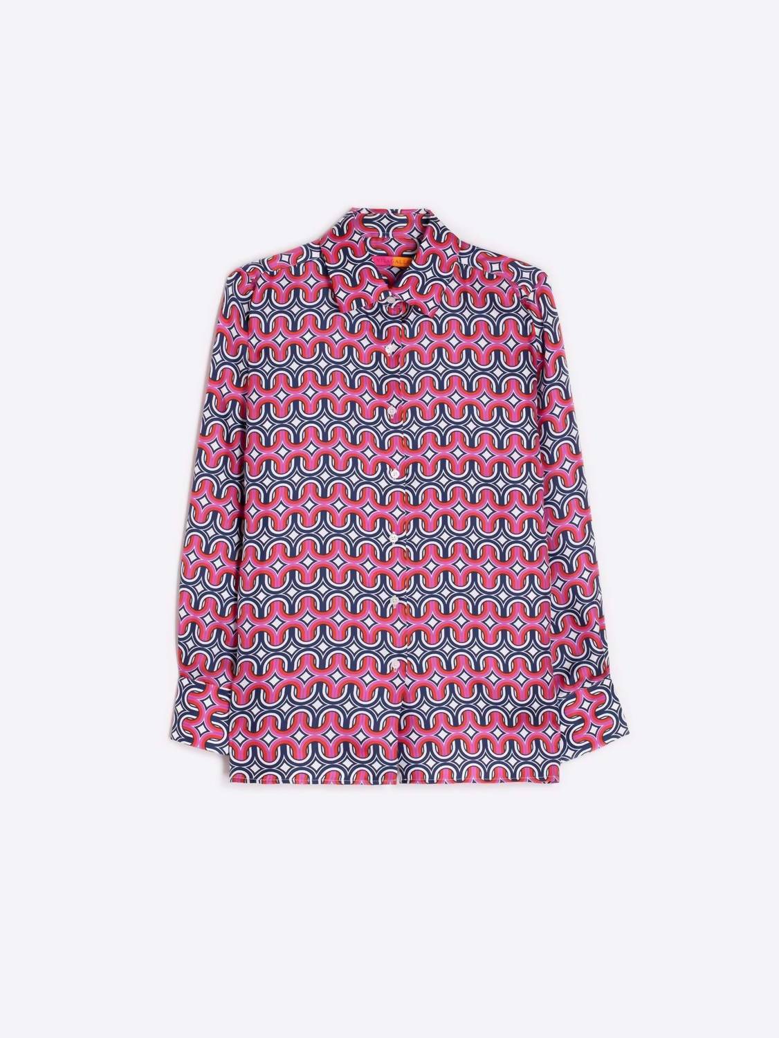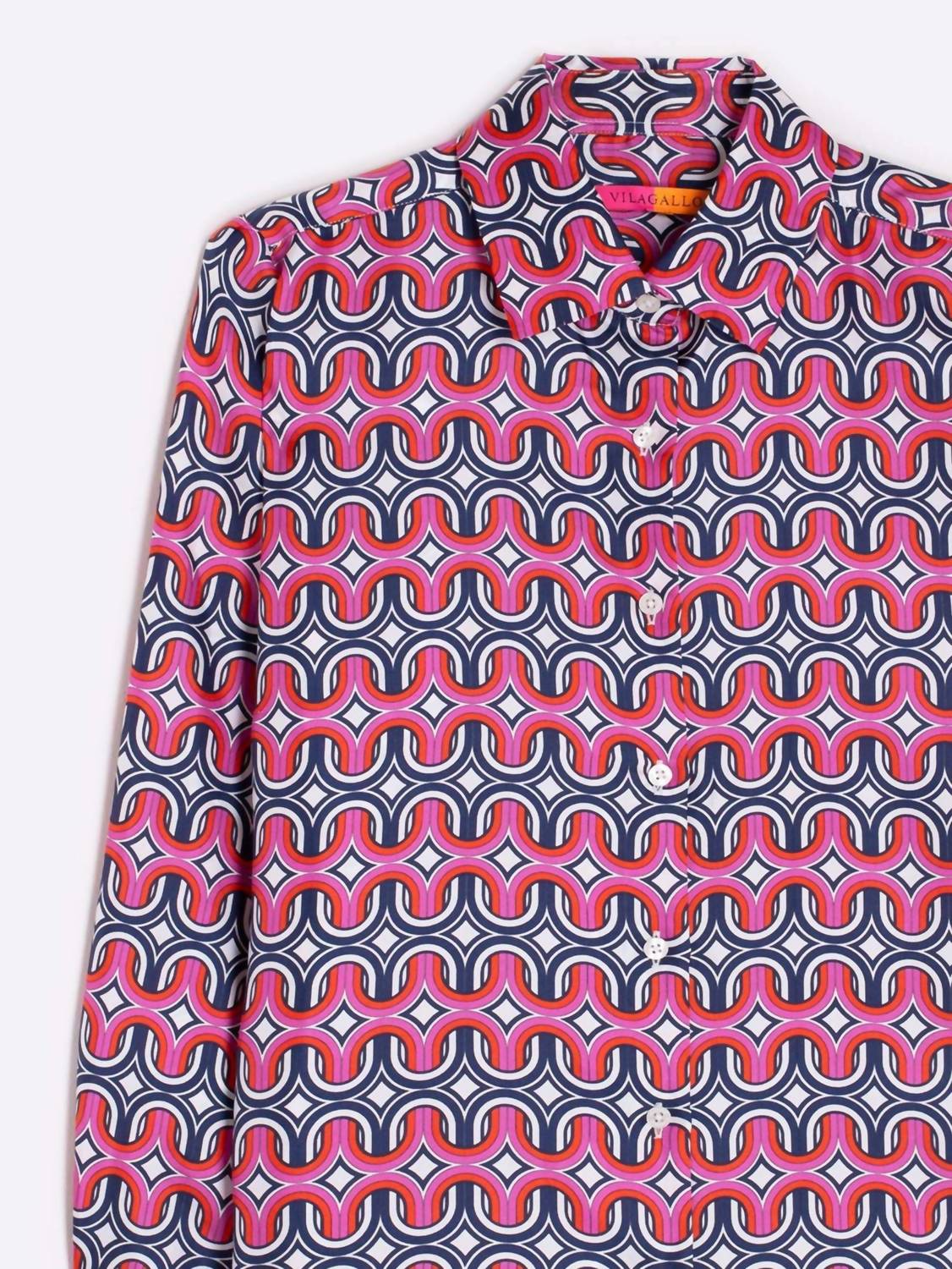 Experience the luxurious elegance of the Mariela Geometric Shirt by Vilagallo, a standout piece in pink and navy blue. Crafted from 100% silk, this patterned shirt features long sleeves with cuffs and a classic collar for a sophisticated touch. Closure: Button closure. Coordinate with the matching Bermuda shorts for the complete minimalist vacation look.