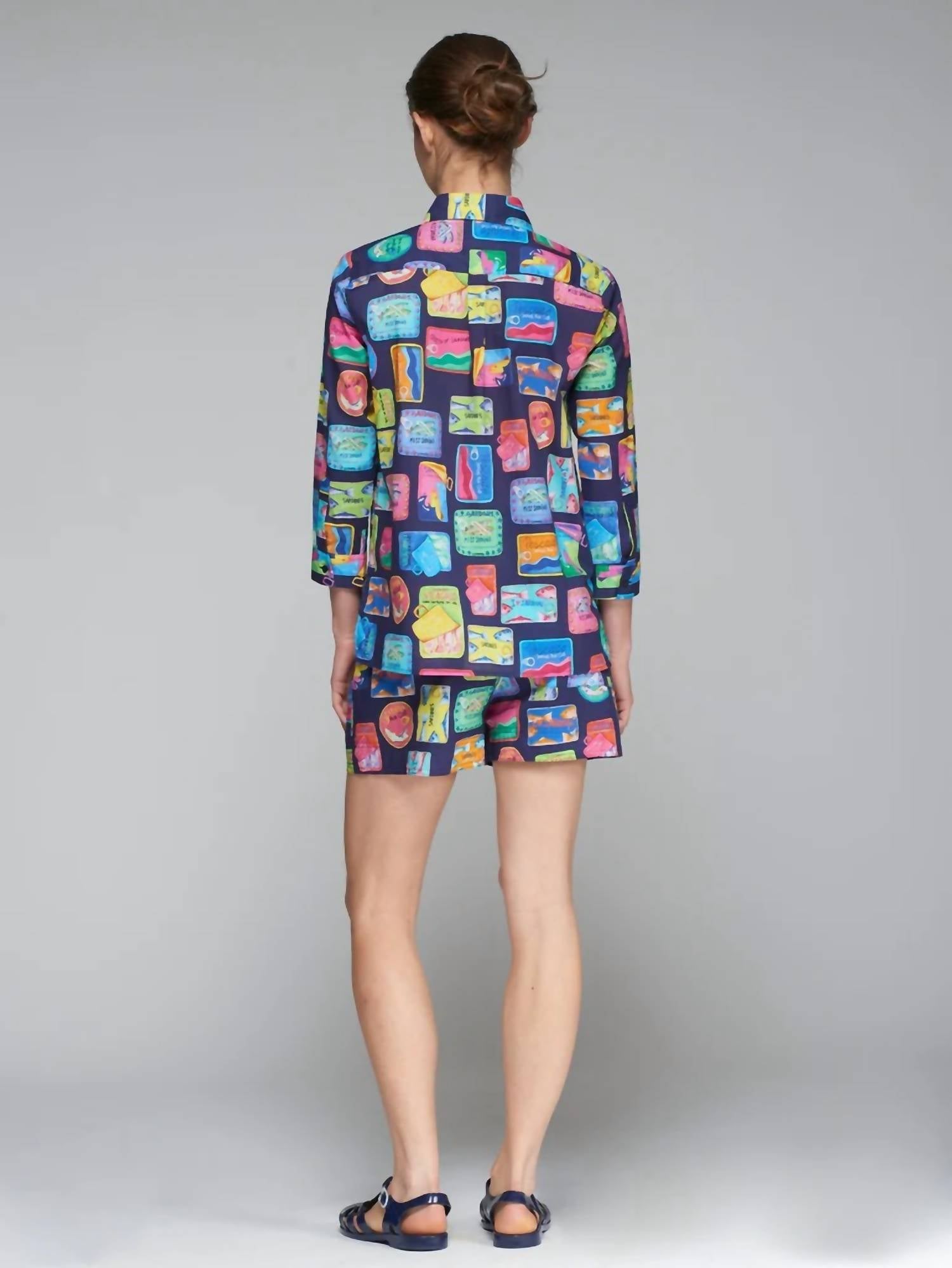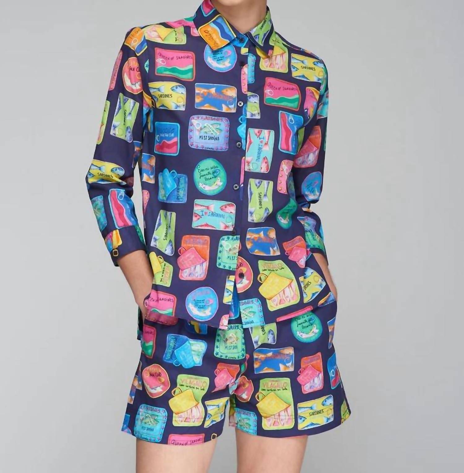The Sardine T-Shirt by Vilagallo brings playful whimsy to your wardrobe with its unique sardine print in navy. Designed for women, this patterned shirt features a classic collar and three-quarter sleeves, making it ideal for casual summer outings or vacation. Made from comfortable cotton, the shirt is both stylish and easy to pair with jeans or shorts. Closure: Button closure.