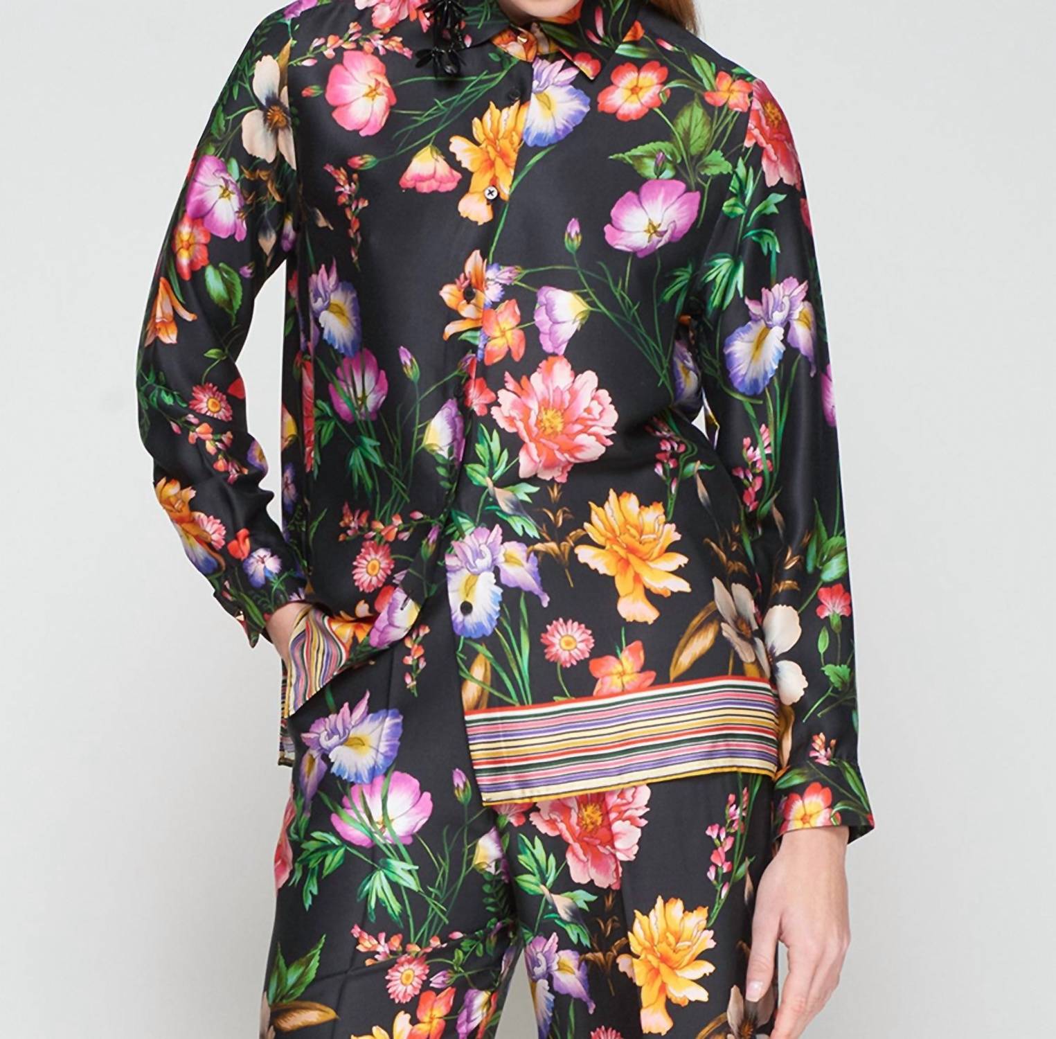Perfectly tailored and soft to the touch. Introducing the Tea Floral Button Down Shirt by Vilagallo, a straight-cut, long-sleeve piece designed for vibrant style. Crafted from 100% viscose, this shirt features a striking multicolour floral print with a horizontal striped trim at the hem, creating a fluid and soft feel. It includes a classic collar and button closure, with buttoned cuffs and a slightly longer back. Care for this exquisite shirt by hand washing and line drying it.