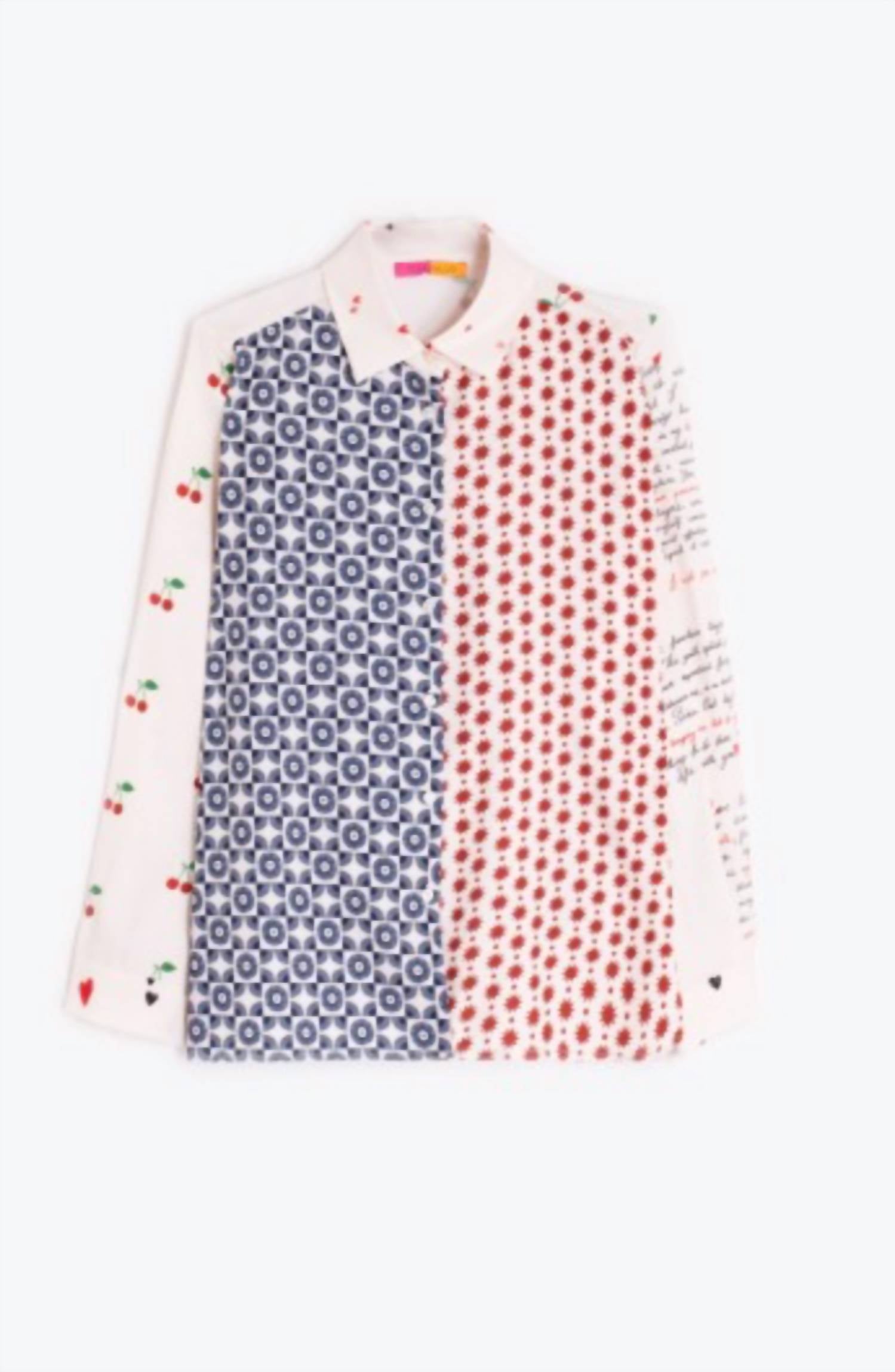 A classic button down shirt that will never go out of style. Straight-cut shirt with classic collar and front button closure. Front features two contrasting geometric prints. One sleeve is printed with cherries and the other with handwriting. The back displays a central heart filled with handwritten text, framed by cherries and a checkered border. Part of the “Love Letters” graphic series.