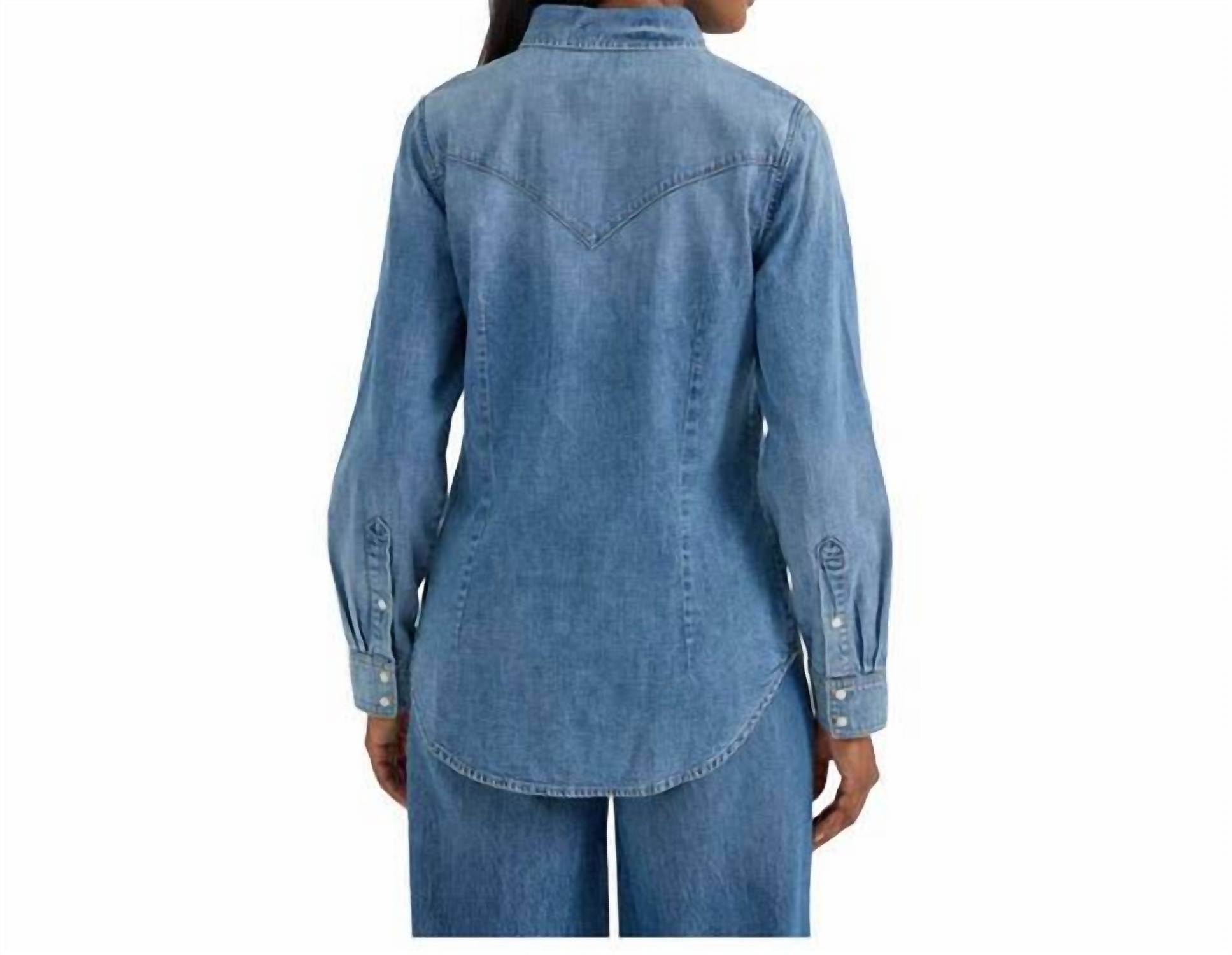 Perfectly tailored and soft to the touch. Introducing the Wrangler Women's Retro Americana Long Sleeve Snap Shirt in a chic Light Wash, perfect for channeling 90s fashion during spring vacations. This denim shirt is crafted from 100% Cotton, ensuring both comfort and breathability. It features a spread collar, long sleeves, and a convenient snap closure on the front, cuffs, and chest pocket. Turn heads with this solid pattern piece, ideal for layering or as a standalone statement.
