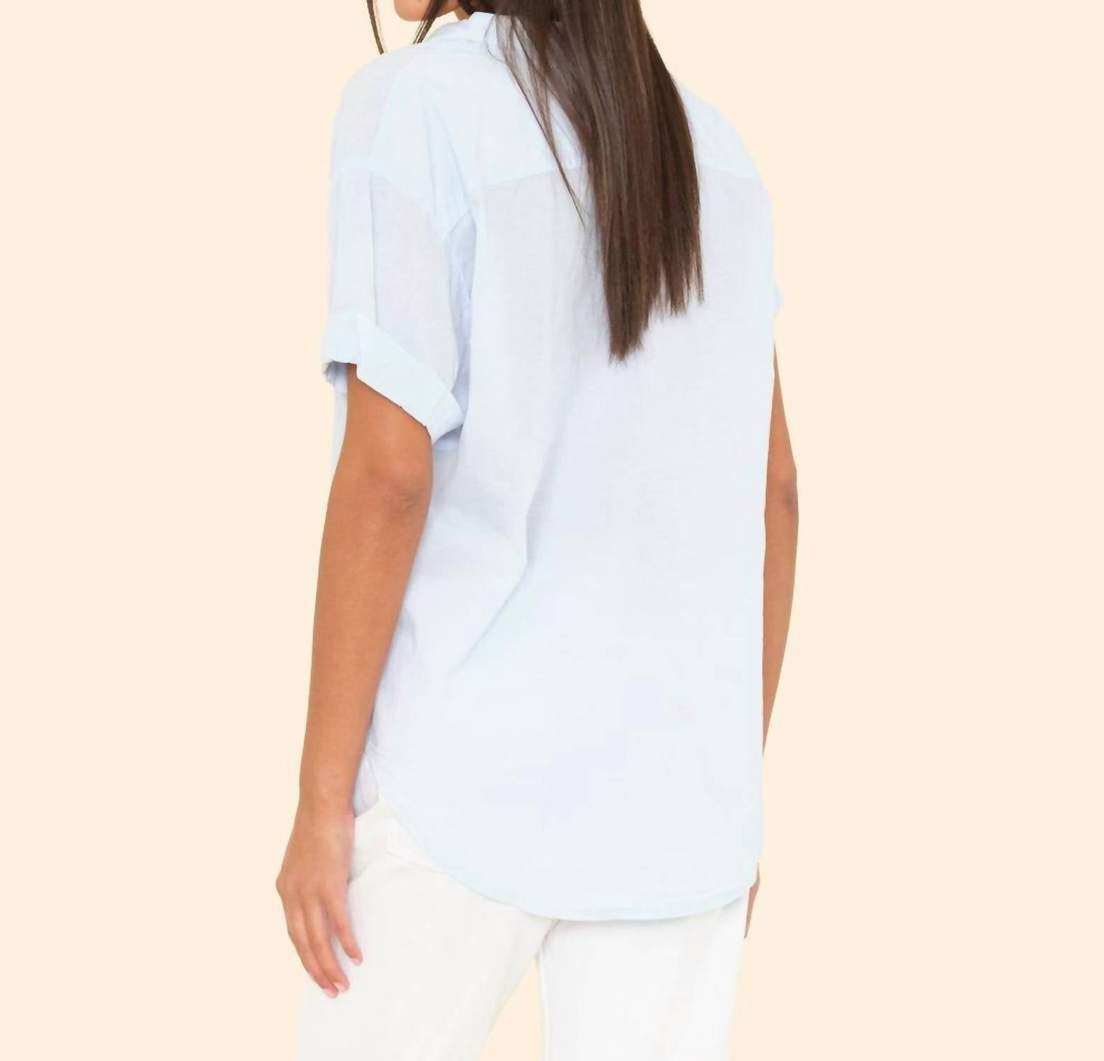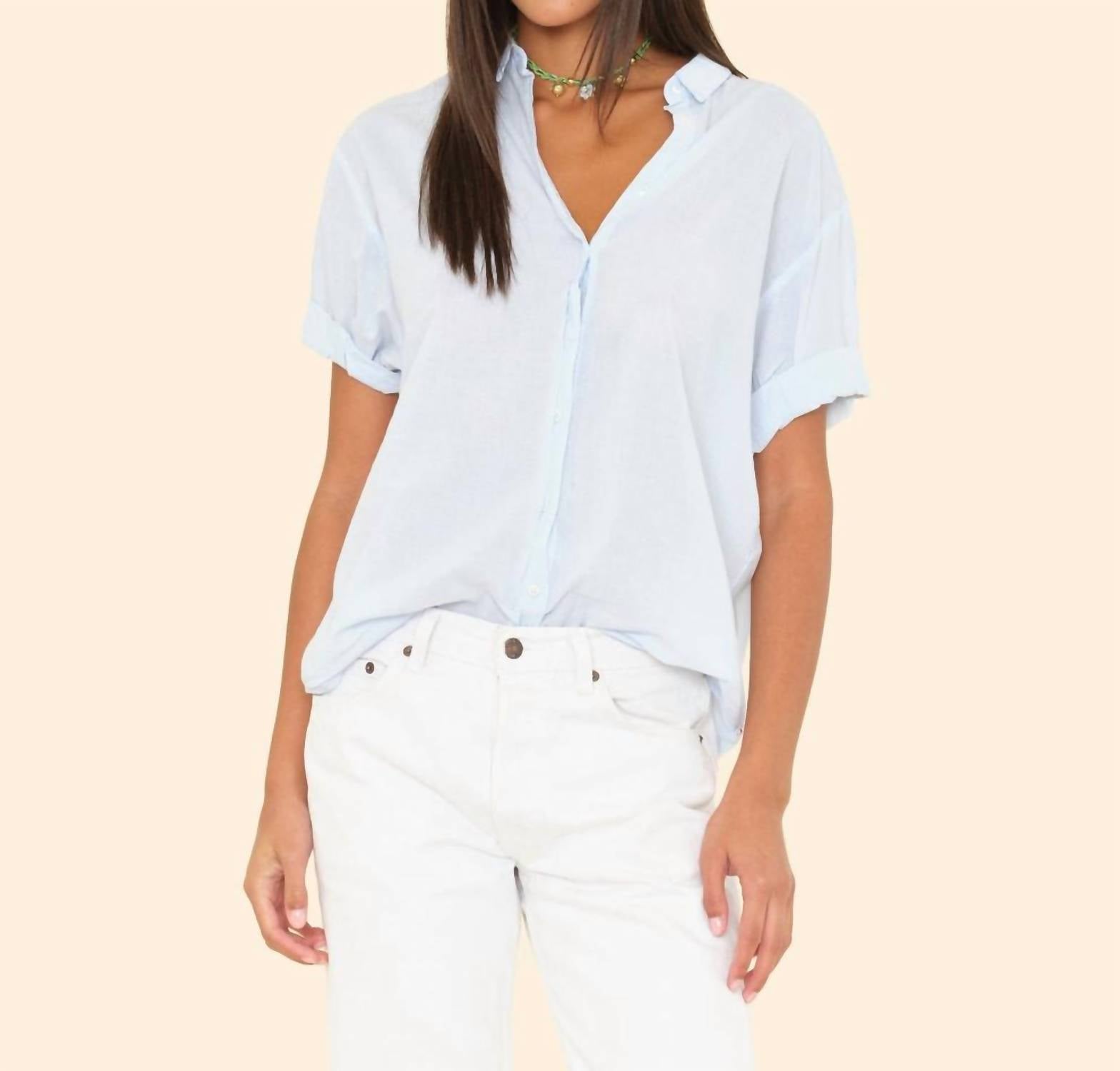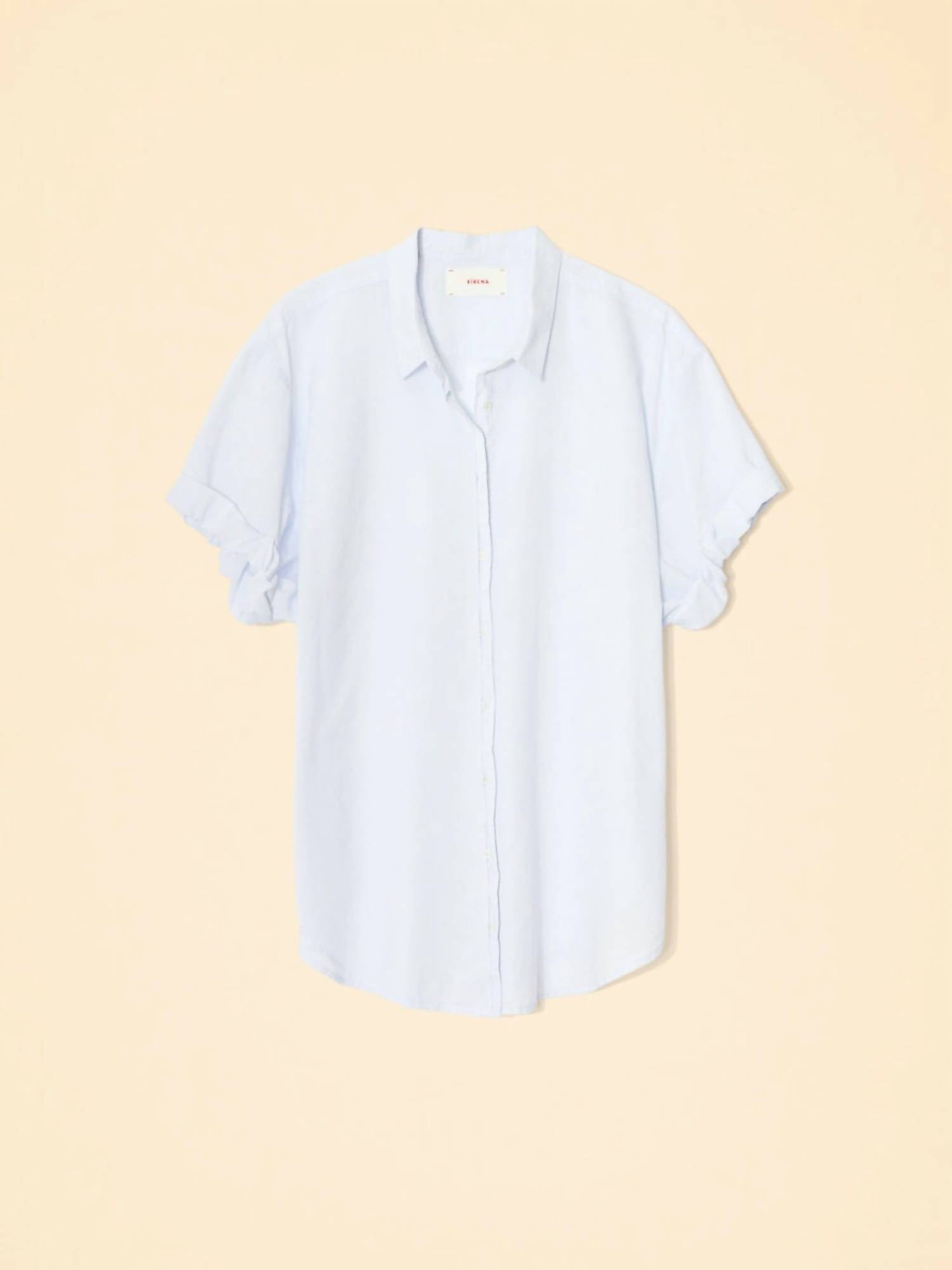 A classic button down shirt that will never go out of style. Elevate your style with the Channing Shirt by XIRENA, an embodiment of minimalist chic in a captivating Skylight hue. Featuring short sleeves and crafted from 100% Cotton Poplin, this USA-made button-down radiates effortless elegance. The solid pattern and collared neckline enhance its sophisticated appeal, making it perfect for summer occasions like holiday parties. Care is a breeze with machine wash cold and gentle tumble dry settings. Model is 5'10" and wears a size Small, ensuring it fits true to size.