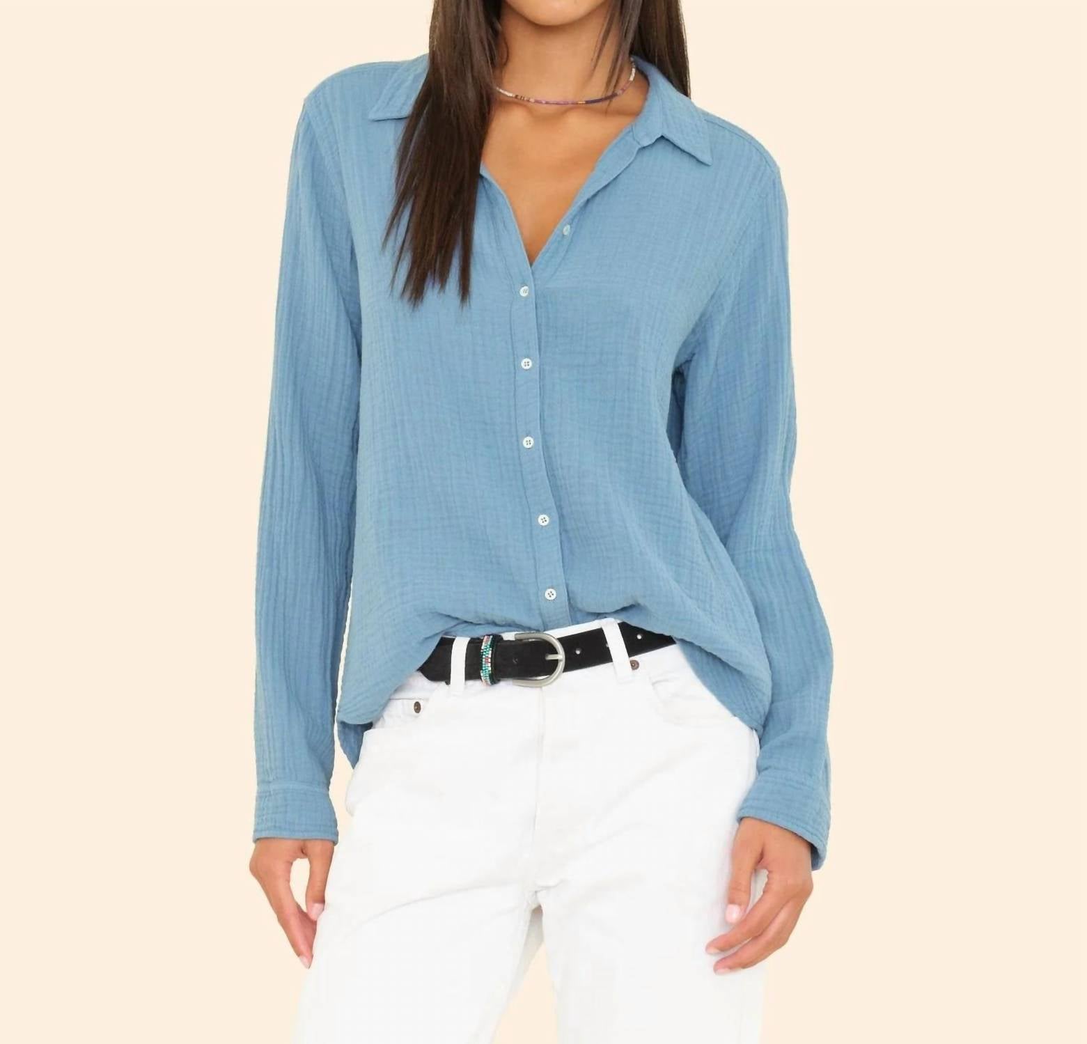 This button down shirt is comfortable yet polished. Introducing the Scout Shirt by XIRENA, a minimalist long sleeve button-front shirt in Harbor Blue perfect for an evening event. Crafted from 100% cotton Chelsea Gauze, this piece is lightweight with a soft, gently crinkled feel and features a classic collar. Made in Los Angeles, it boasts a shirttail hem and box pleated back yoke for a sophisticated silhouette. Care is simple with machine wash on a gentle cycle and hang to dry. Model is 5'10" and wears a size Small.