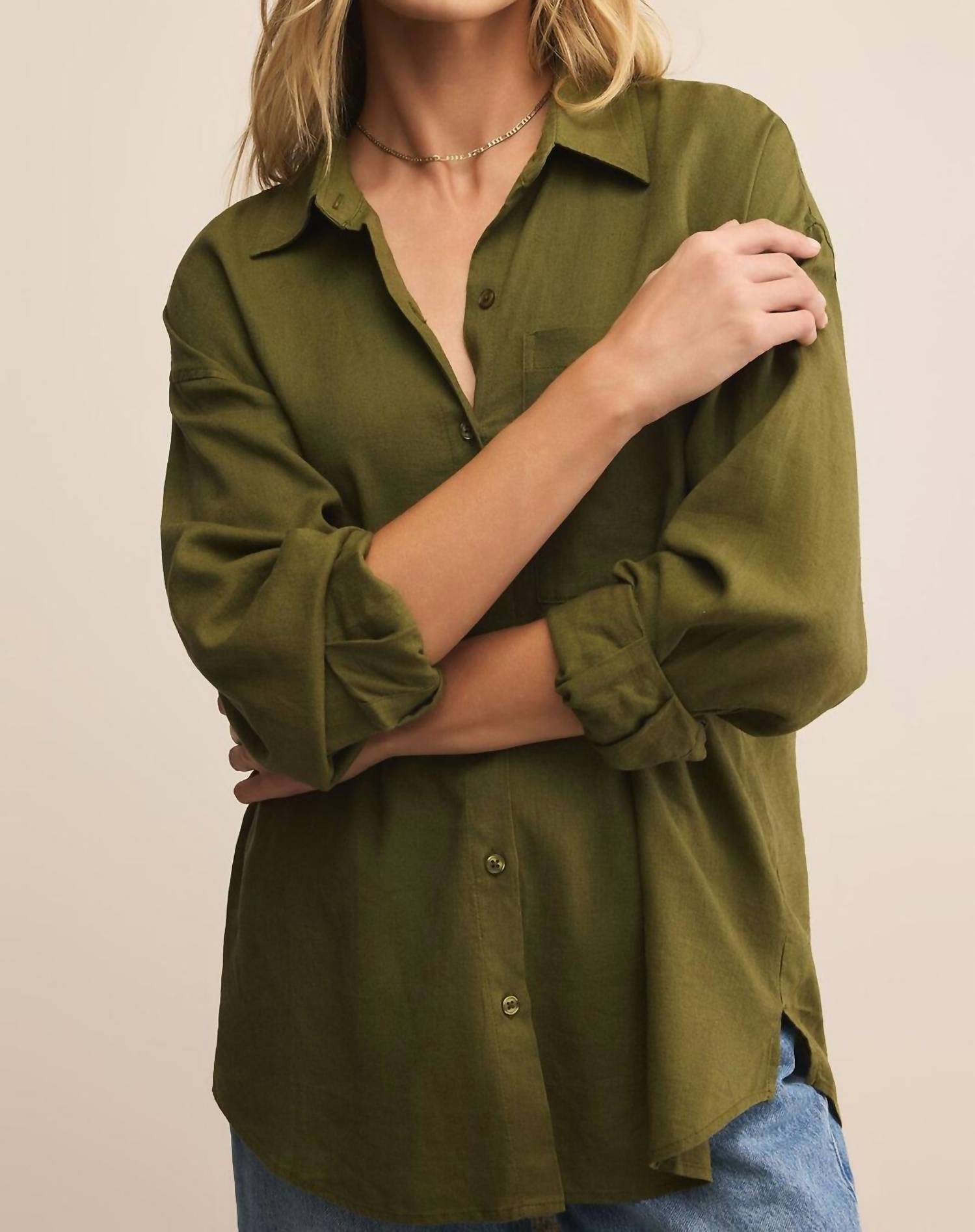 Perfectly tailored and soft to the touch. Discover the relaxed elegance of the Alfie Linen Button-Up Shirt by Z Supply, a refined piece in a soothing green shade. This shirt showcases long sleeves and a relaxed fit, all expertly crafted from a washed linen blend of 55% Linen and 45% Rayon. Designed with a collared neckline, button front closure, and a convenient chest pocket, it offers understated style perfect for summer gatherings. Originating from [Country Not Specified] and featuring midweight construction, it can be easily maintained with machine wash and line dry care instructions.
