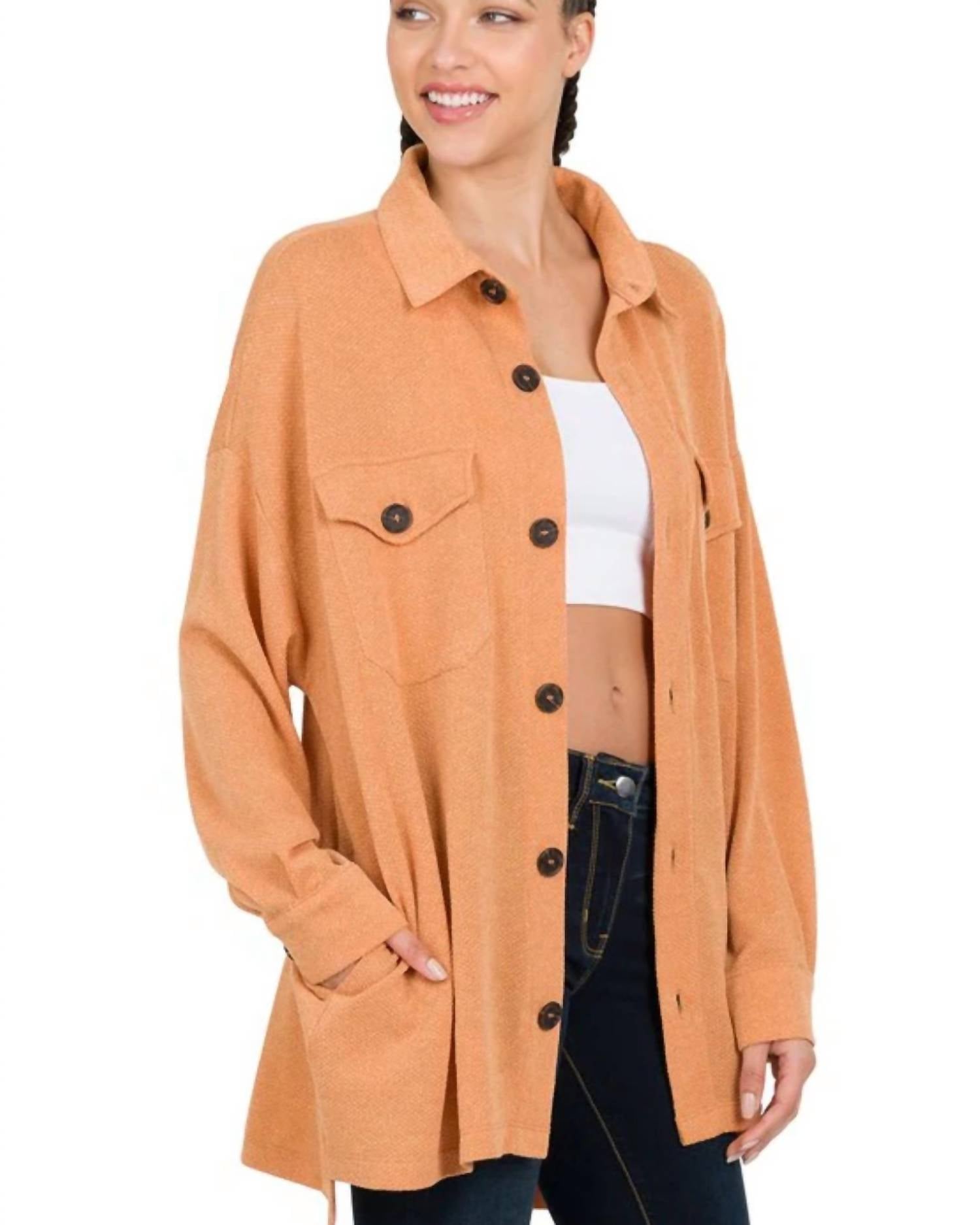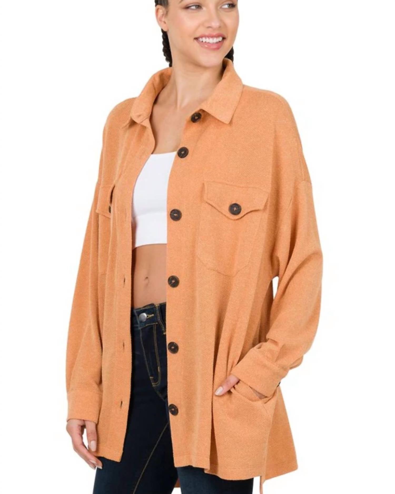 Perfectly tailored and soft to the touch. Introducing the Button Down Shacket by ZENANA, a bold addition to any summer wardrobe in a vibrant Butter Orange. This women's solid, collar-neck shacket is perfect for the maximalist trend, featuring long sleeves for added style. Crafted from a blend of 88% Polyester, 7% Rayon, and 5% Spandex, it offers a comfortable fit with button closure. Care instructions include machine wash and tumble dry.