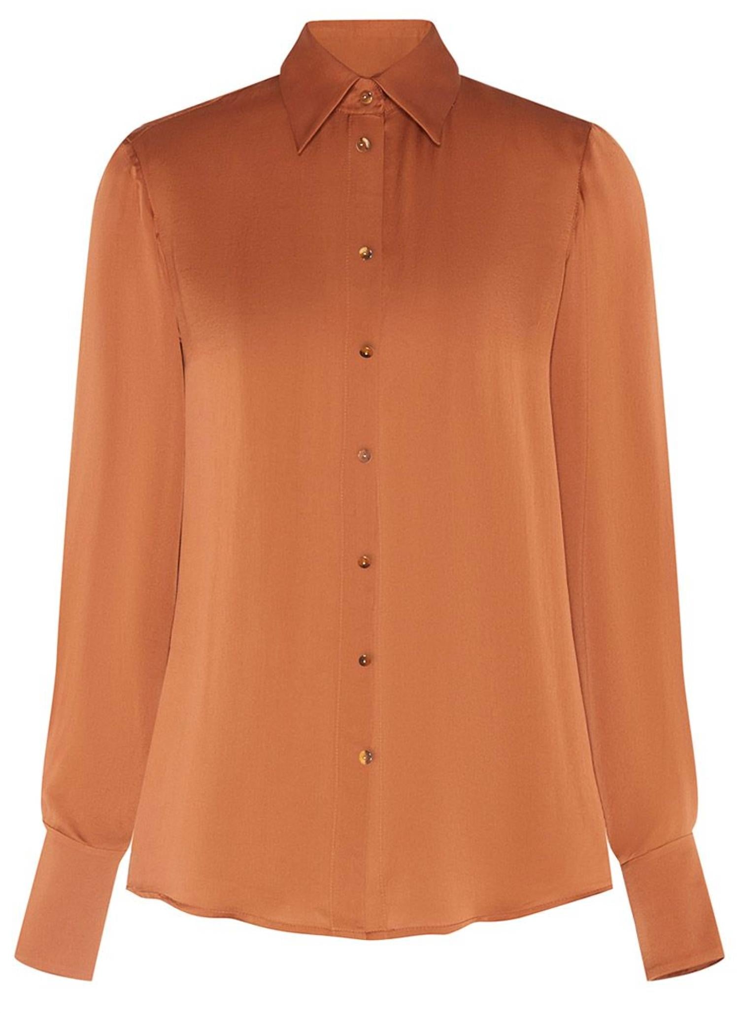 A classic button down shirt that will never go out of style. Elevate your wardrobe with the Zimmermann Women's Hypnotic Satin Shirt in a captivating caramel hue. This minimalist and solid-patterned piece features long sleeves and a classic collar, effortlessly blending sophistication with style. Made from luxurious satin, it boasts a button closure for a polished finish. Care: Hand wash only. Perfect for fall dinner parties or 4th of July celebrations.