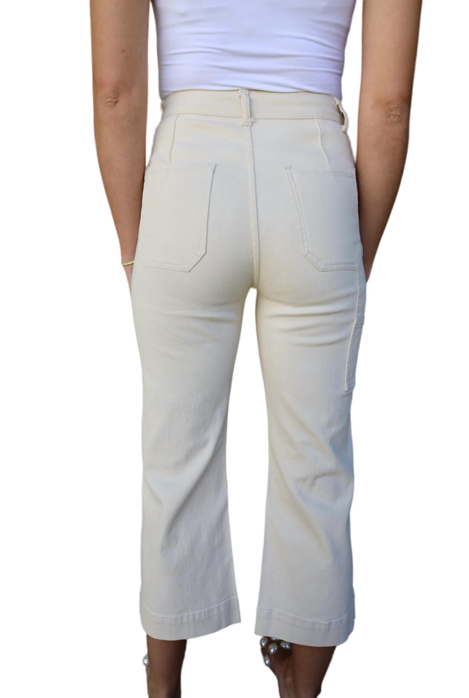 Introducing Claire, our playful cropped cargo pants. Stay stylish and comfortable in these capri pants that will elevate any look. High rise. Belt loops. Functional pockets. Straight fit. 100% Cotton.