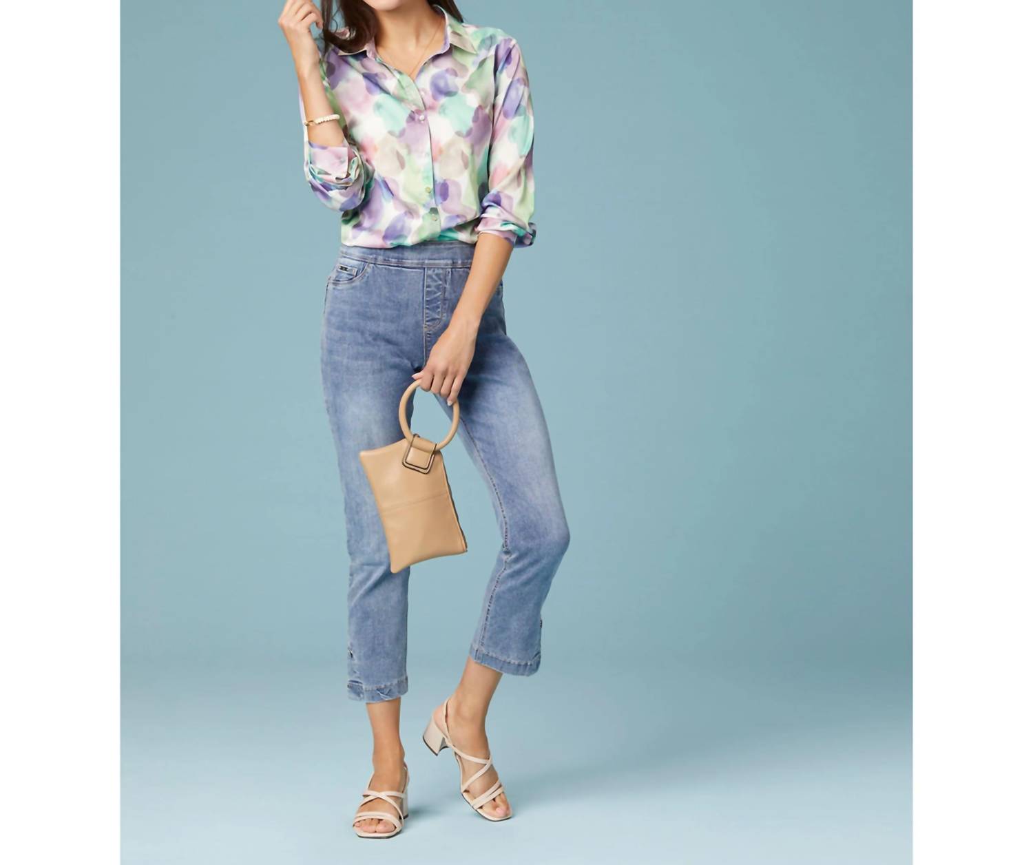 Wear these adorable capri pants with slides or cute flats for an effortlessly cool look. Introducing the OMG Boyfriend Capri Jeans with Side Slit by COCO + CARMEN, the perfect travel companion in a medium denim hue. These capris are crafted from premium denim material and feature a 26-inch inseam with a chic side slit, offering a boyfriend fit and high-rise skinny leg style. Designed for comfort, they include a built-in tummy-slimming elastic waistband for a smooth, flattering silhouette and pull-on closure for easy wear. The composition includes Cotton, Polyester, and Spandex, and they are machine washable for effortless care.