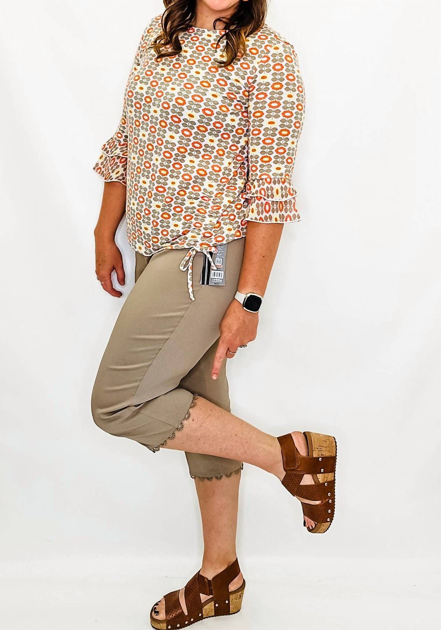 Wear these adorable capri pants with slides or cute flats for an effortlessly cool look. Discover the Pull-on Capri Pant With Lace Edging by Multiples, designed for style and comfort in a chic stone hue. These slim-fit, high-rise capris are crafted from a blend of 76% rayon, 21% nylon, and 3% spandex for a perfect custom fit, enhanced with shape recovery technology. The pull-on design features a flexible tummy control panel that effortlessly smooths the tummy, thighs, and rear. Care: Machine wash cold with like colors and line dry. Ali is wearing a size 12.