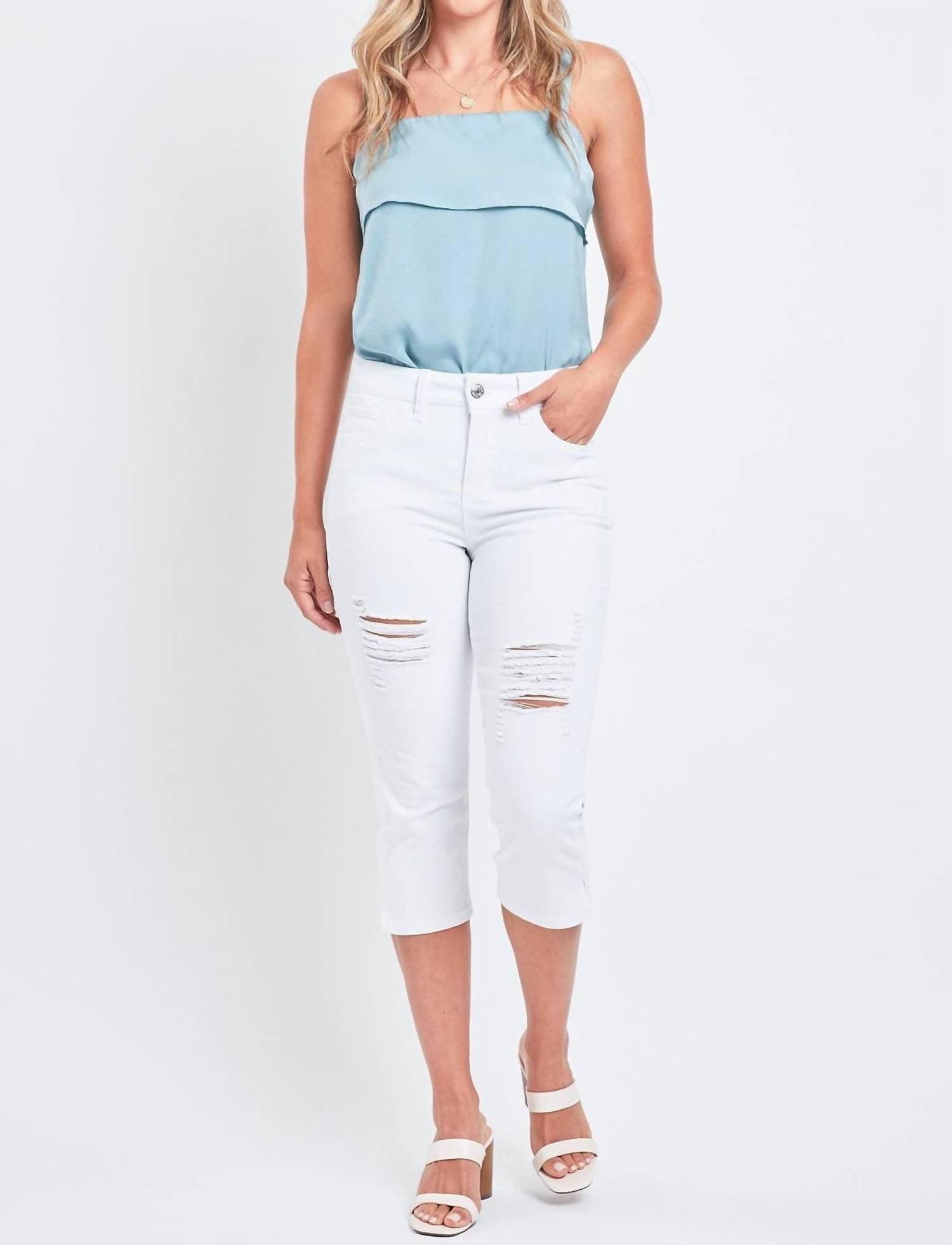 Elevate your summer wardrobe with YMI's Women's Curvy High Rise Side Slit Hem Capri Pants in white. Designed with a cropped length and side-slit hems, these pants feature a high-rise fit with a 1-button zip closure, 5-pocket construction, and light distressing for an edgy touch. Constructed from a cotton blend of 98% Cotton and 2% Spandex, the capris offer comfort and style with an inseam of 21 inches and a 15.5-inch leg opening in size 8, while providing a rise of 11 inches. Care is simple with machine wash cold and line dry instructions, making these capris a practical and chic choice for any summer outing.