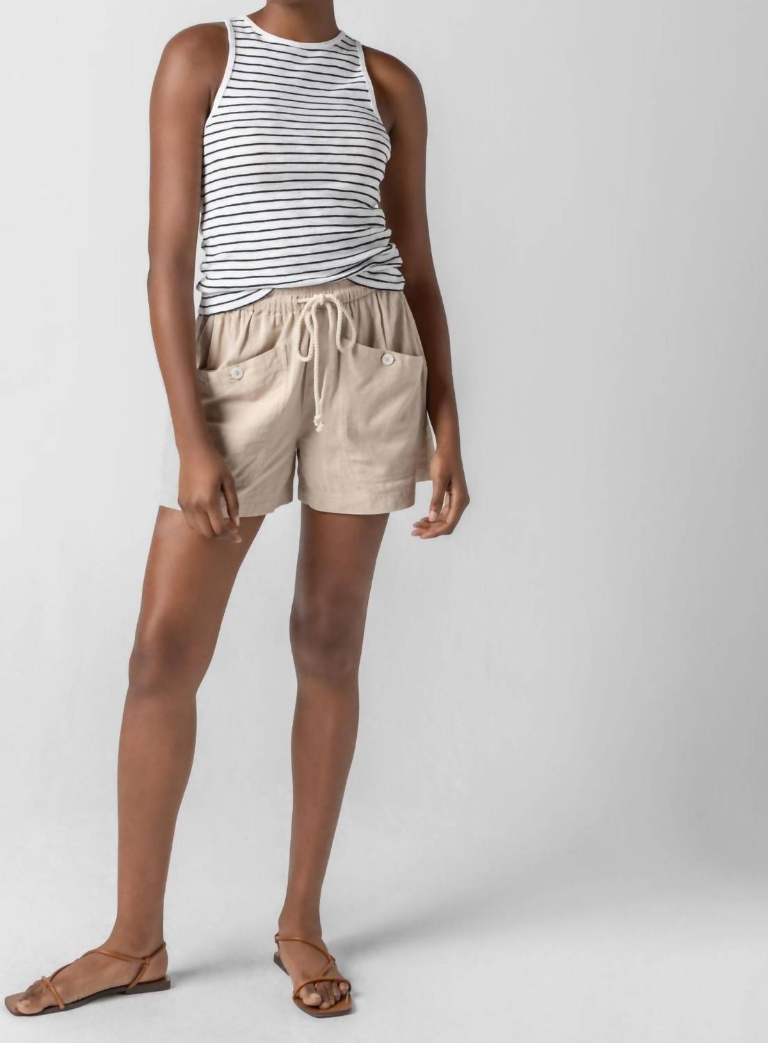 Match these cargo shorts with your favorite tank or tee for the perfect laid-back look. Embrace effortless summer style with the Women's Patch Pocket Shorts by Lilla P in the chic Flax hue. Crafted from Air Textured Cotton and made entirely of 100% cotton, these shorts feature a 4.25" inseam for a classic fit, making them an ideal choice for vacations or casual outings. The elastic waistband with a natural rope drawstring offers exceptional comfort, bolstered by thoughtful design elements like slanted front and back patch pockets. Machine wash cold with like colors, tumble dry low, and cool iron if needed.