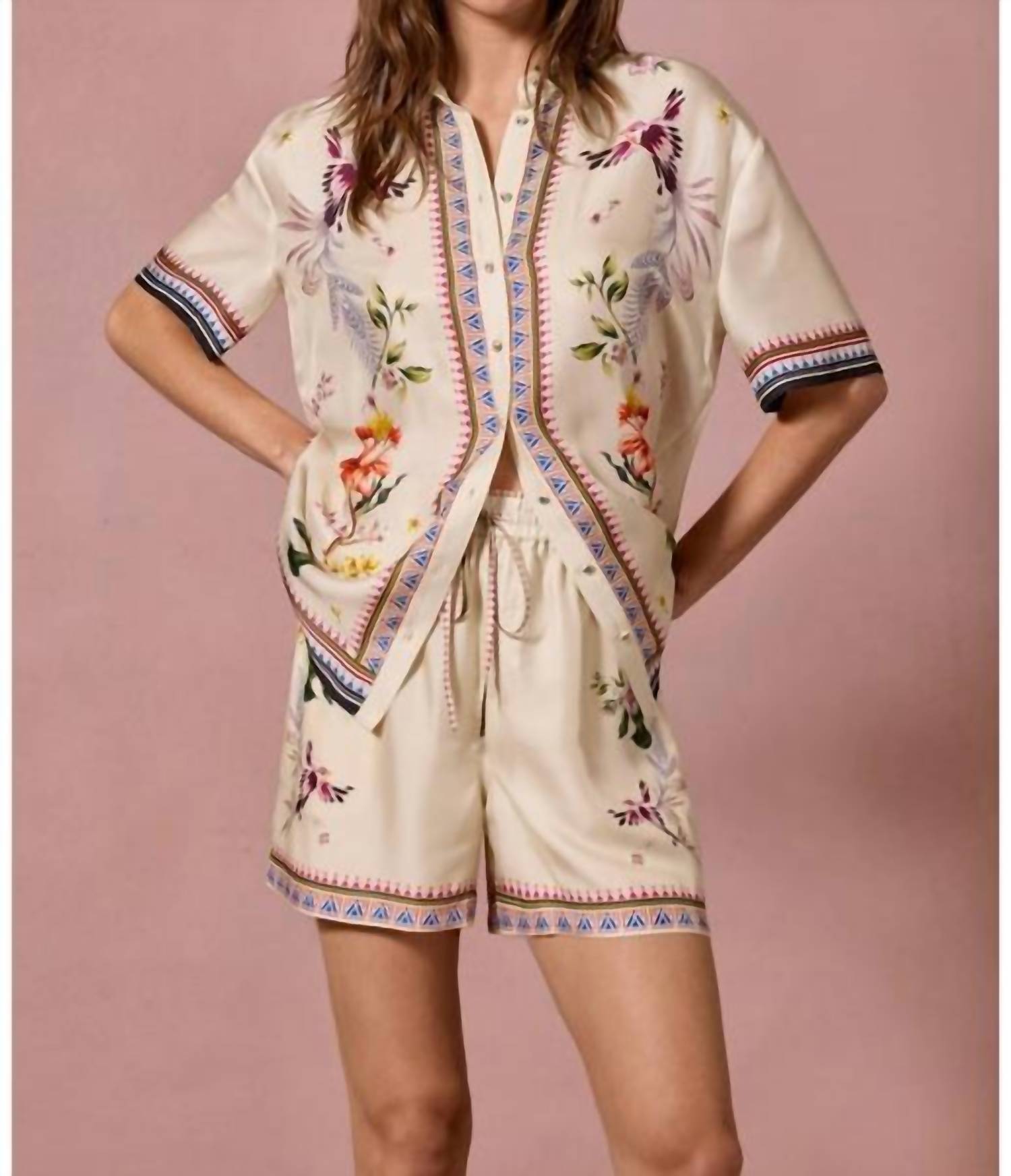 Match these cargo shorts with your favorite tank or tee for the perfect laid-back look. The Mayvis Pull-On Shorts are crafted from a distinctive silk blend, resulting in a feminine appearance with a touch of whimsy. They feature an elastic waistband with a ruffled detail and a drawcord for added comfort. Adorned with bold floral designs and a contrasting border at the hemline, these beautiful shorts can be paired with a vibrant silk cami and espadrille heels for a chic, resort-ready daytime look.
