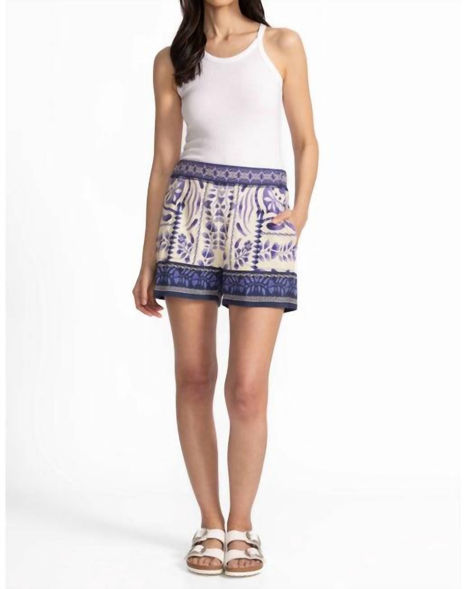 Match these cargo shorts with your favorite tank or tee for the perfect laid-back look. Ornately embellished with a vibrant blue pattern, the Starling Easy Shorts offer a fresh take on casual wear. Crafted from a rich cotton blend with a hint of stretch, these brilliant shorts offer an elastic waist and are finished with a contrasting waist and hemline. Machine Wash