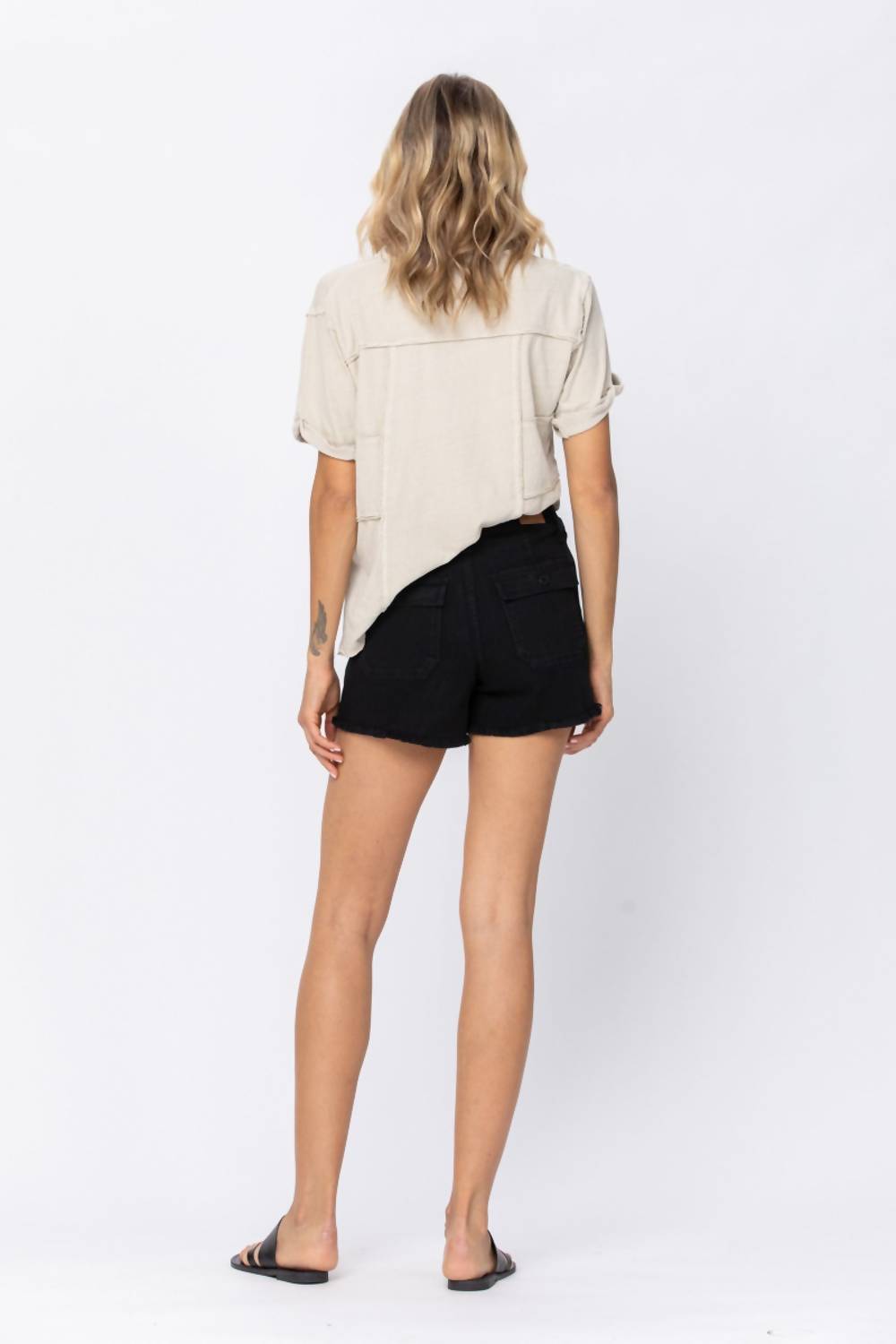Introducing the Judy Blue Cargo Patch Pocket Shorts, a stylish essential for any casual wardrobe. These black, solid-patterned shorts feature a convenient zip closure and ample pockets. Crafted from a comfortable blend of 47% Cotton, 28% Rayon, 15% Polyester, 8% ZT800, and 2% Lycra, they offer durability and a touch of stretch. Designed with a rise of 10" and an inseam of 4", these shorts combine practicality with style effortlessly.
