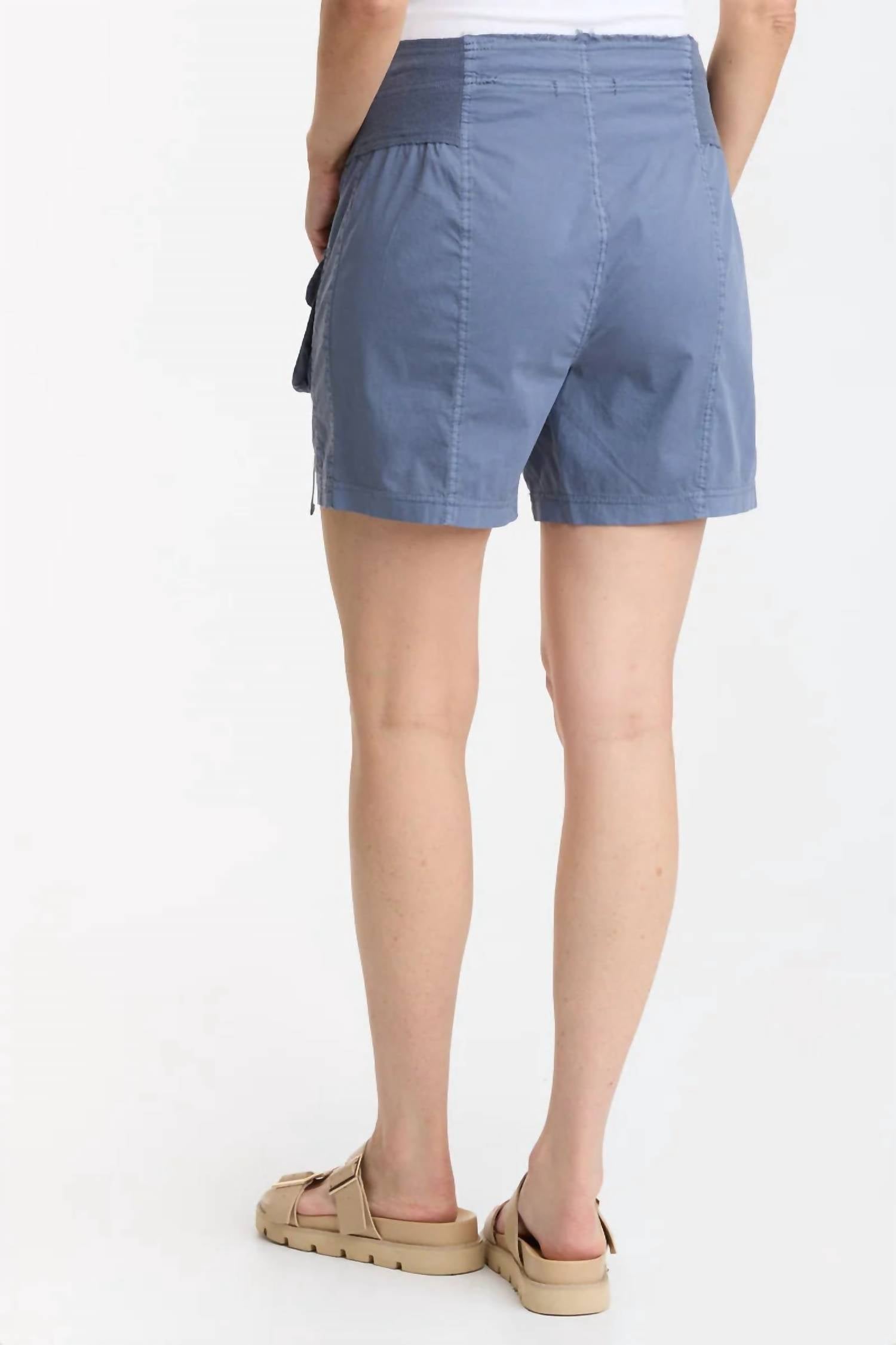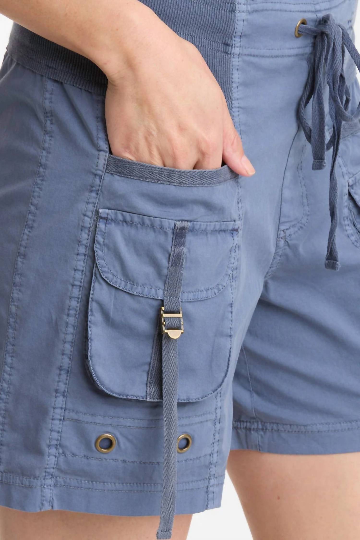 Comfortable and cute, these cargo shorts will be in heavy rotation this season. Introducing the Felix Short by XCVI, a chic addition to any wardrobe in a captivating hypnotic pigment. These shorts boast a 6" inseam and offer a comfortable drawstring pull-on closure, crafted from a cotton blend poplin with a raw-edge contrasting ribbed waistband for added flair. Enjoy the convenience of cargo pockets equipped with ladder lock buckles, making it both functional and stylish. This imported piece is machine washable, perfect for effortless care and maintenance. Monique is wearing size Small. Height: 5'10" | Bust: 34B | Waist: 26" | Hip: 37".