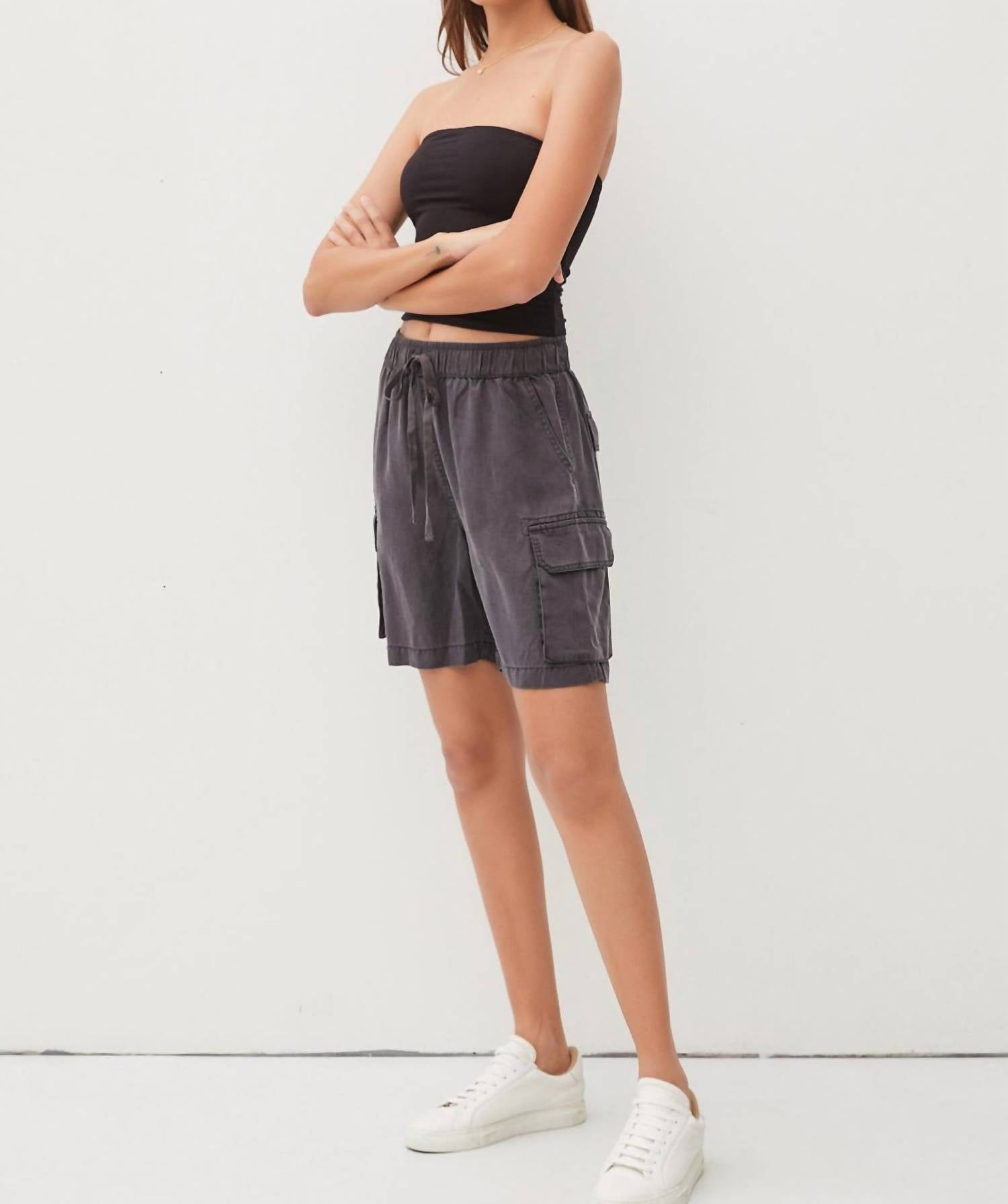 The cargo trend is here to stay and we especially love the short version of these. Embrace effortless summer style with Be Cool's Dara Cargo Shorts in charcoal, designed for both comfort and practicality. These shorts feature a high rise and a pull-on closure for an easy fit, boasting a 100% Lyocell composition that ensures a soft touch. With a 6 3/4" short rise and an 11 5/8" inseam, they offer a breezy yet fashionable option for warm weather and travel, thanks to their less wrinkle material. Convenient cargo pockets add functionality, making these solid shorts a trendy Y2K-inspired choice for spring occasions. Care: Machine wash and tumble dry.