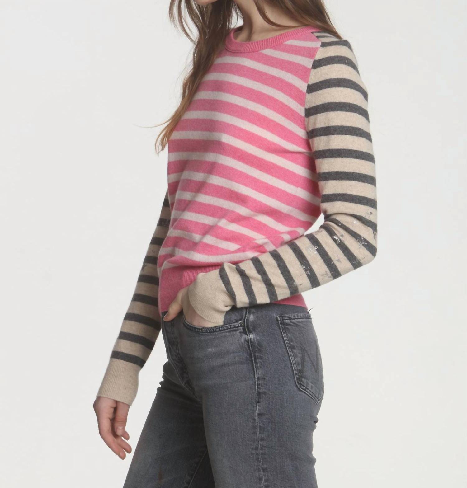 Mixed stripe saddle shoulder crew with faded metallic stars faintly printed on the sleeve. Long sleeve. Model is 5'9, wearing size small. Slim fit. 100% Cashmere. Hand wash or dry clean.