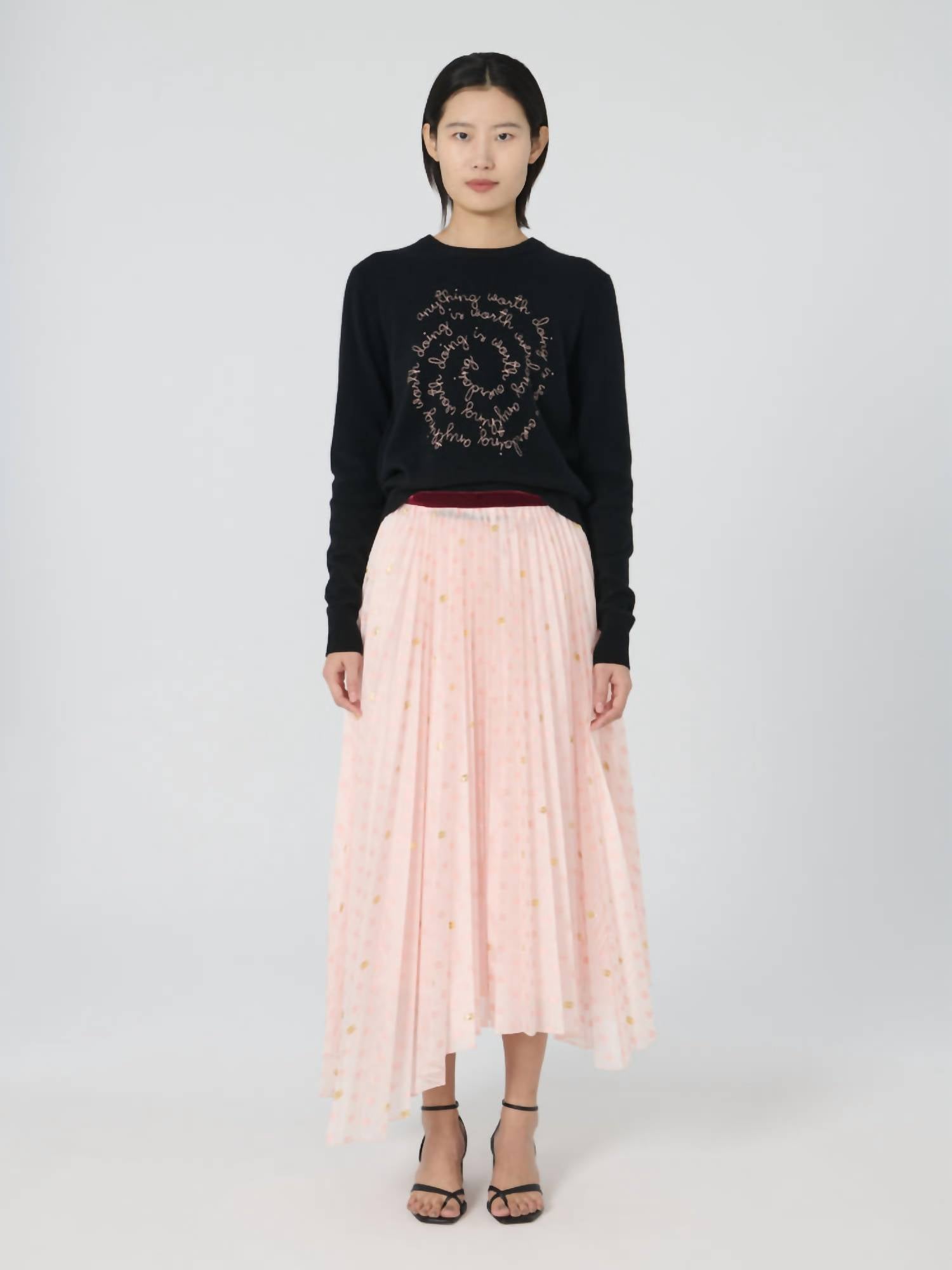 The ultimate go-to sweater, expertly crafted to provide the perfect combination of warmth and style. Its classic design and soft fabric make it a must-have addition to your wardrobe. Elevate your wardrobe with the Worth Overdoing Crew Sweater by Lingua Franca, a tribute to Mick Jagger with his renowned quote delicately embroidered. Crafted from 100% cashmere, this classic fit sweater embodies sophistication and comfort, perfect for minimalist style enthusiasts. The elegant spiral pattern embellishment is made of 100% cotton, making it a unique piece for a dinner party this spring. Care for this exquisite garment by machine washing and laying it flat to dry. Model is wearing a size small, showcasing its timeless appeal in black.